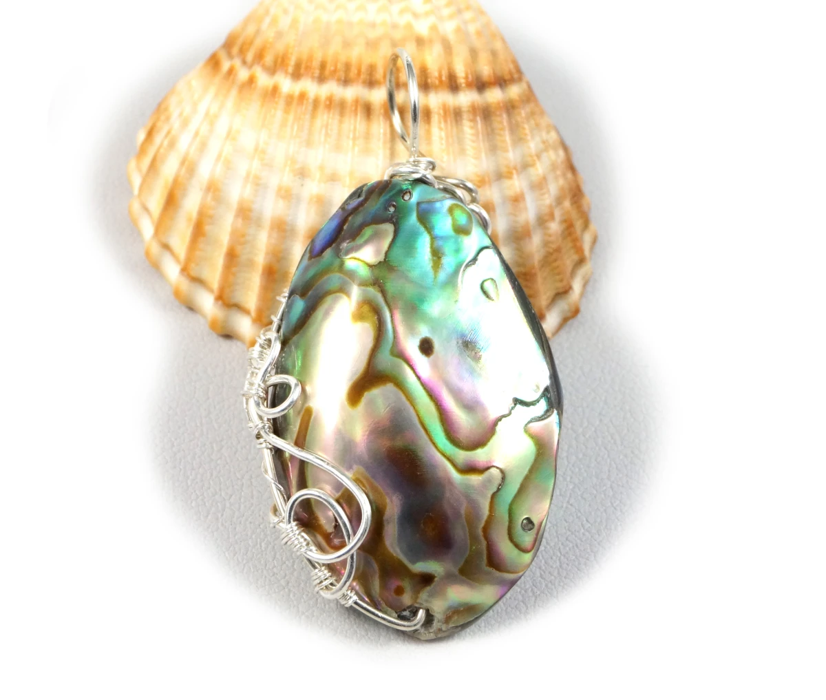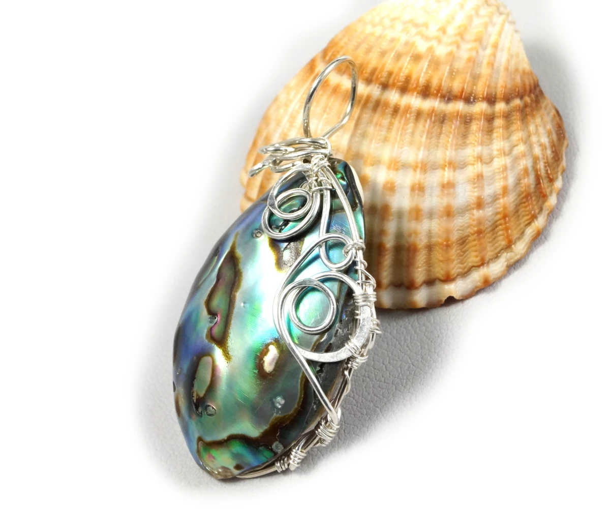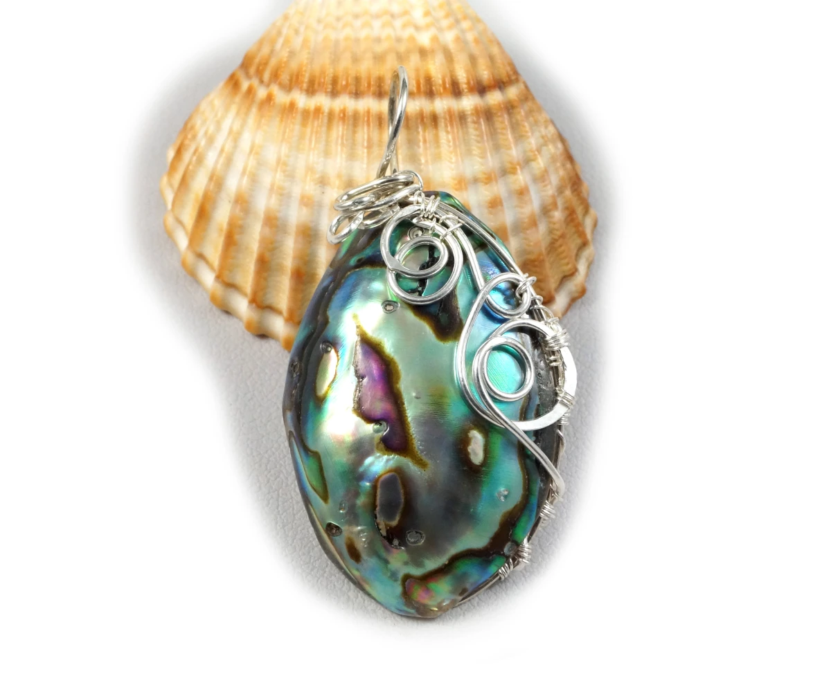 Niepowtarzalny, misternie pleciony wisior z muszlą abalone.