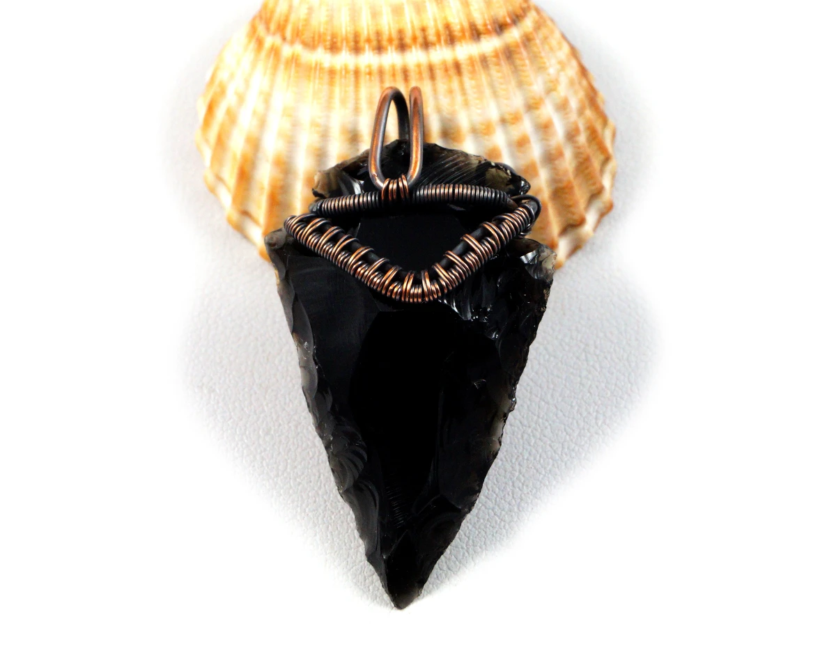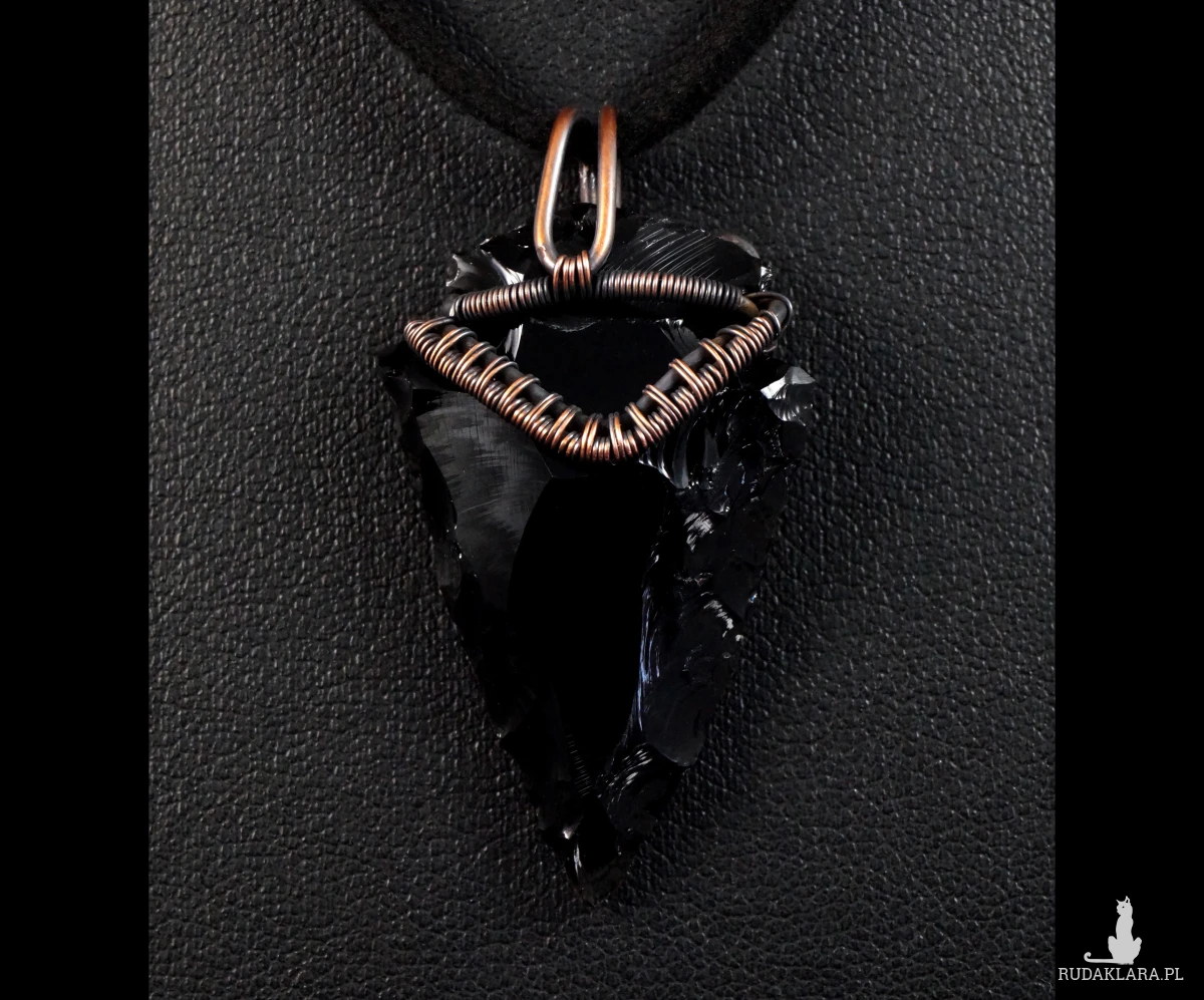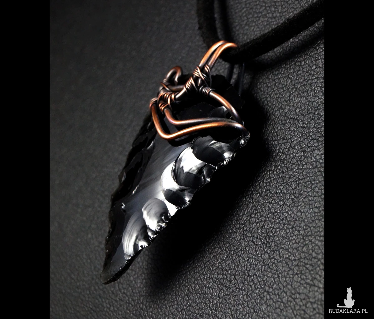 Bajeczny, misternie pleciony wisior z obsydianem (smocze szkło) w kształcie grotu.