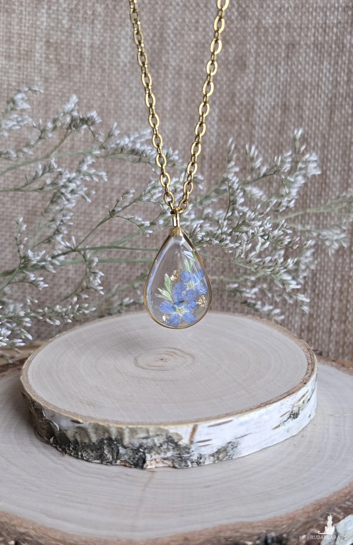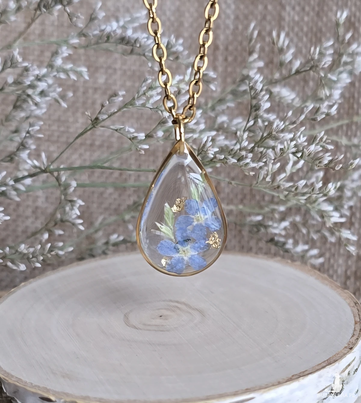 Oferuję Państwu unikalną biżuterię. Zawieszka jest wykonana z suszonych kwiatów i żywicy epoksydowej. Biżuteria jest wspaniałym i oryginalnym prezentem na lata.