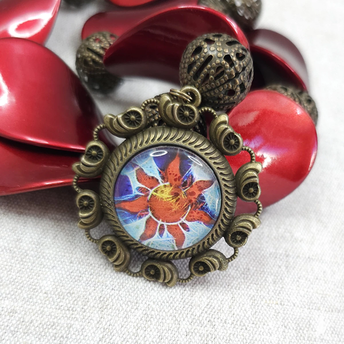 Naszyjnik wykonany z dużych, platerowanych korali (45 mm), metalowych, ażurowych korali (14mm) i fragmentu rysunku mojego autorstwa ukrytego za szkłem w wisiorku.