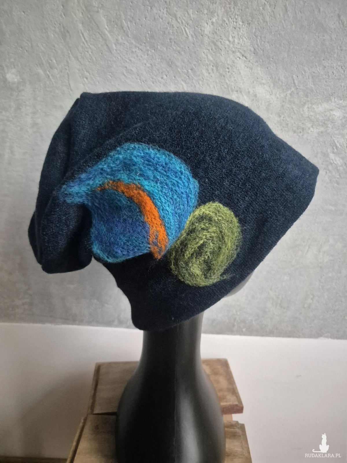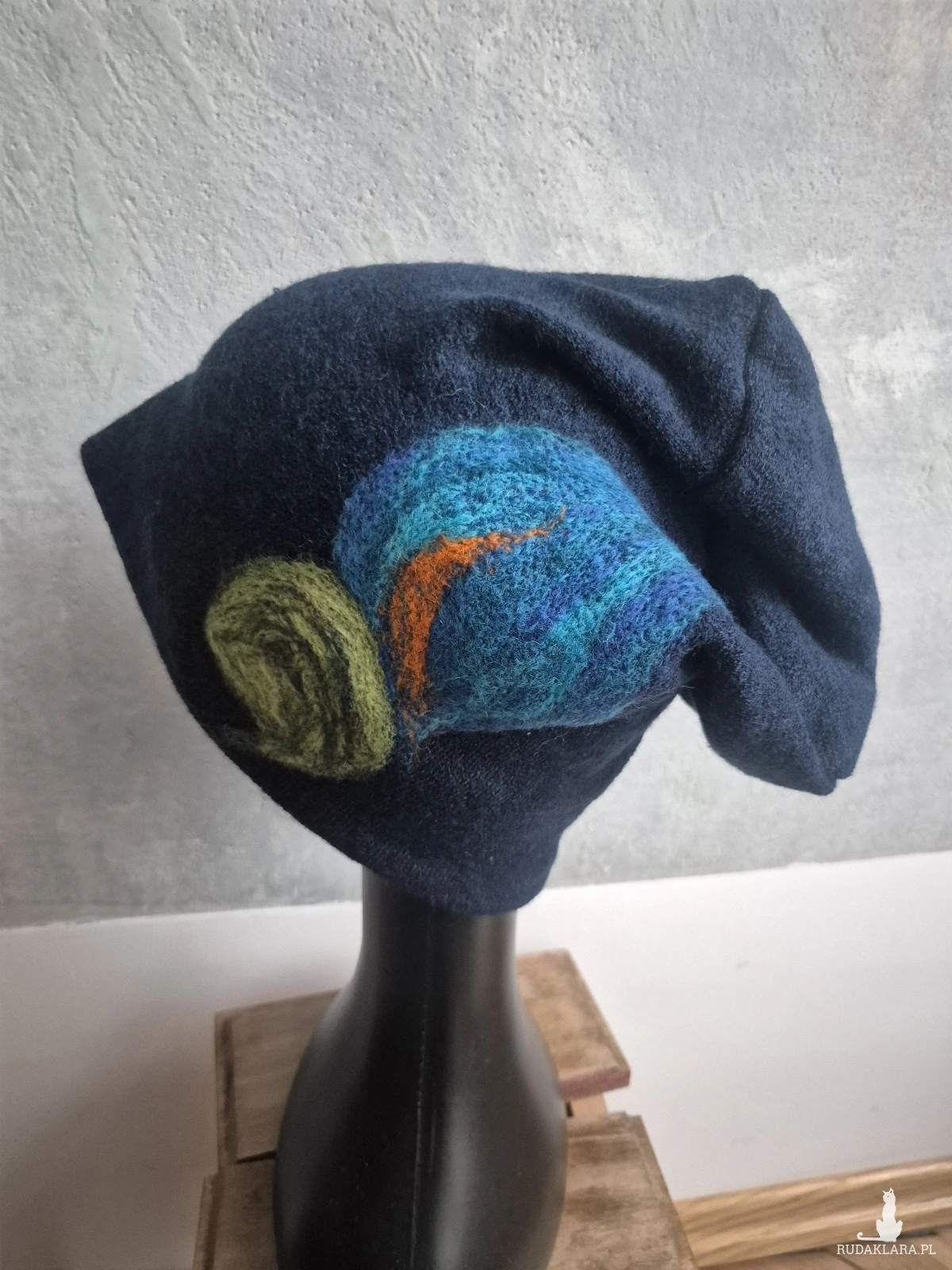 czapka wełniana filcowana zimowa granatowa handmade w kwiaty na podszewce, motyw z dwóch stron taki sam-- rozmiar uniwersalny, wełniana, filcowana wełną merynosów, bardzo ciepła, fantastyczna, miła, miękko układa się na głowie, niesamowicie zwraca uwagę, doskonałą na codzienne noszenie jak i na prezent, zawsze możesz ją założyć po basenie i przeżyjesz,box a1