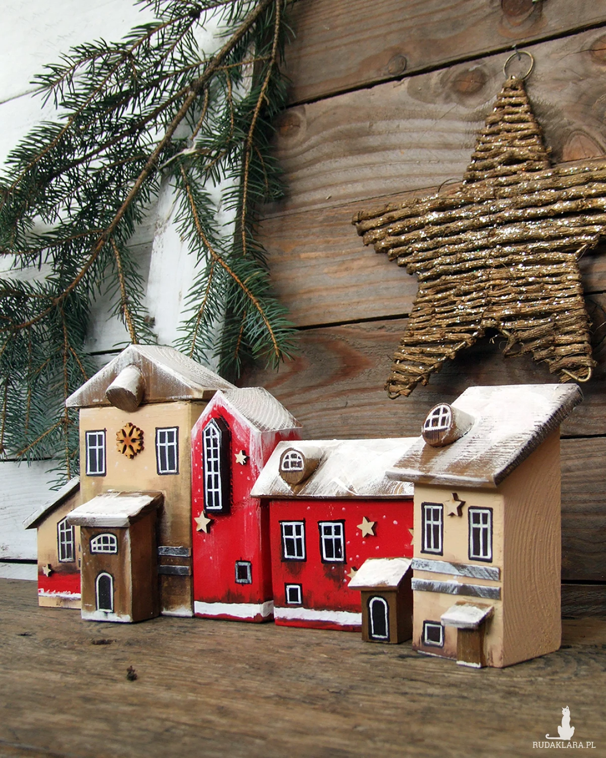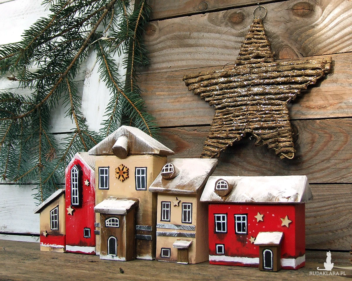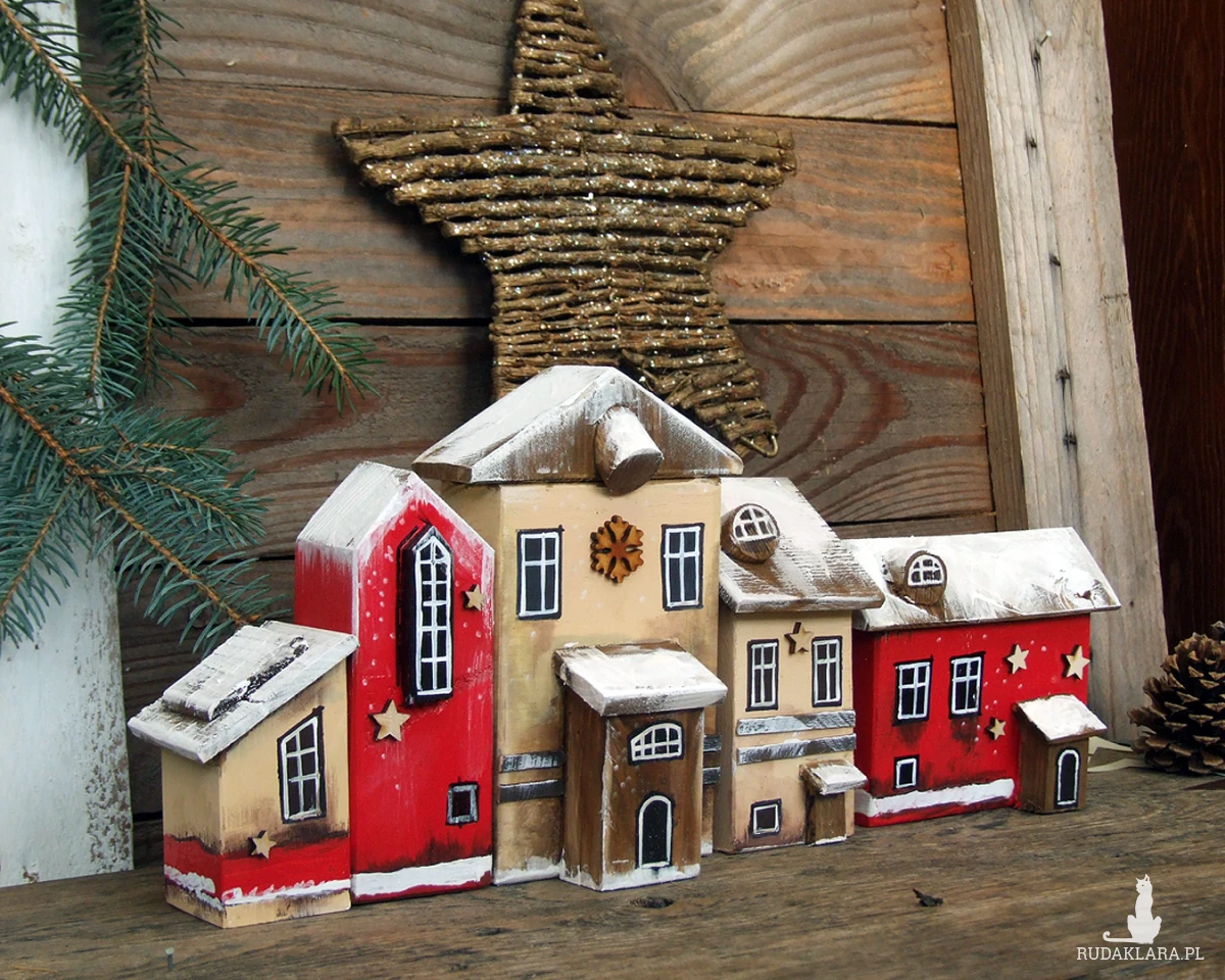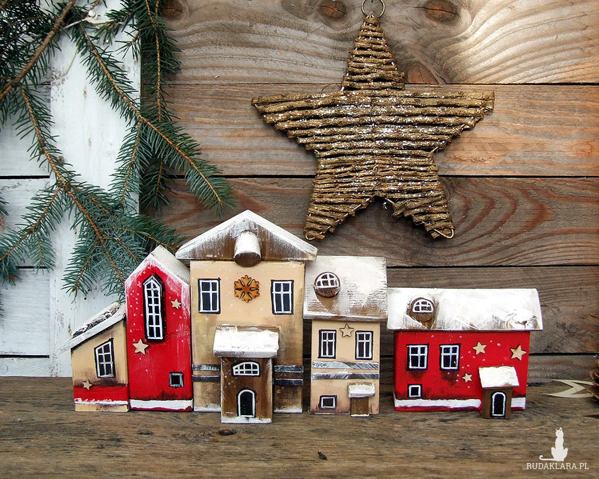 Pięć drewnianych domków, ręcznie malowanych - dekoracja w zimowym świątecznym klimacie, do aranżacji wnętrza, także jako dodatek do stroików. Domki będą także pięknym prezentem, dla bliskich kochających rękodzieło, drewno i naturalne dodatki do domu.