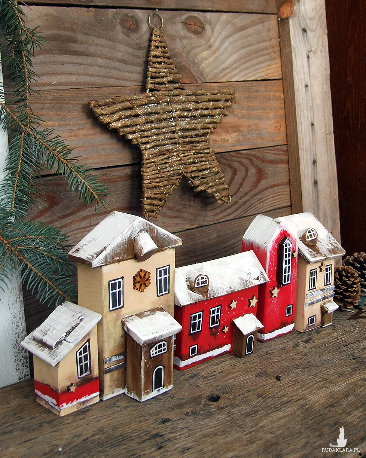 Domki ustawiamy obok siebie lub osobno, jako pojedyncze dekoracje. Wykonane są z drewna sosnowego, malowane farbami akrylowymi i lakierem akrylowym, matowym. Dodatkowe elementy to dooklejone, małe gwiazdki.