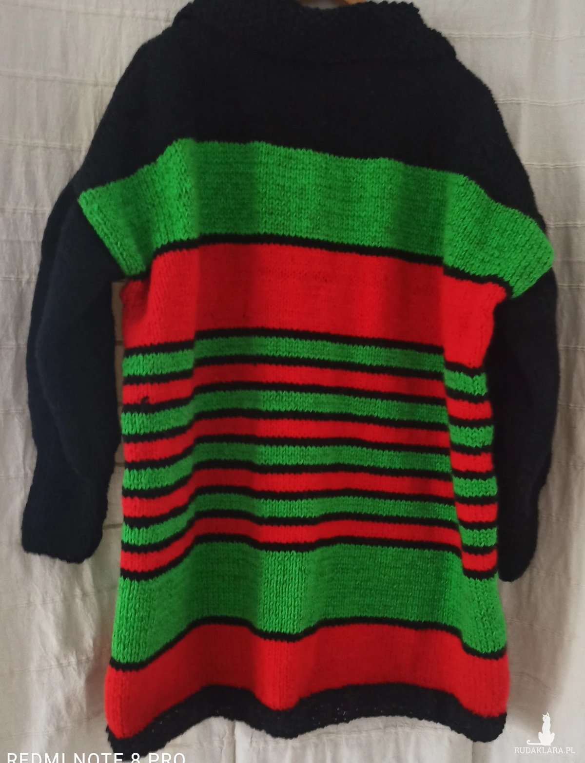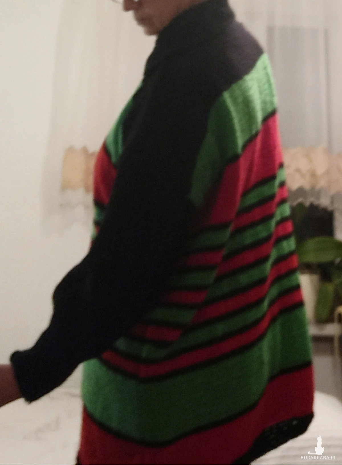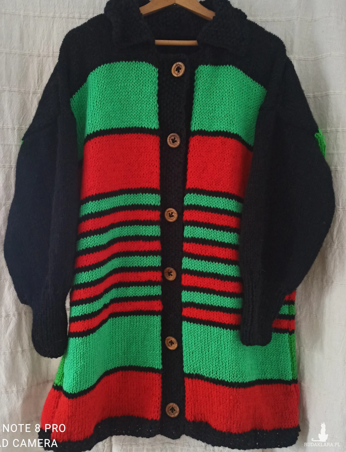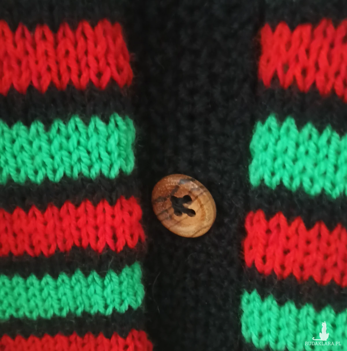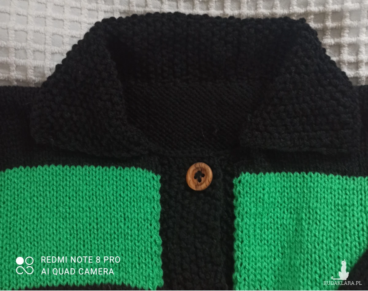 Kardigan z kołnierzykiem , oversize, w świątecznych barwach: zieleń/dwa odcienie/, czerwień, czerń. Wykonany na drutach kolory umieszczone w paskach. Nici użyte do jego zrobienia to wełna Piongouin Pingofrance oraz Schachenmayr z domieszką akrylu wykonany z różnych nowych nici typu: Schachenmayr . Jest miękki i przyjemny w dotyku, zapewnia odpowiednią przewiewność. Zieleń i czerwień zamyka czerń w plisce, kołnierzyku, rękawach robione pojedynczym ryżem. Kolory ujęte w pasy świetnie ze sobą współgrają. Średnia grubość. Rękawy ze ściągaczem 1 oczko prawe, jedno oczko lewe /dosyć wysoki, można wywijać/. Przy ściągaczu długości 13 cm rękaw rozszerza się do 46 cm. Pliska robiona łącznie niedoszywana. Zapinany na 6 oryginalnych drewnianych guzików typu vinted. Ciepły, baaardzo obszerny, opadające ramiona, do noszenia również z paskiem wygląda super. Dobrze trzyma temperaturę ze względu na zastosowane nici i formę. Powinien znaleźć się w szafie każdej kobiety, ponieważ można z nim stworzyć wiele świątecznych i nie tylko stylizacji. POLECAM!!!