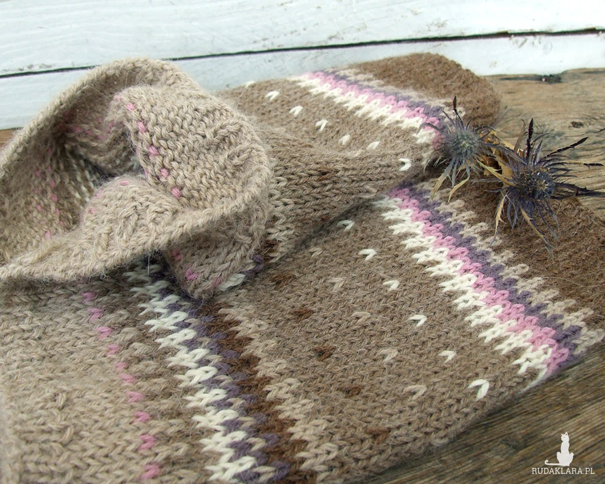 Ciepły komin ręcznie wykonany na drutach, wzorem żakardowym - średniej grubości, gładki, góra komina zakończona wąskim tunelem i sznureczkiem do wiązania/regulacji.