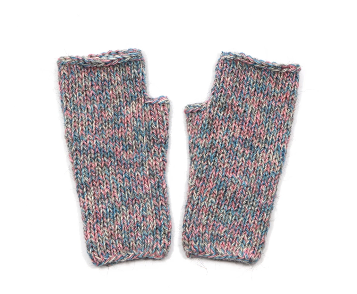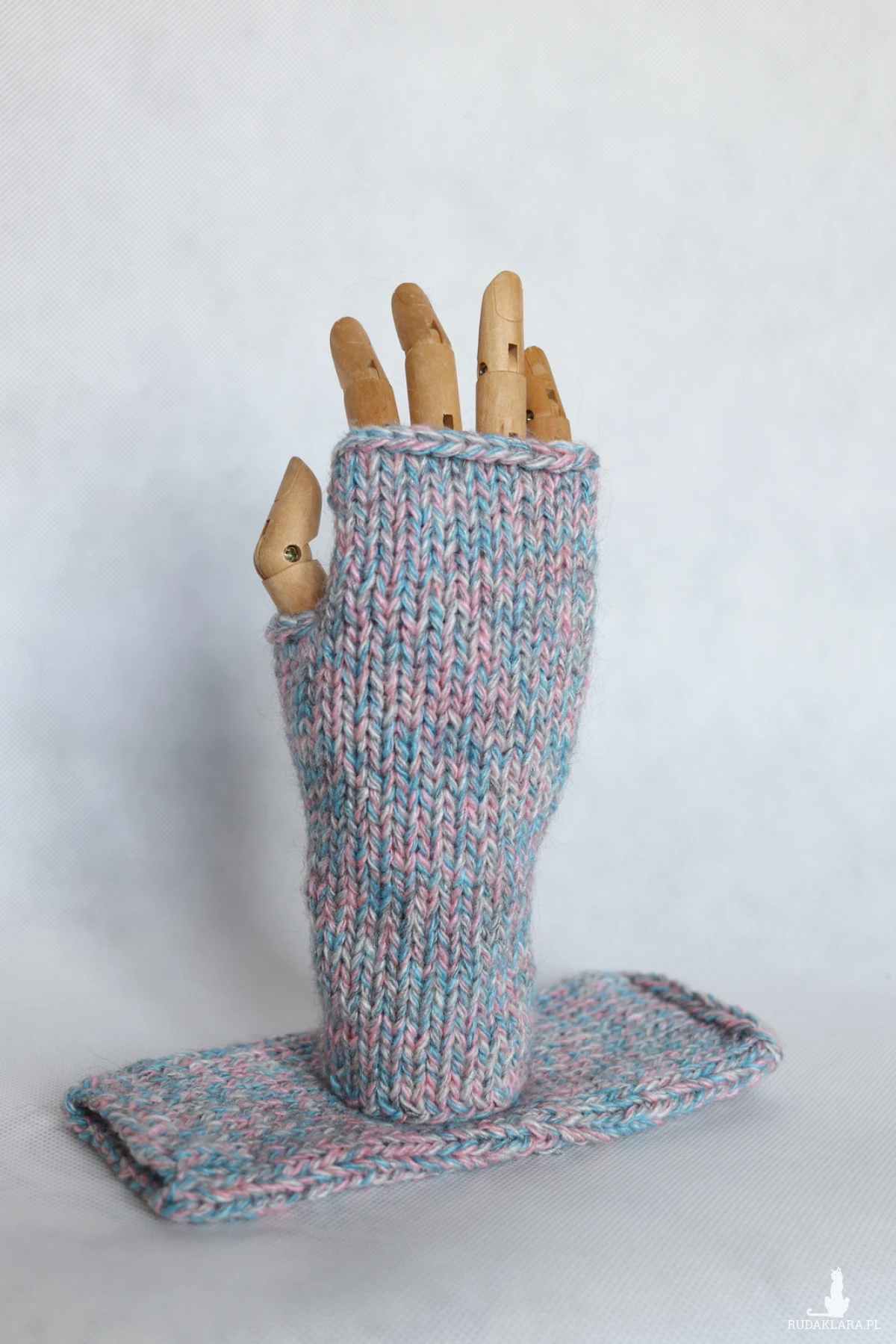Cieplutkie bezszwowe mitenki zrobione na drutach z czterech nitek włóczki w kolorach: szary, ecru, turkusowy i jasnoróżowy.