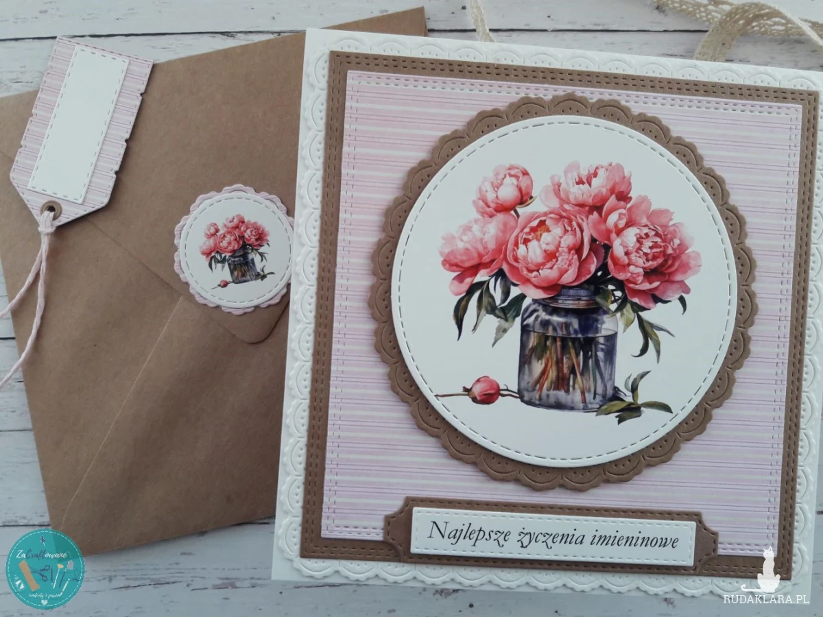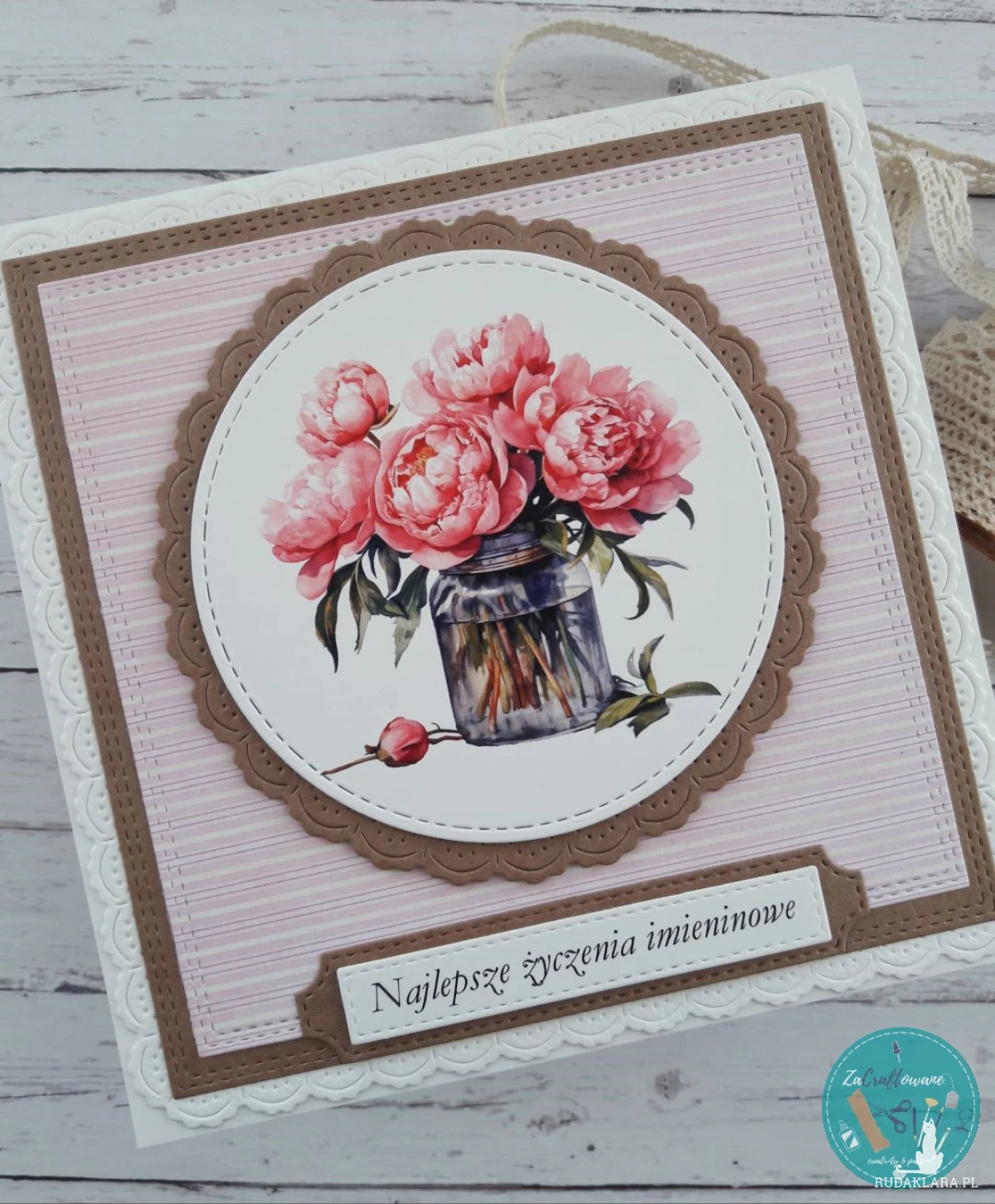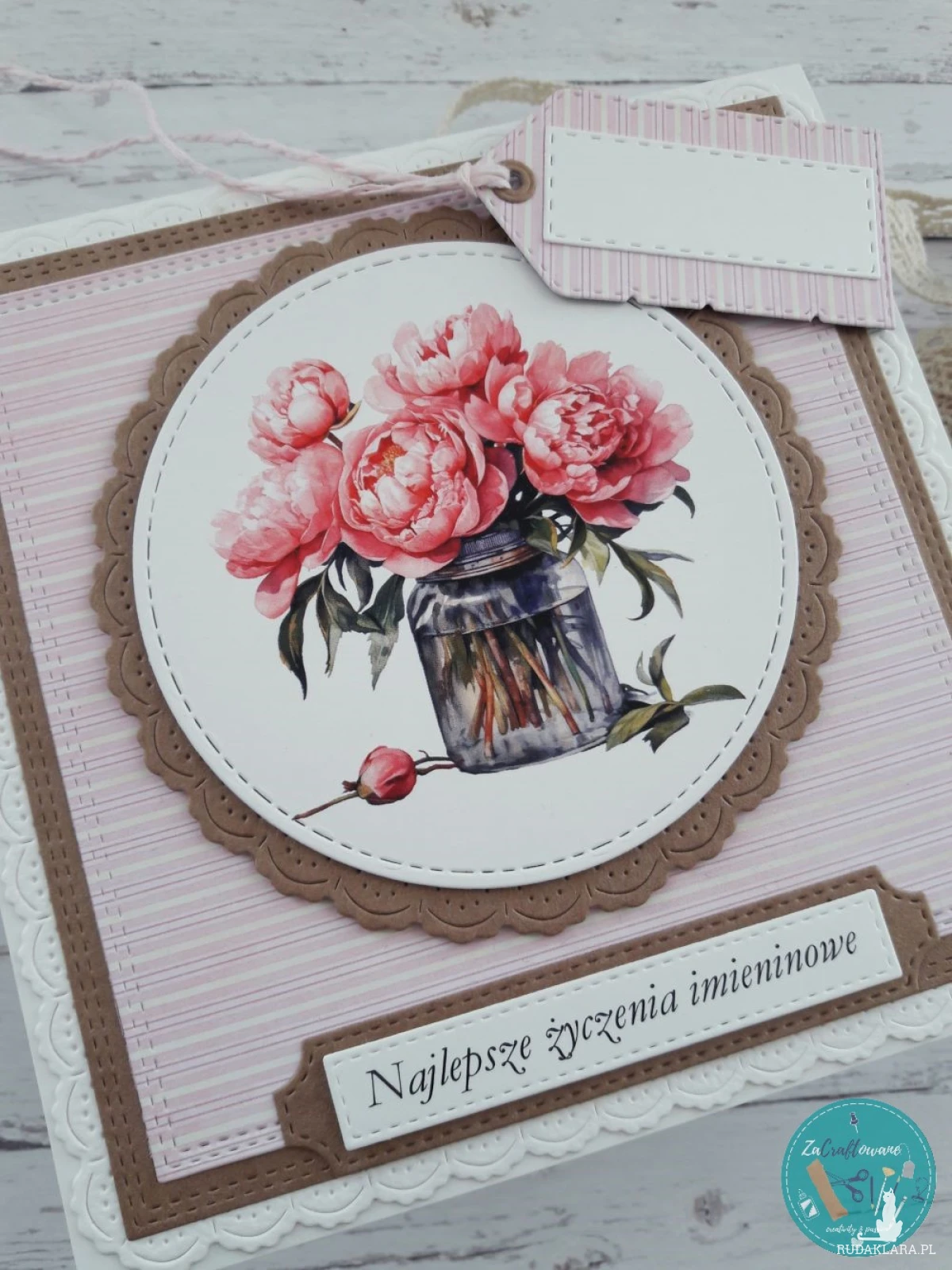 Ręcznie robiona kartka imieninowa z piwoniami wykonana metodą scrapbookingu z wykorzystaniem profesjonalnych materiałów i z dbałością o każdy szczegół.