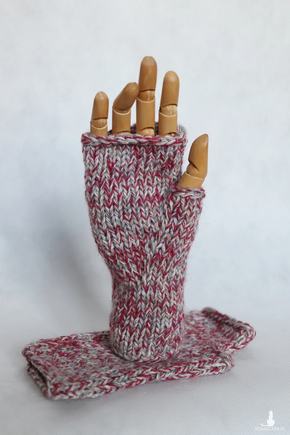 Cieplutkie bezszwowe mitenki zrobione na drutach z czterech nitek włóczki w kolorach: szary, beżowy, ecru i bordowym.