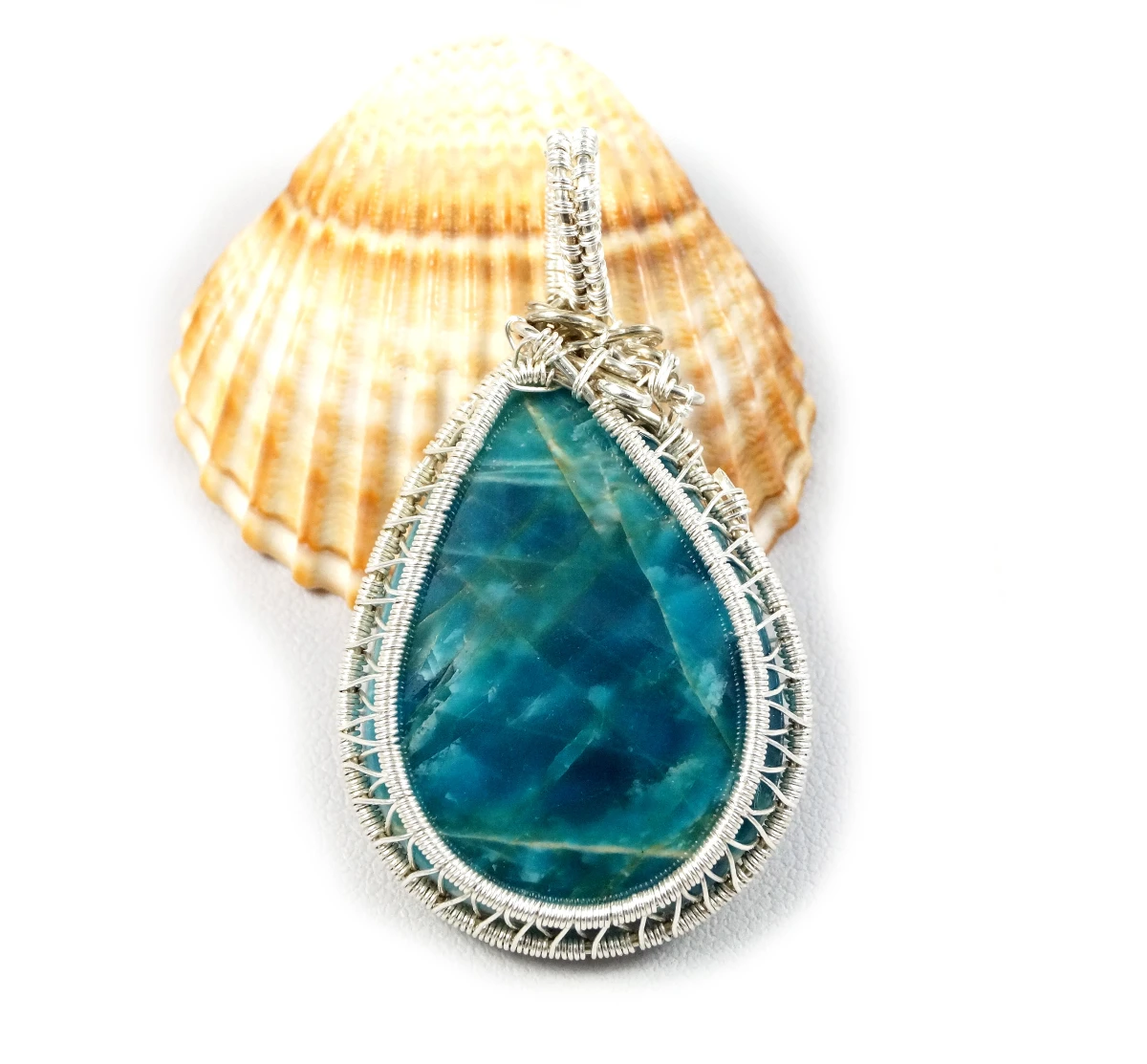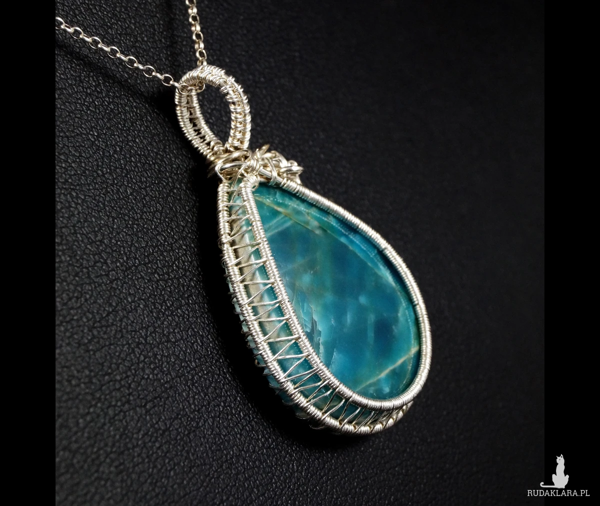 Bajeczny, misternie pleciony wisior z niebieskim kaboszonem apatytu.