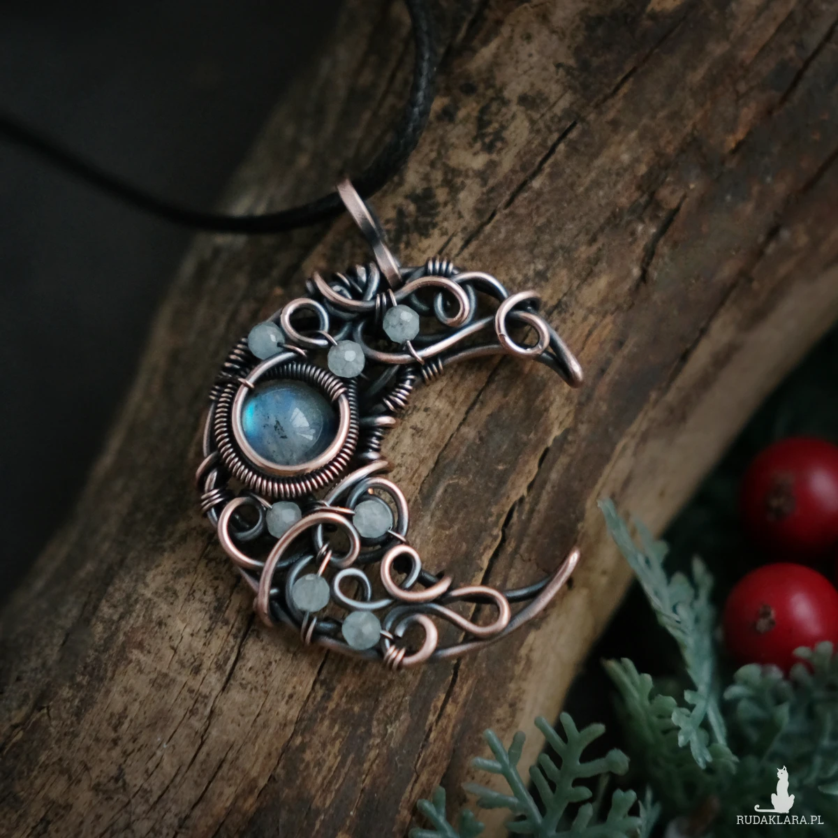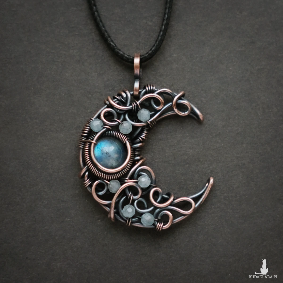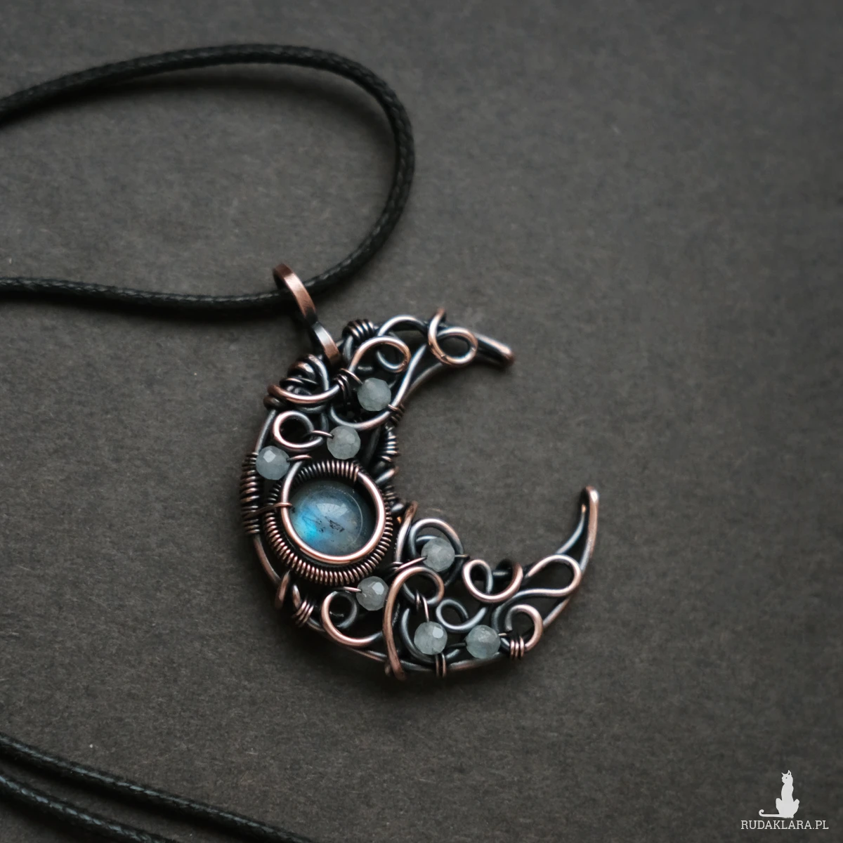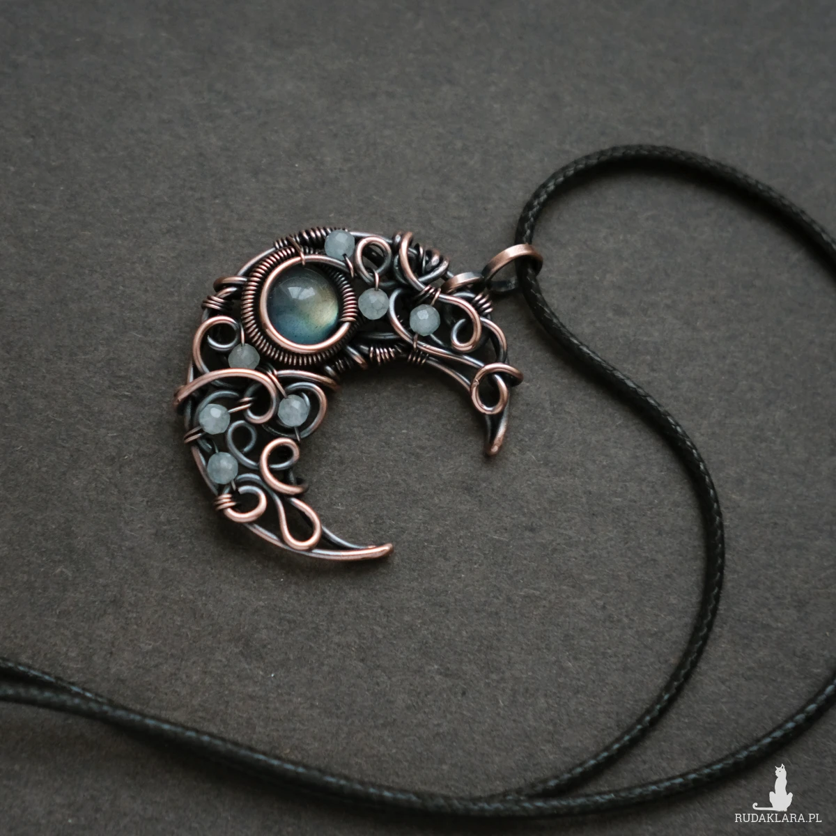 Miedziany wisiorek - księżyc z kamieniem labradorytu oraz drobnymi fasetowanymi akwamarynami. Piękne fantazyjne sploty dodają mu baśniowego charakteru. Labradoryt iryzuje w dwóch kolorach - delikatnie brzoskwiniowym lub niebieskim, w zależności od tego którą stroną jest obrócony.