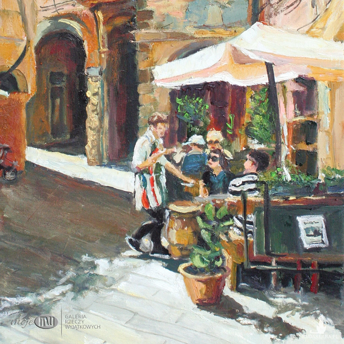 Obraz olejny malowany na płótnie, utrzymany w szerokiej palecie barw z wyraźną dominantą ciepłych odcieni pomarańczu. Będzie stanowił zdecydowany kolorystyczny i dekoracyjny akcent we wnętrzu.