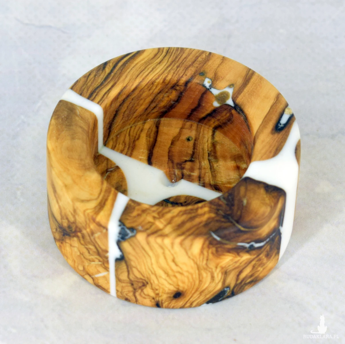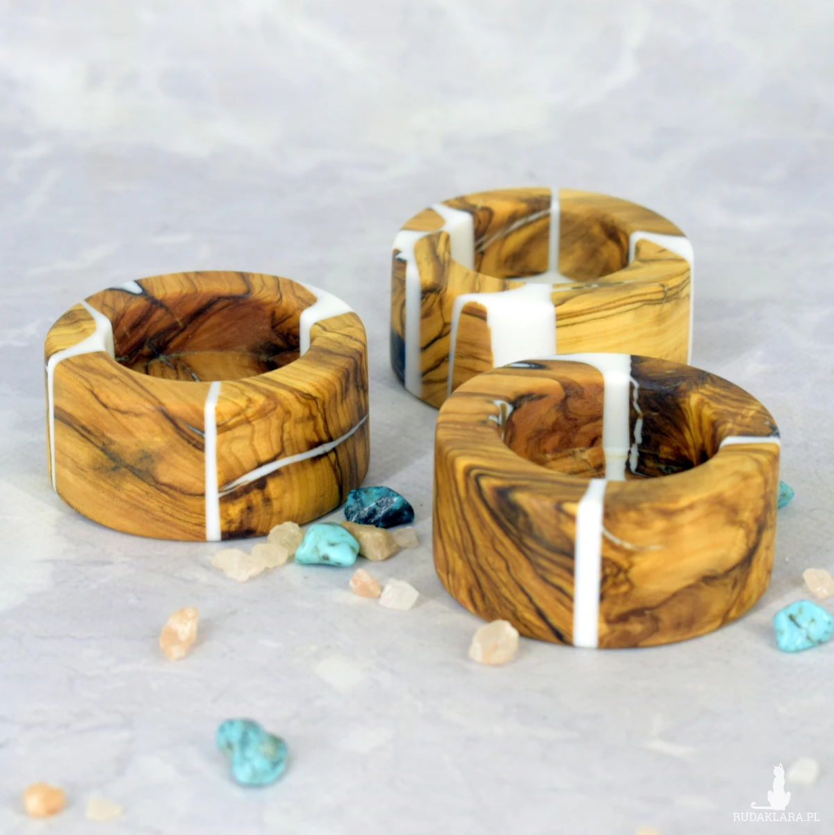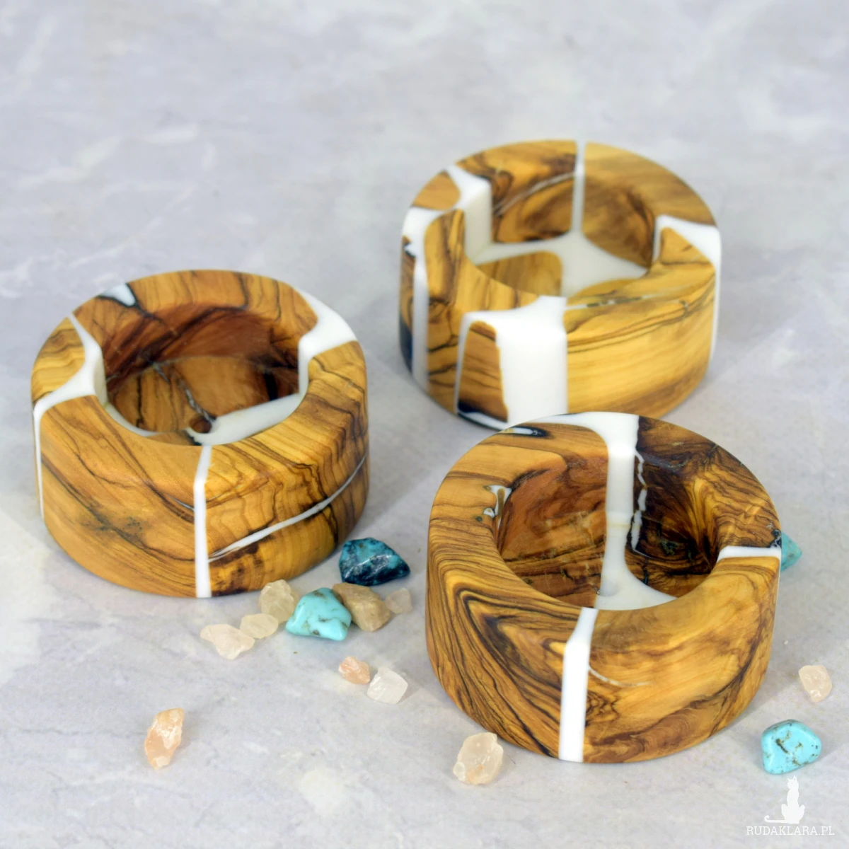 Ręcznie wykonany świecznik z kawałków drewna oliwnego połączonych białą żywicą. To idealny dodatek na długie wieczory. Naturalne usłojenie, ciepła barwa i subtelne wykończenie tworzą wyjątkową atmosferę – zarówno w salonie, jak i sypialni czy jadalni. Pasuje do standardowych świeczek typu tealight.