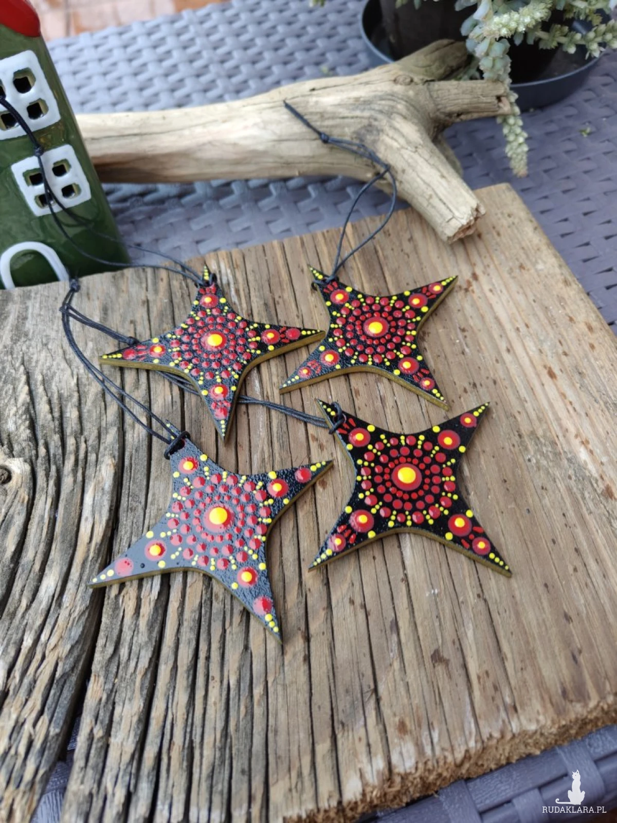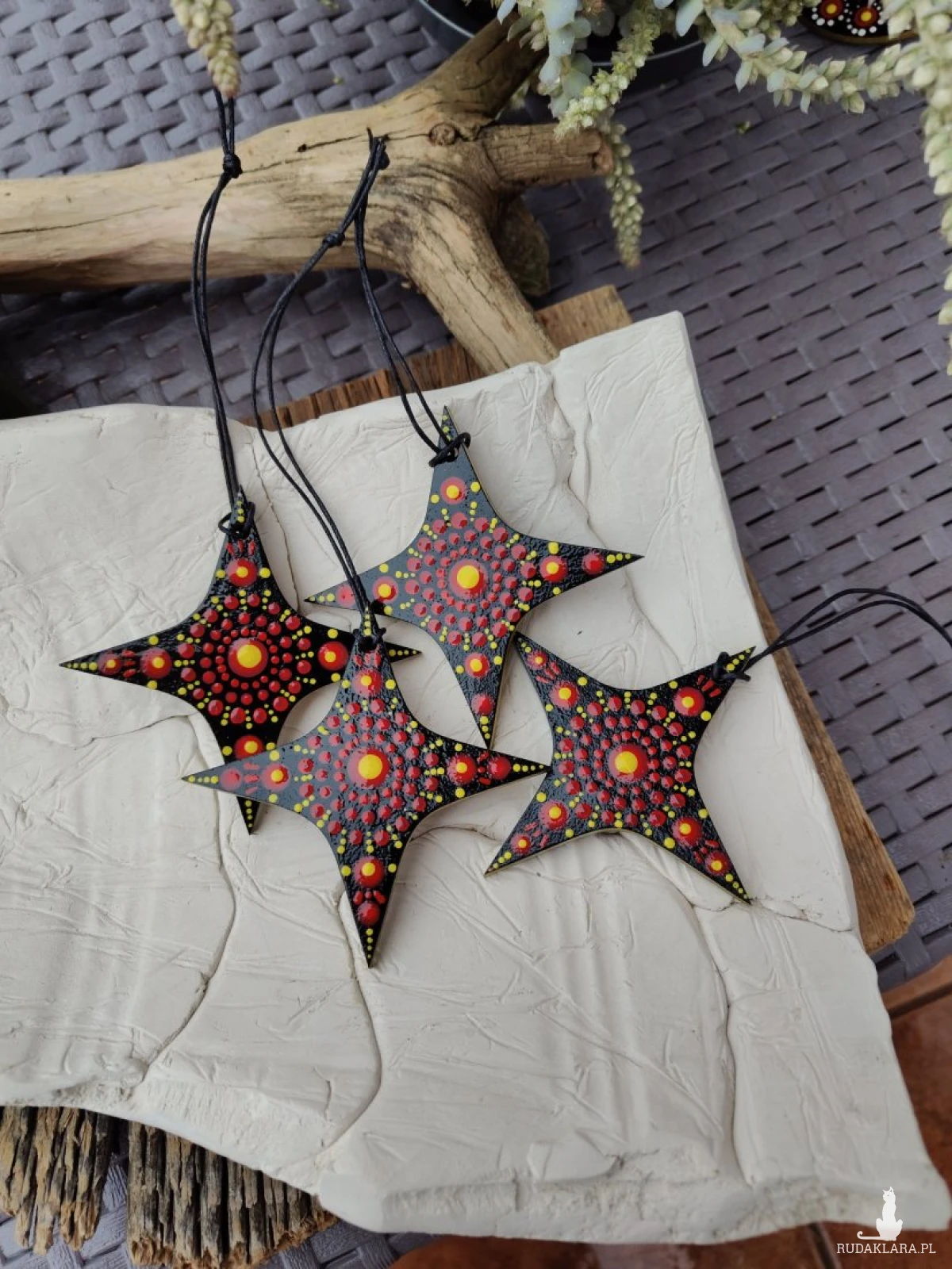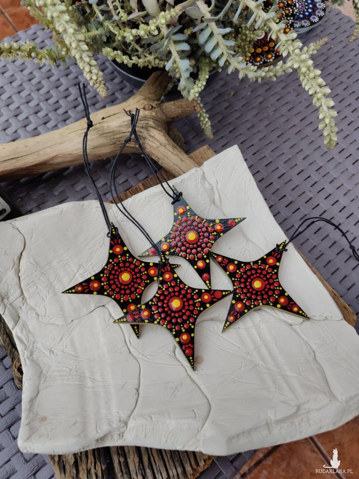 Ozdobne gwiazdki wykonane ręcznie i malowane techniką kropkowania (dot painting). Każda zawieszka jest unikatowa – zdobiona energetyczną mandalą w ciepłych odcieniach czerwieni, pomarańczu i żółci. Idealnie sprawdzi się jako dekoracja świąteczna, element wystroju domu lub prezent w rustykalnym, boho czy etnicznym stylu. Można zawiesić je na choince, w oknie, przy doniczkach lub jako ozdobę ścienną.