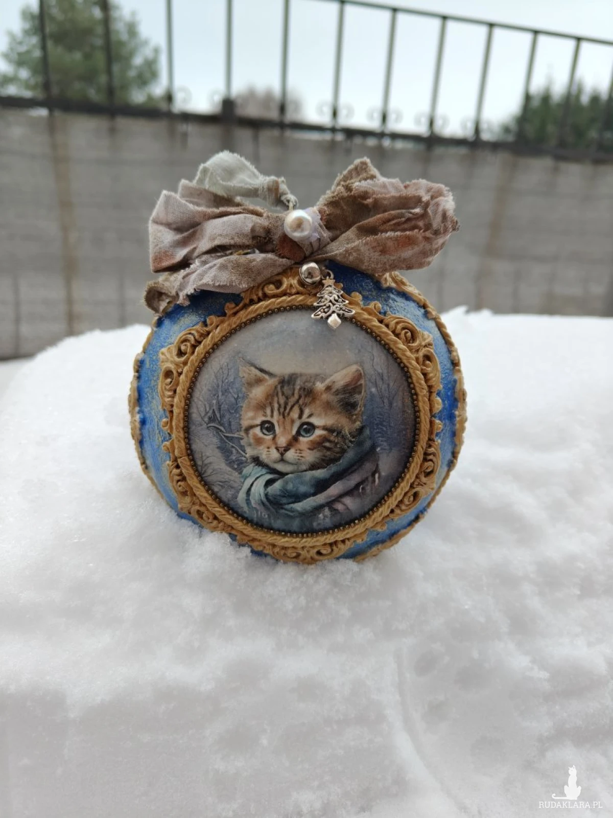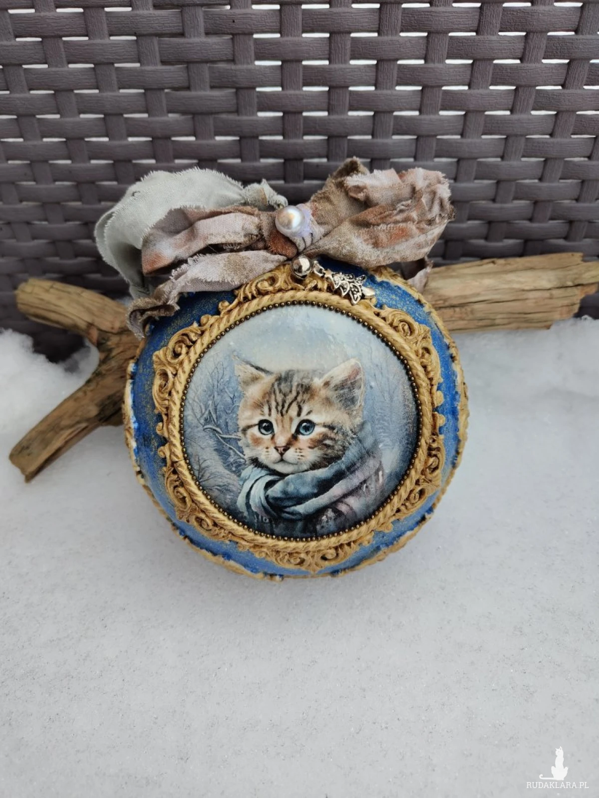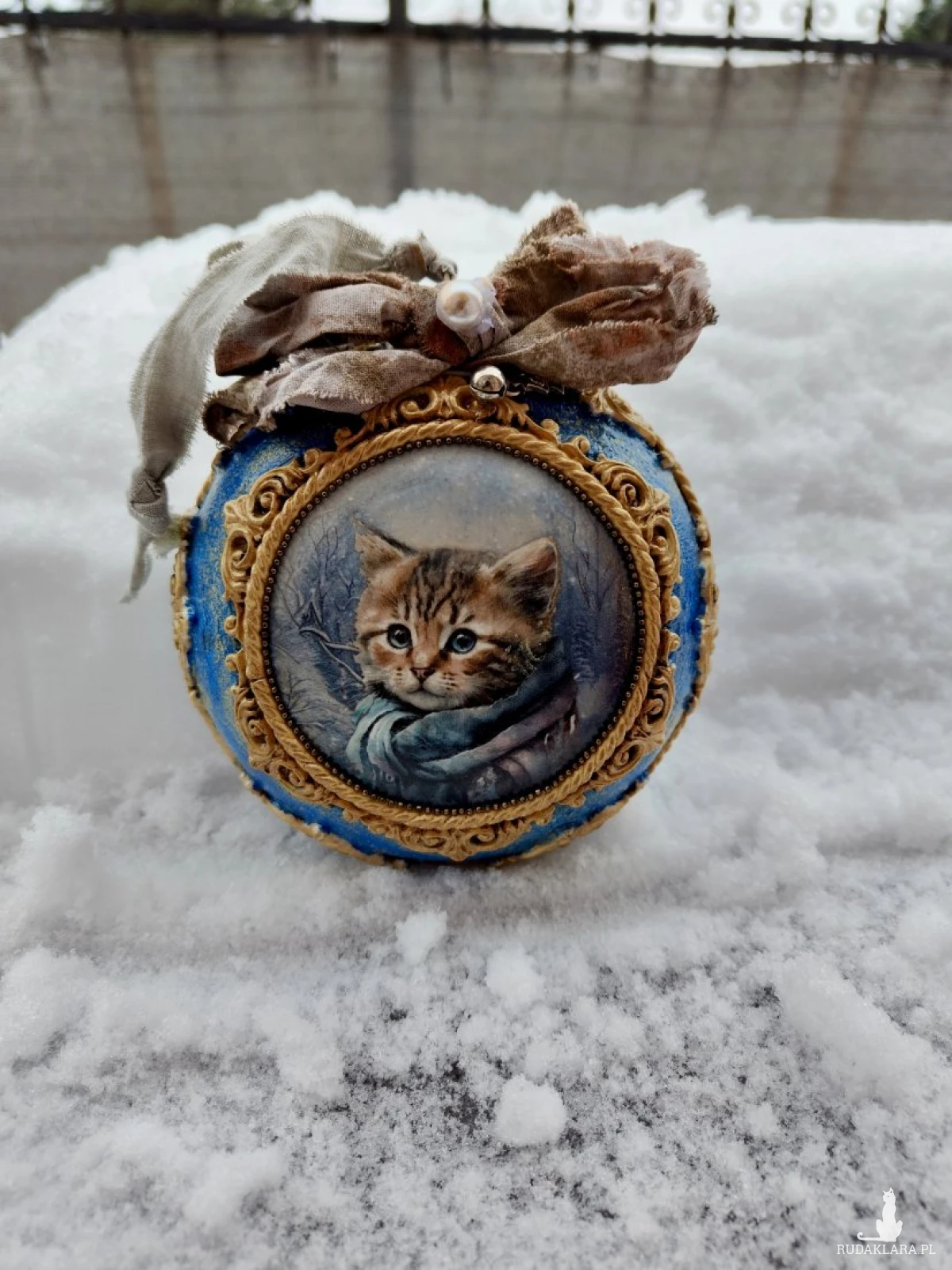Elegancka, ręcznie zdobiona bombka o wyjątkowo przytulnym, zimowym charakterze. W centralnej części znajduje się urocza ilustracja kotka otulonego szalem, osadzona w dekoracyjnej, złoconej ramce. Całość dopełniają miękkie, materiałowe kokardy w odcieniach szarości i beżu, które nadają ozdobie szlachetnego, vintage’owego wyglądu. Bombka idealnie sprawdzi się jako nastrojowa dekoracja choinki, stroika lub jako prezent dla miłośników kotów i stylu retro.