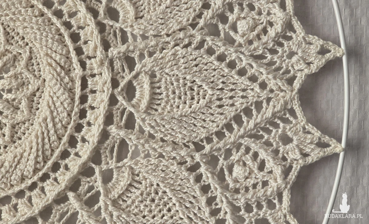 Serweta Ulita zrobiona z kordonka Ariadna Aria 5 col 0000, rozpięta na obręczy 45 cm.