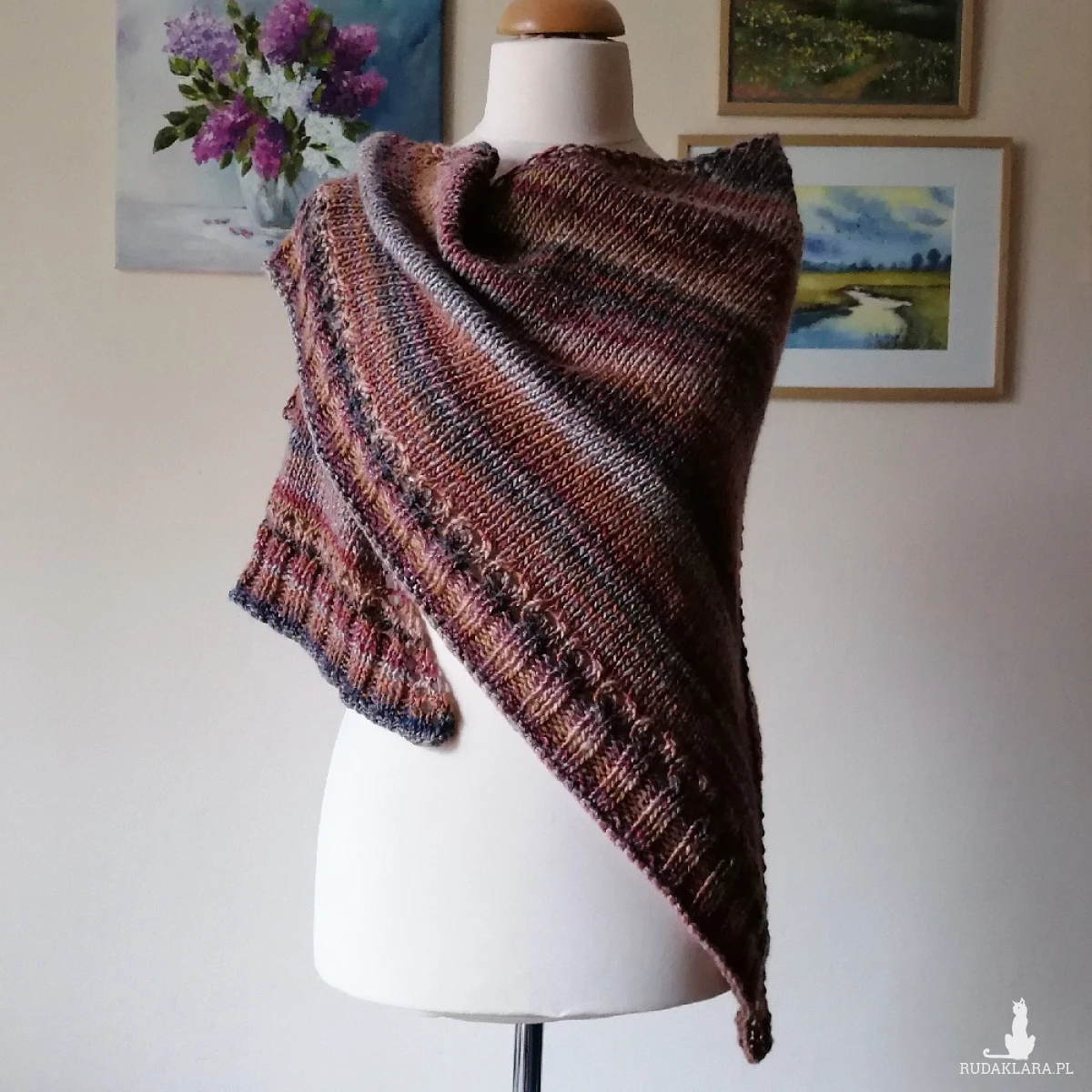 Duża chusta wykonana ręcznie na drutach z miłej, nieco grubszej włóczki produkcji włoskiej o składzie: 30% wełny merino, 70% mikrofibry akrylowej. Chusta jest bardzo miła i świetnie sprawdzi się dla osób nielubiących "dotyku" wełny. Apetyczny kolor jest jej dodatkowym atutem. Ponieważ włóczka jest grubsza, polecam chustę w chłodniejszym i zimowym sezonie. Wymiary: 202 cm. bok najdłuższy, 92 cm. wys. trójkąta. Producent dopuszcza pranie w pralce w programie "jedwab/pranie ręczne". Ja raczej zalecam realne pranie ręczne.