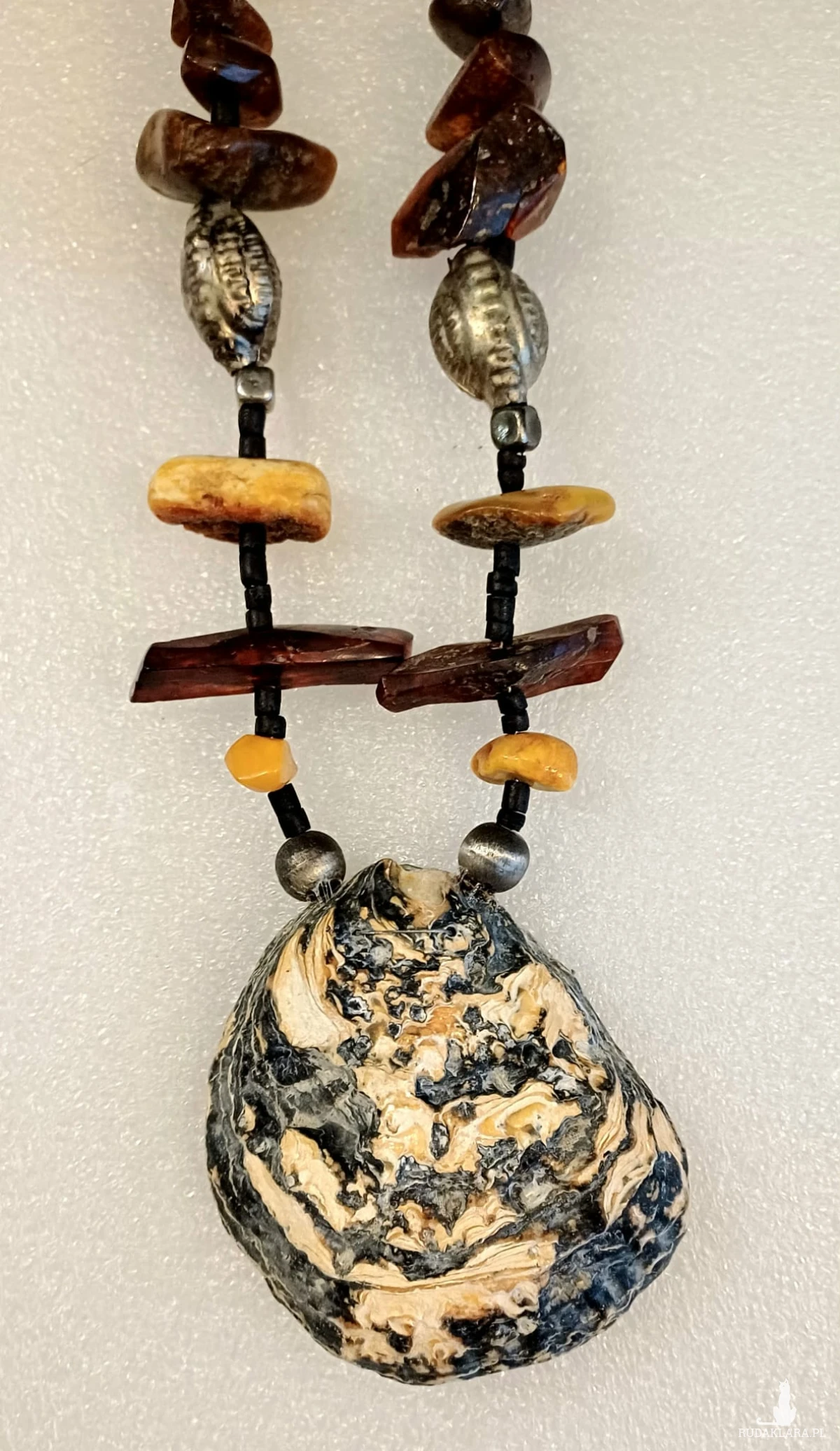 Ta muszla może być Twoja, a jedno jest pewne - nie będzie drugiego takiego naszyjnika - bo ta muszla jest jedyna w swoim rodzaju - natura tworzy najpiękniejsze dzieła sztuki! • Materiał: Naturalna, beżowa zawieszka z muszli ostrygowej z Normandii -wymiary 7x6 cm, z bursztynem w środku - do tego dodałam bursztyn bałtycki (1-4 cm), drewniane koraliki i srebrne dodatki!