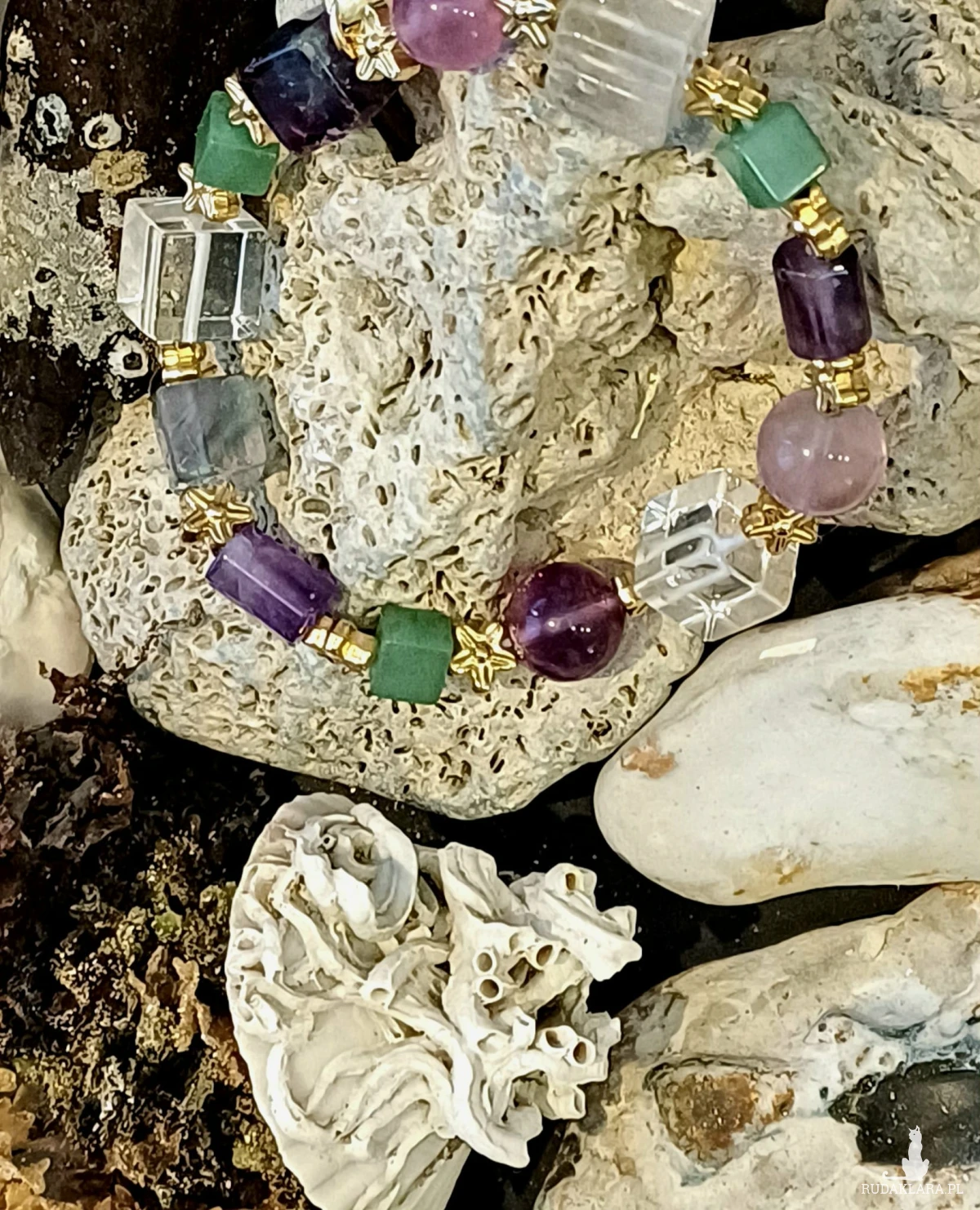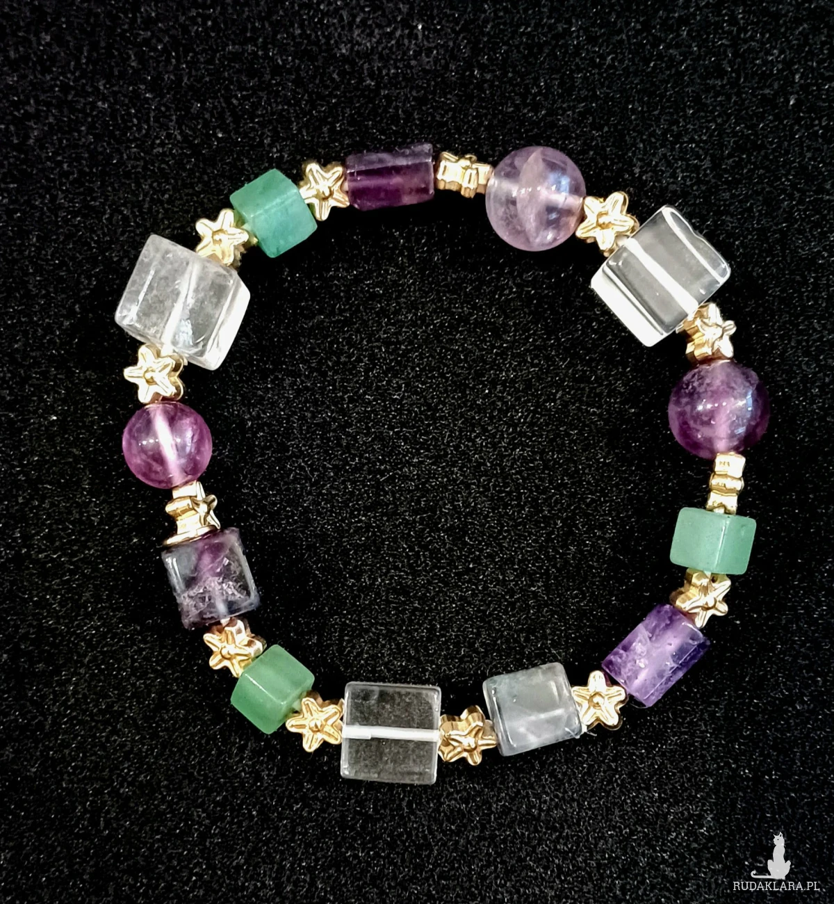 Bardzo elegancka bransoletka z ametystu, zielonego kwarcu i kryształu górskiego- przepiękne połączenie - do tego małe kwiatki w kolorze złota - na podwójnej gumce - średnica 6 cm !