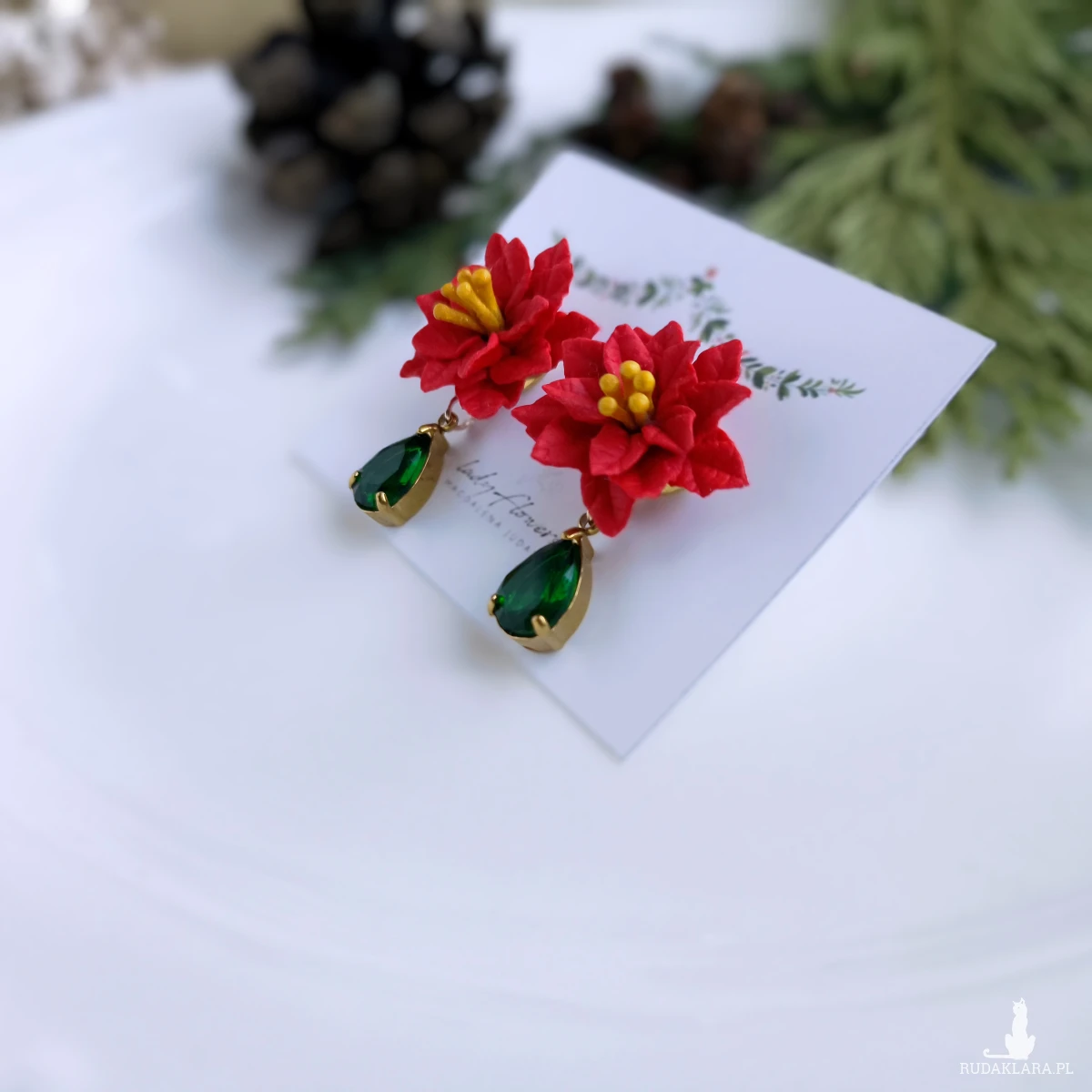 Eleganckie, świąteczne kolczyki z kwiatami poisencji z kryształkiem