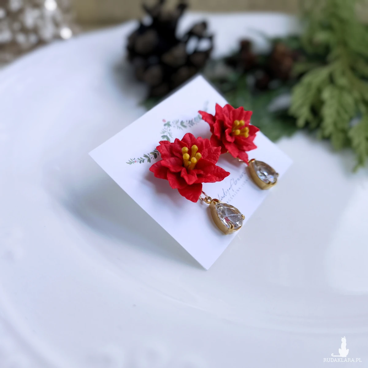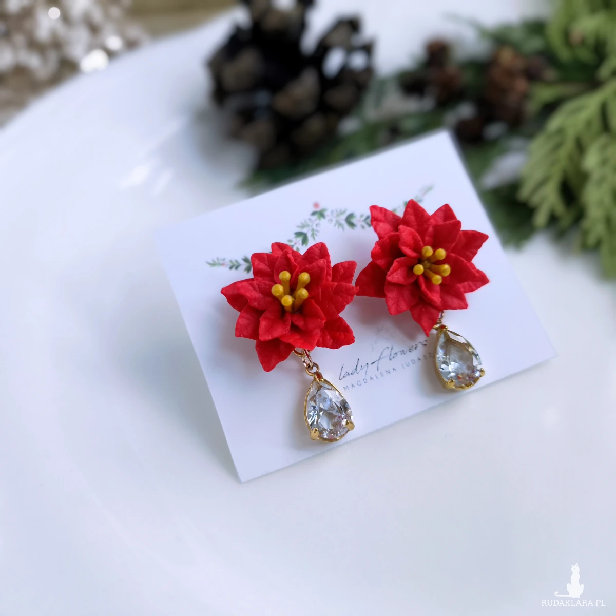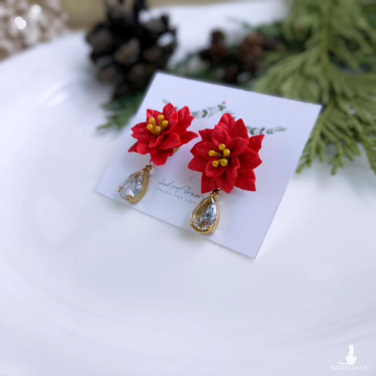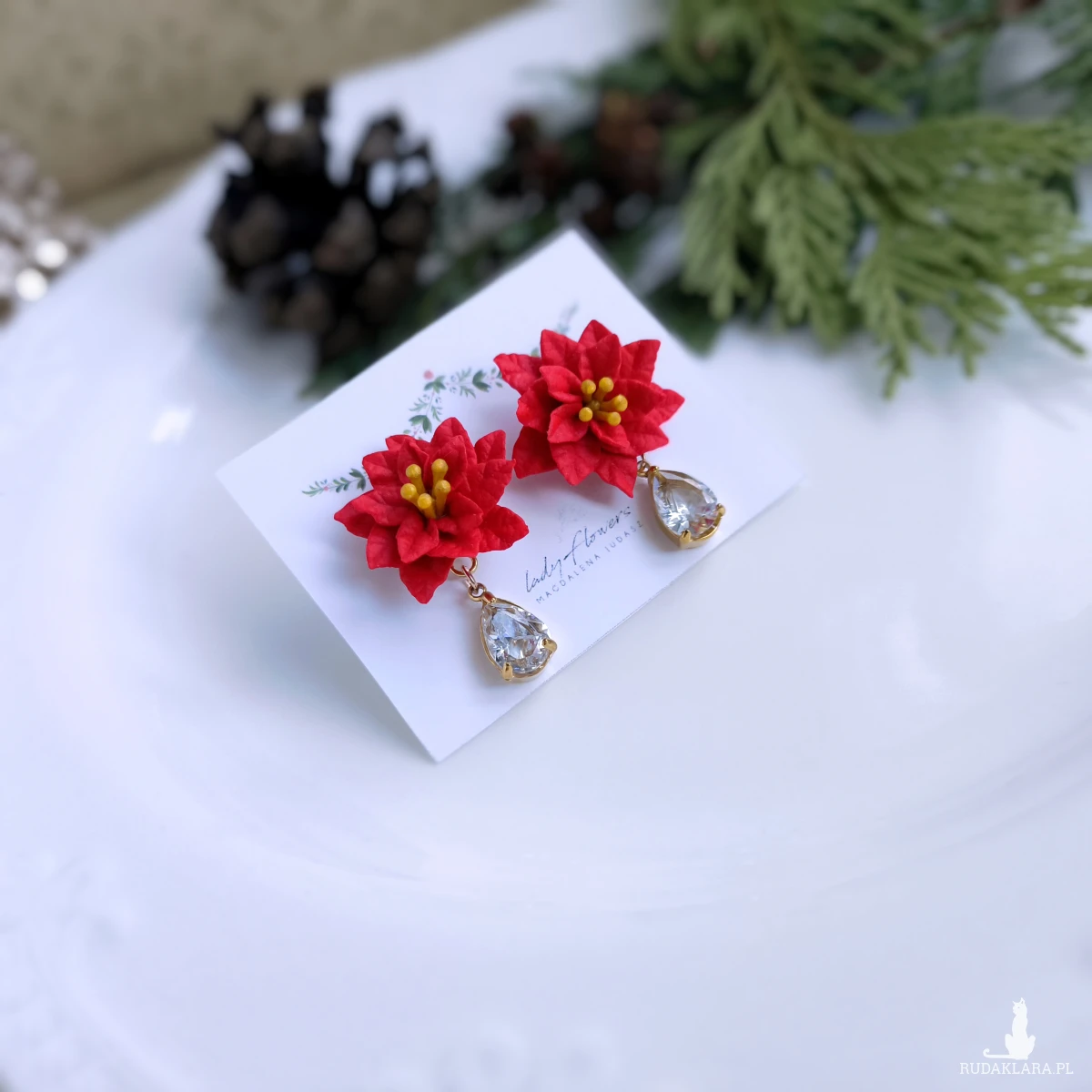 Eleganckie, świąteczne kolczyki z kwiatami poisencji z kryształkiem