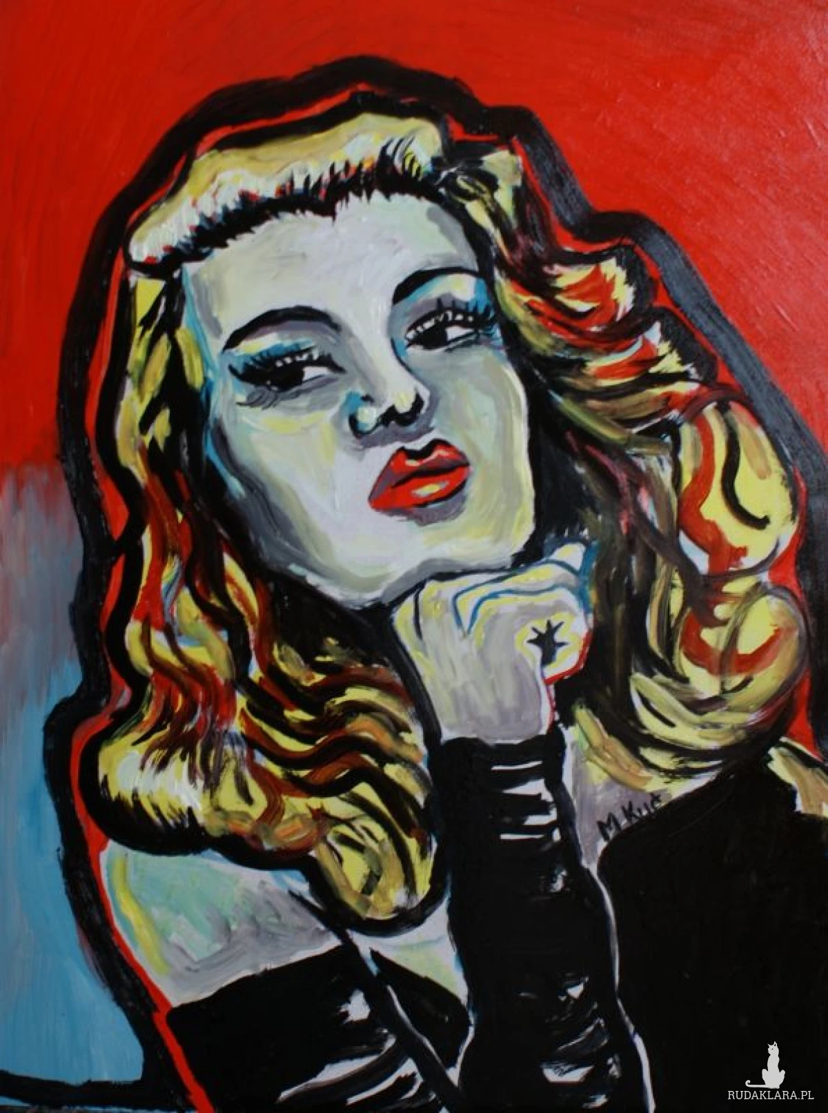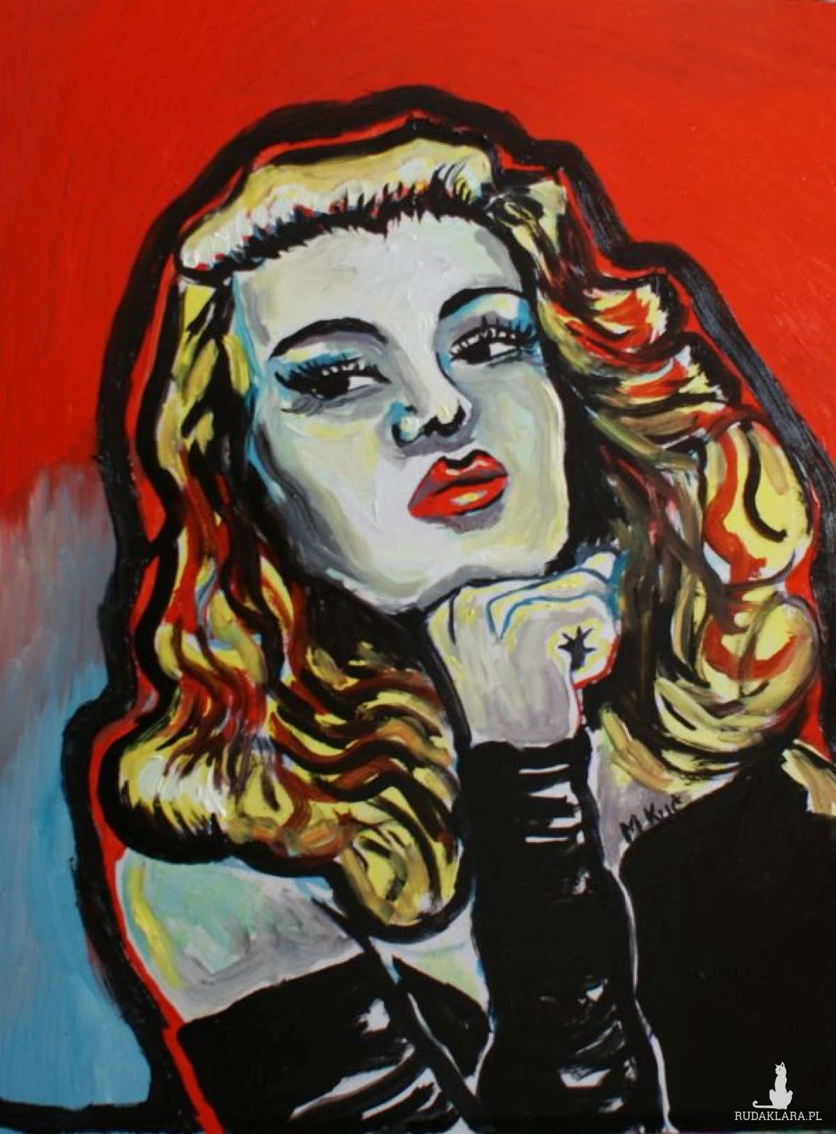 To malarskie przedstawienie emanuje intensywnością i pewną zuchwałą pewnością siebie. Postać kobiety, namalowana wyrazistymi, kontrastującymi plamami barwnymi, wygląda jak ikona pop-artu – silna, świadoma swojego spojrzenia, niemal hipnotyzująca.