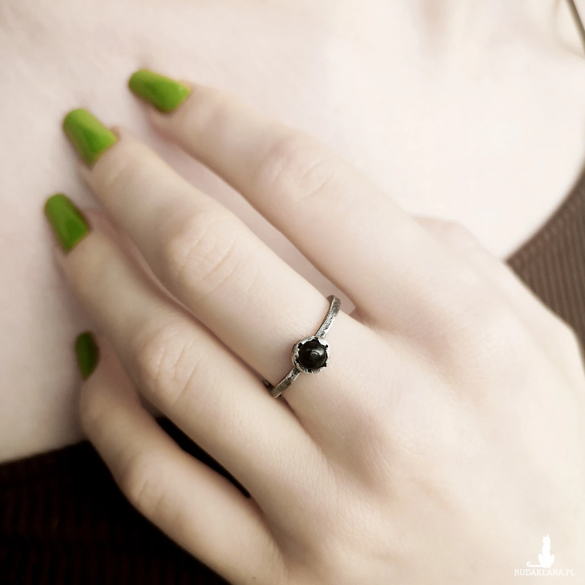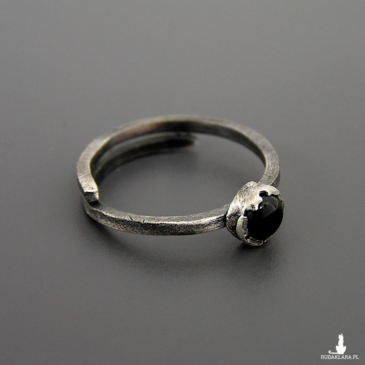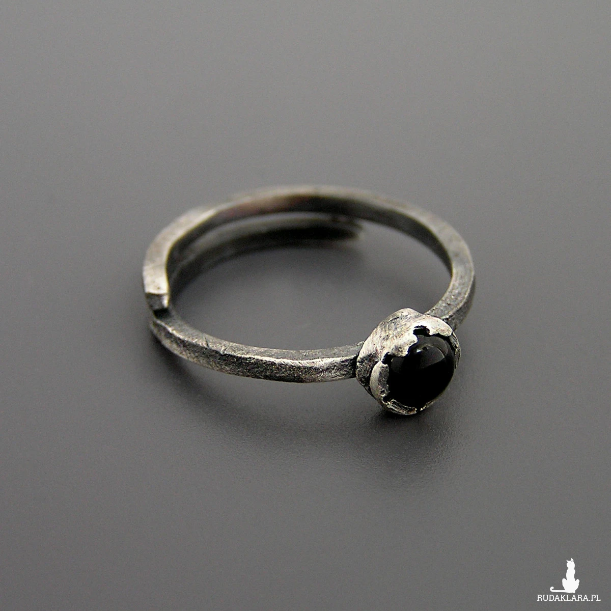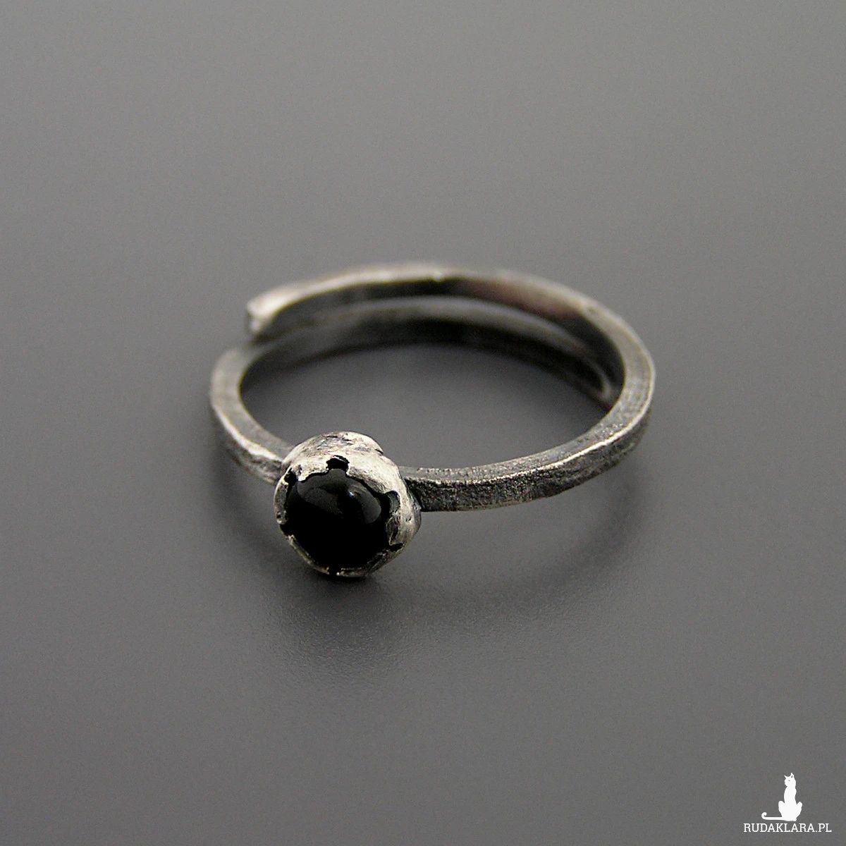Surowy pierścionek z onyksem o średnicy 5 mm.