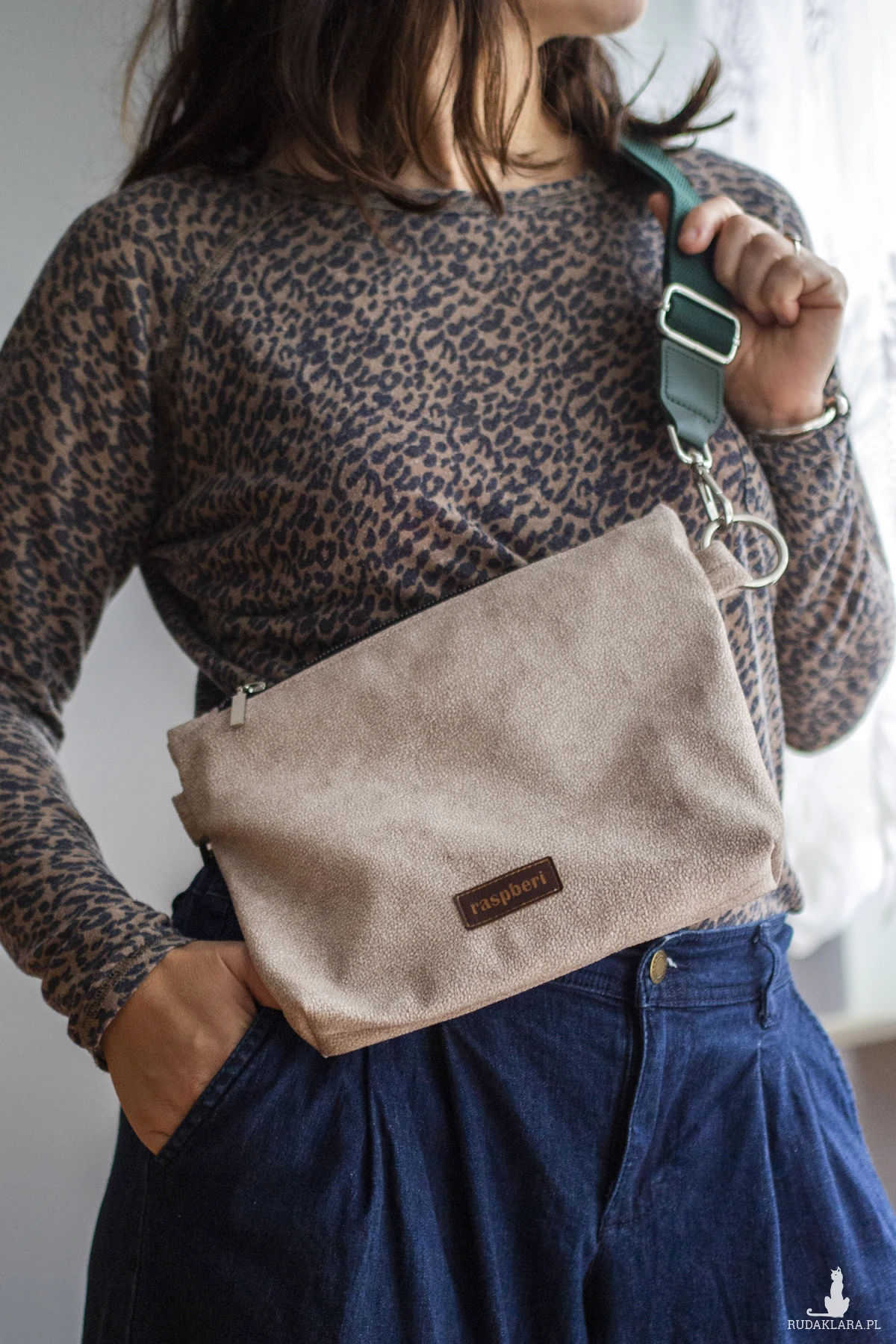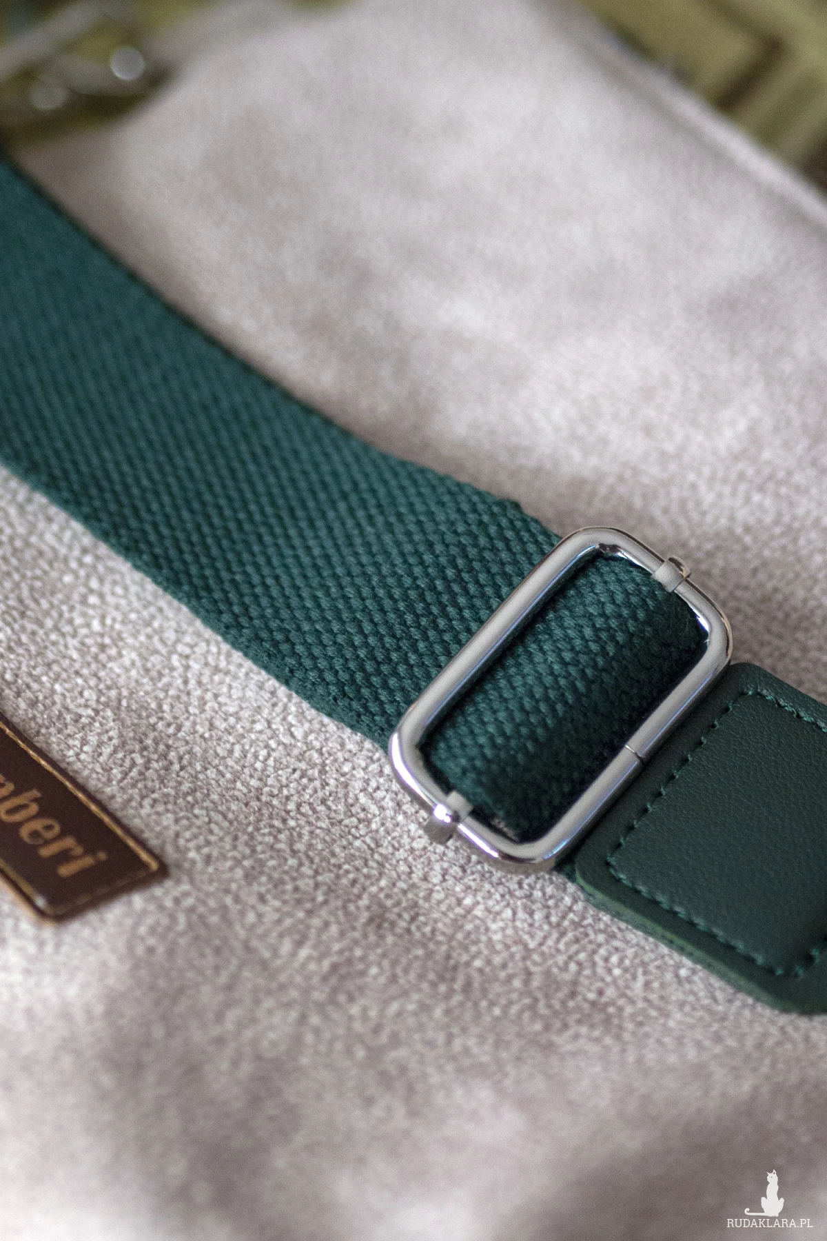 Torebka posiada regulowany zielony pasek i srebrne okucia.