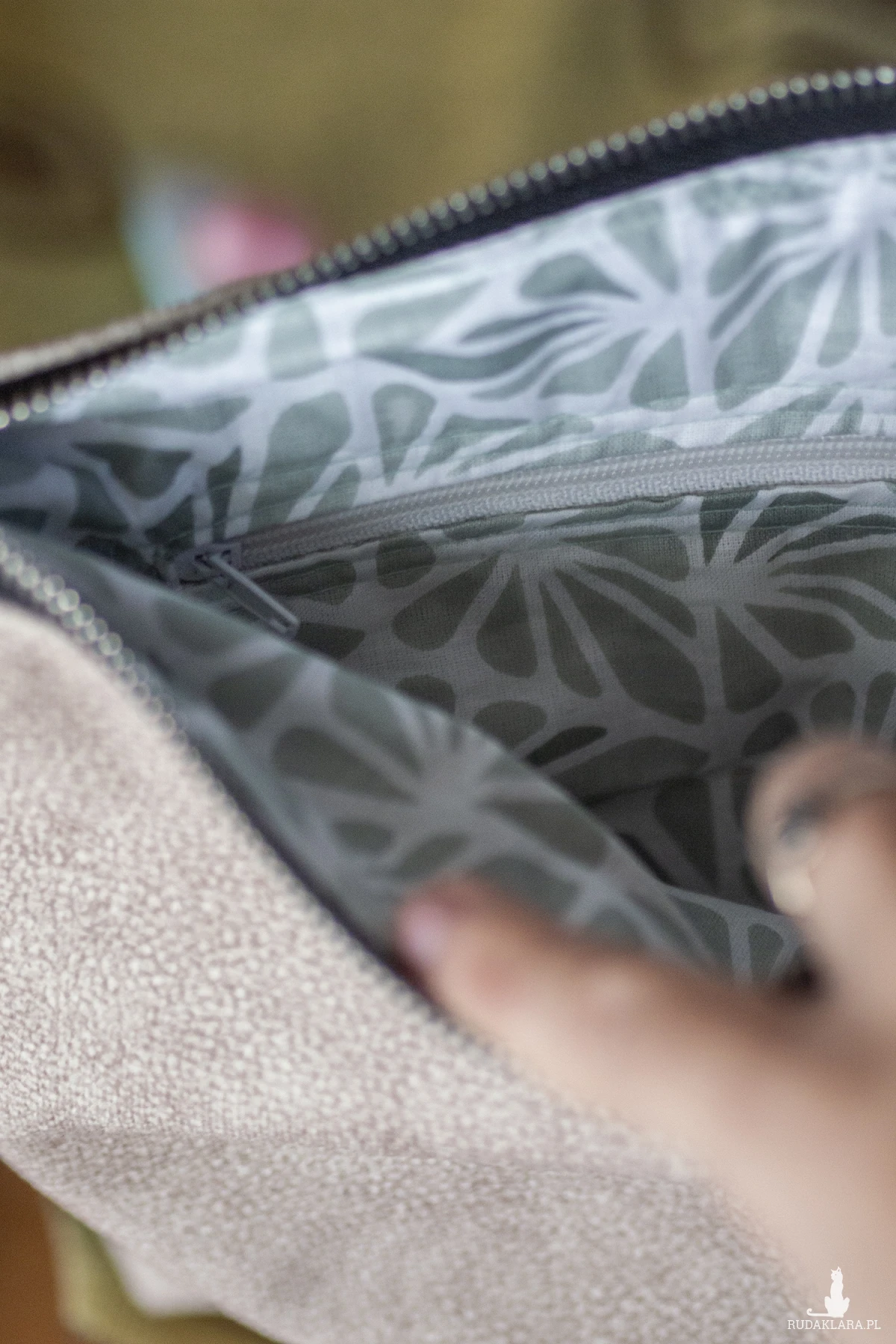Małe zaszewki na dnie. Z tyłu oraz w środku torebki kieszonki zapinane na suwak. Środek wykończony bawełnianą podszewką.