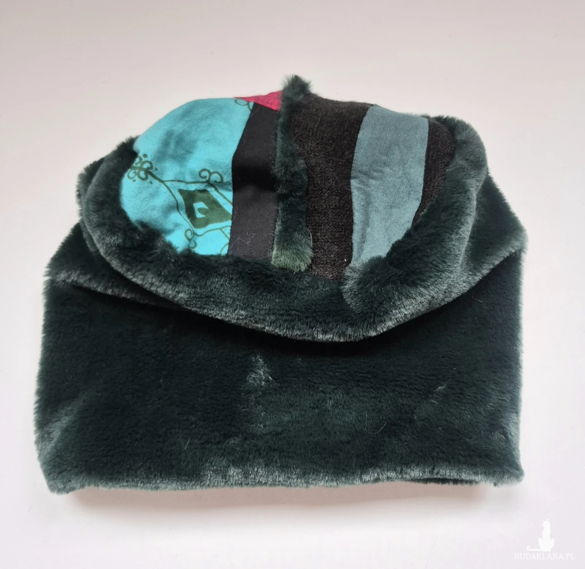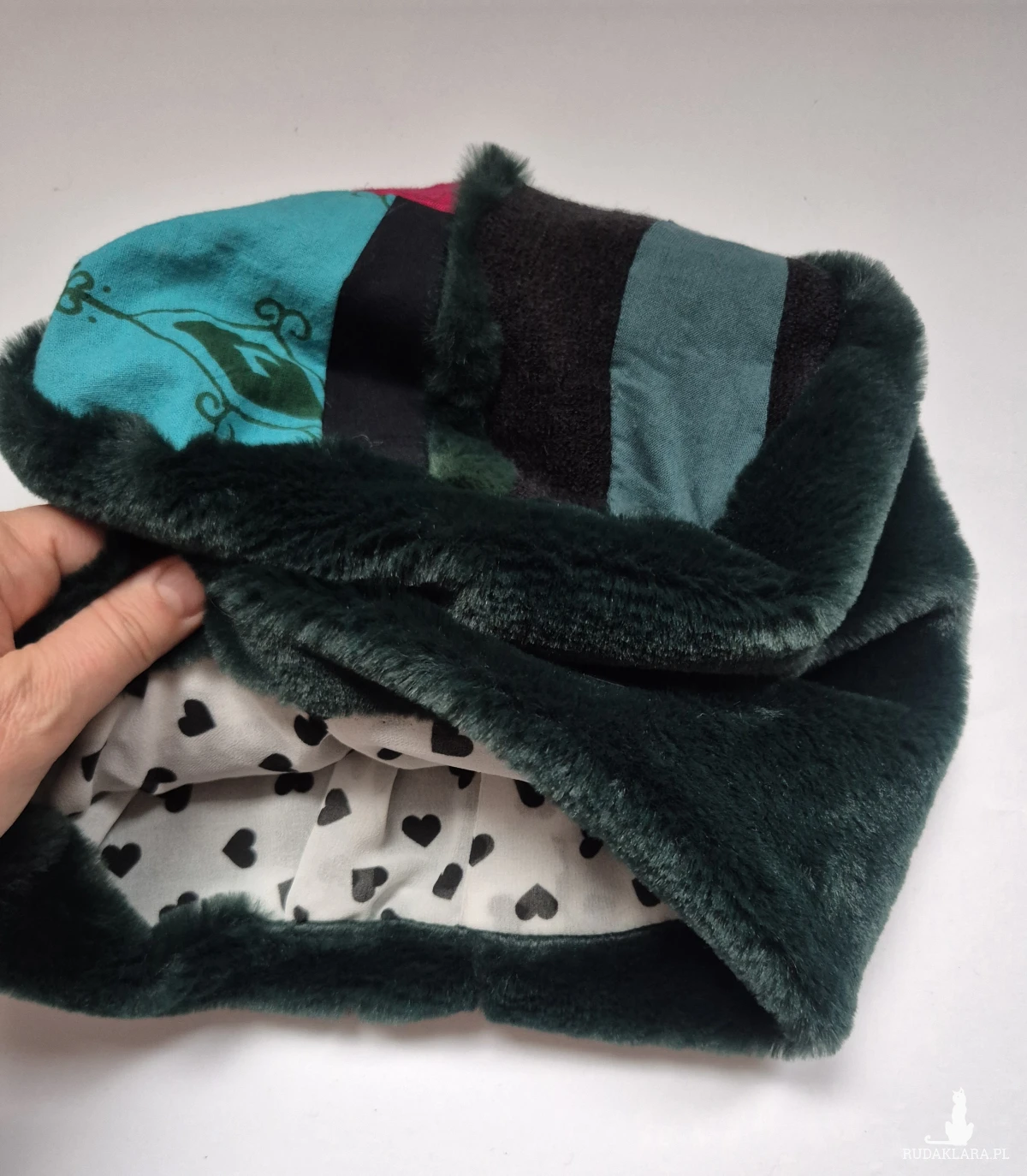 Futrzana czapka ciemna zieleń góra patchworkowa na podszewce rozmiar uniwersalny ciepła, box a1