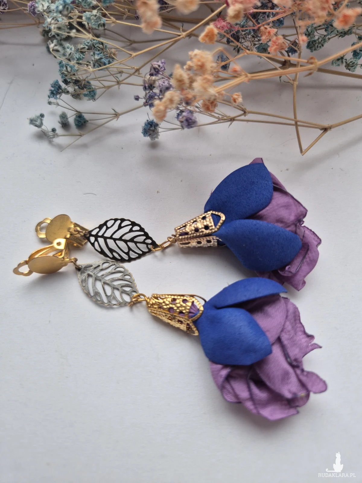 Klipsy kwiaty fioletowo-niebieskie leciutkie w pojedynczym egzemplarzu w stylu Boho polecam Box X1