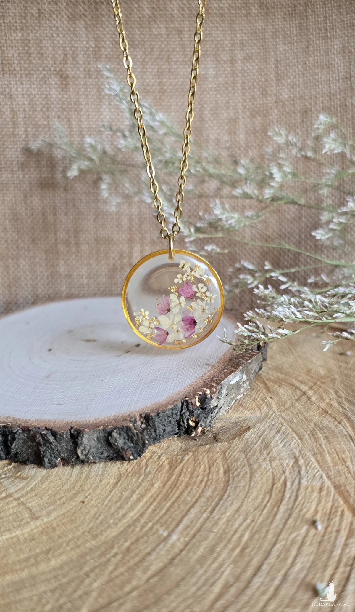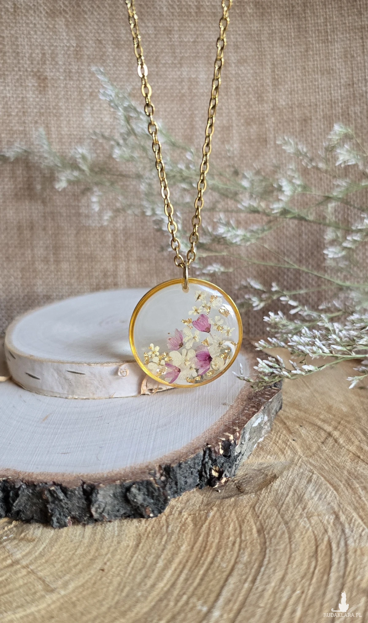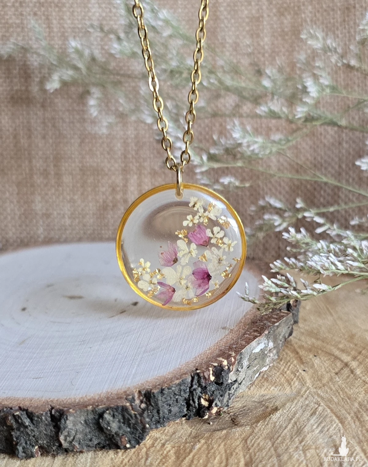Oferuję Państwu unikalną biżuterię. Zawieszka jest wykonana z suszonych kwiatów i żywicy epoksydowej. Biżuteria jest wspaniałym i oryginalnym prezentem na lata.