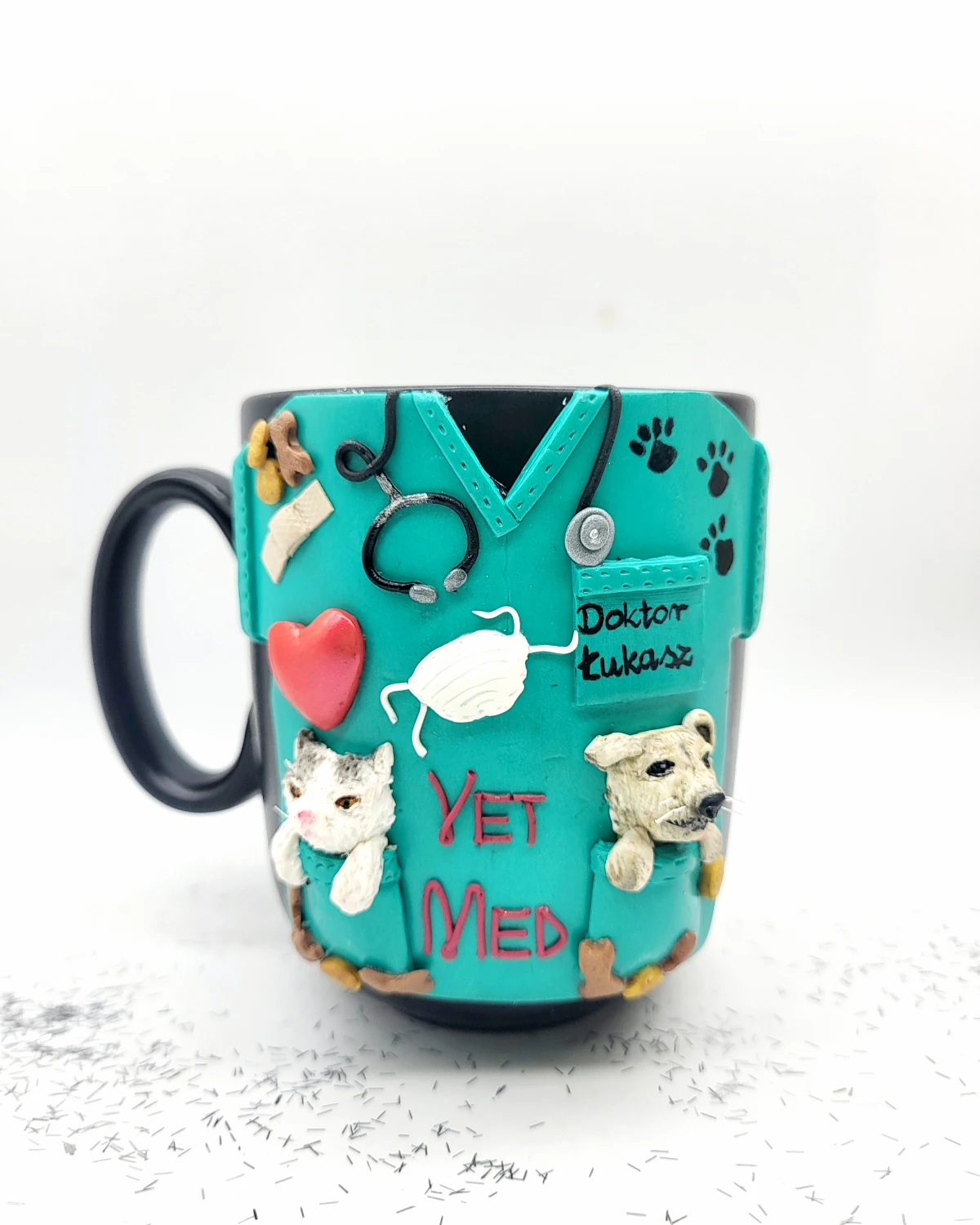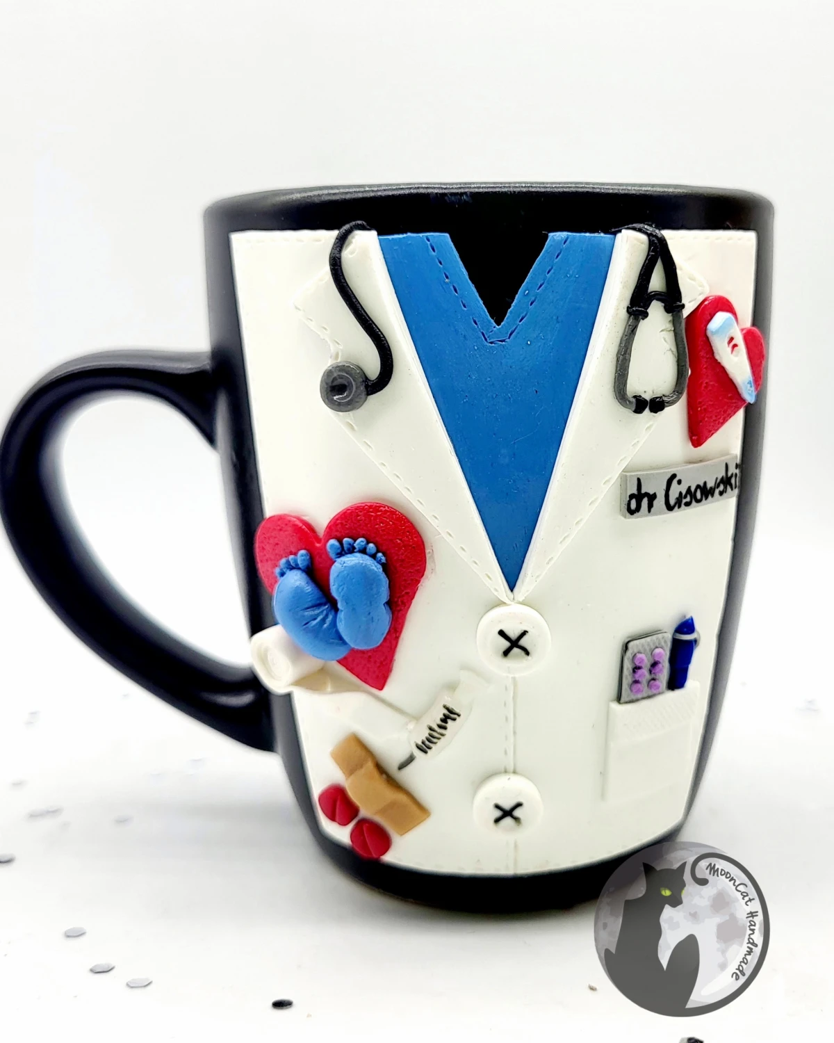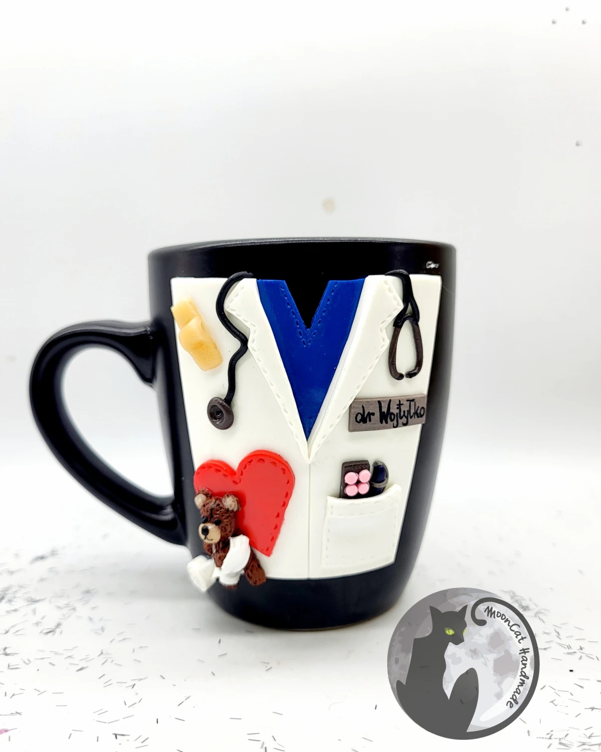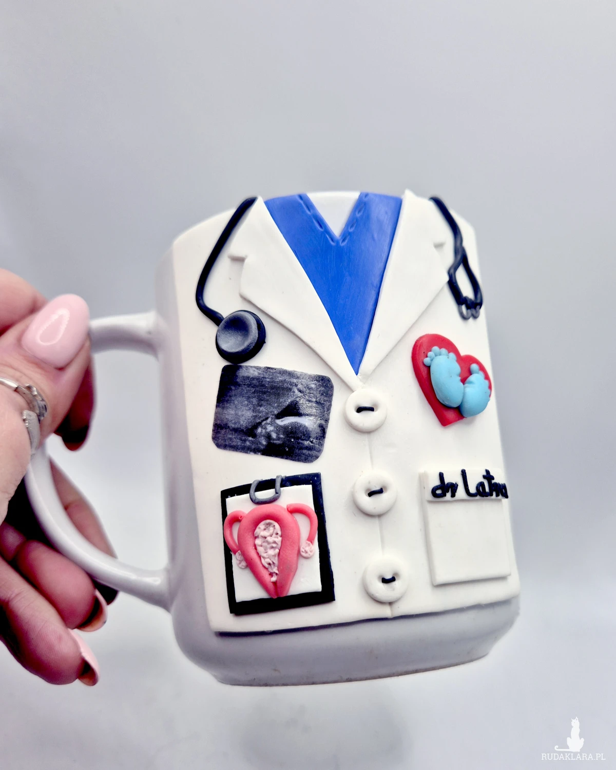 Kubek o pojemności 350 ml ozdobiony ręcznie lepionym wzorem lekarskiego kitla. Kubek w pełni personalizowany. Ma być dla dentysty, ginekologa, kardiologa? Napisz to w wiadomości prywatnej, a wzór bedzie odpowiednio dobrany. Możesz tez wybrać kolor kitla lub koszuli.