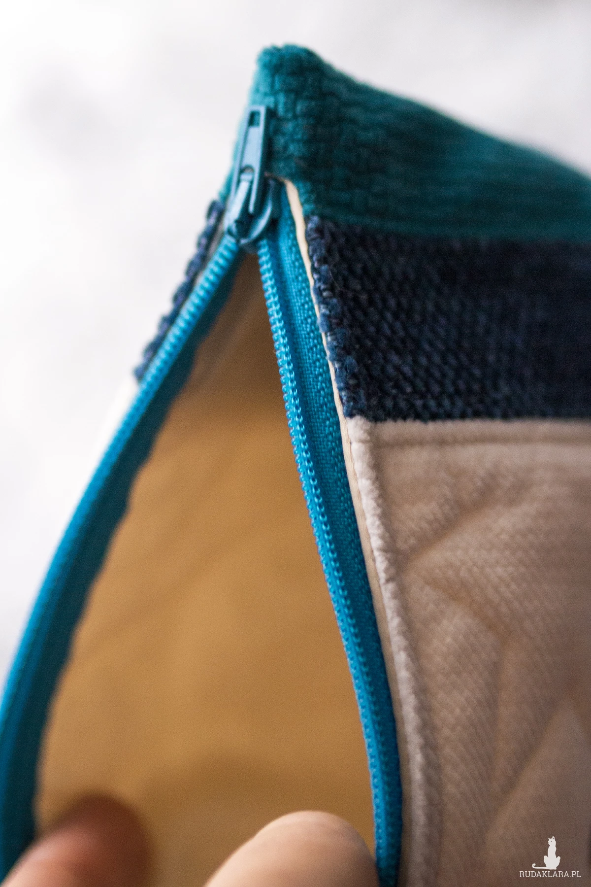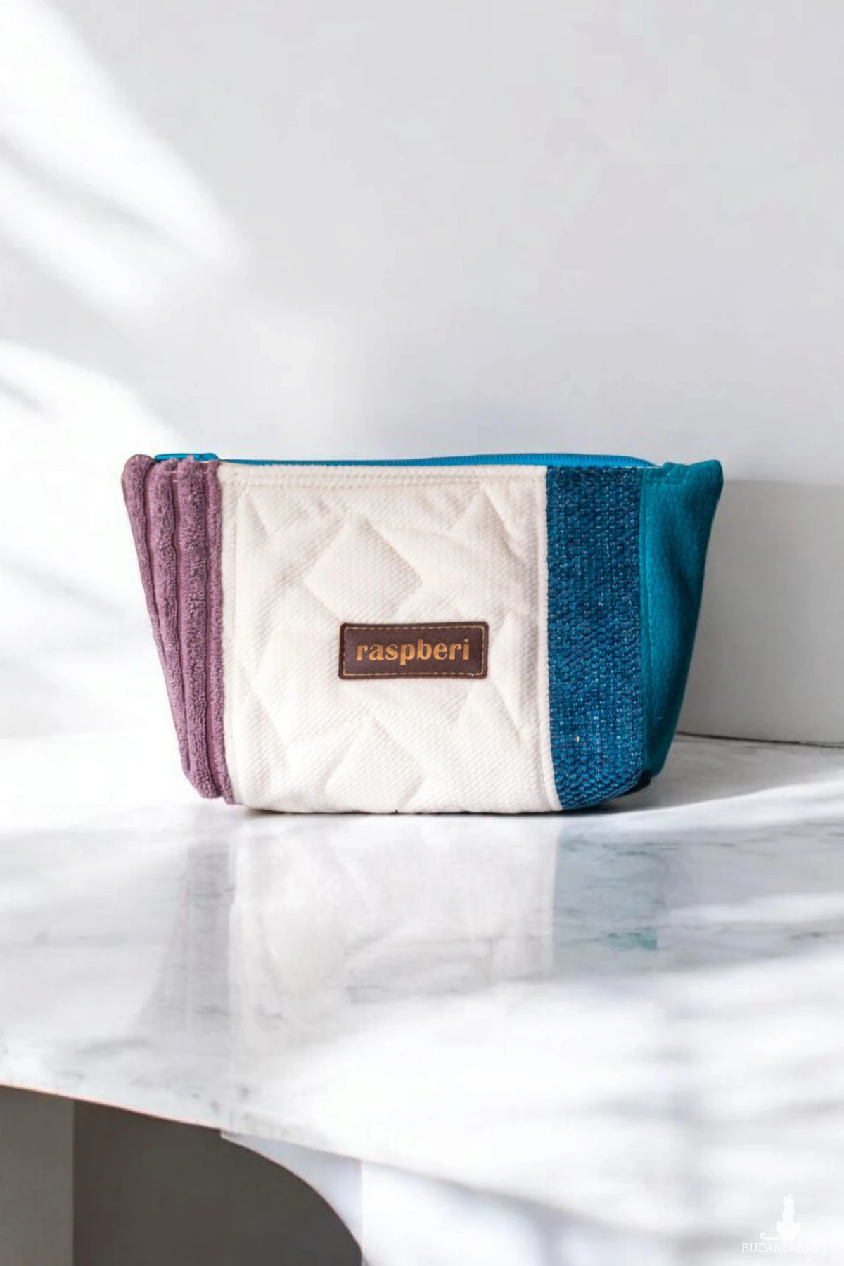 Średniej wielkości kosmetyczka wykonana z kilku rodzajów tkanin. Stworzona w duchu no waste.