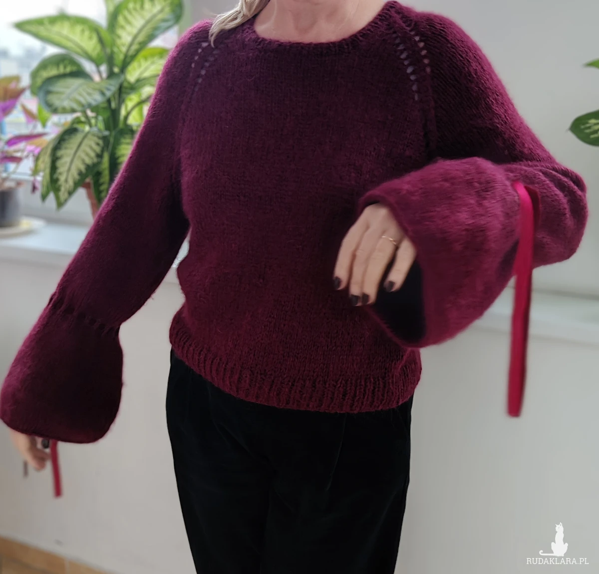Kolor sezonu burgund przepiękny soczysty miły w dotyku lekki z oryginalnymi rękawami ściąganymi na wysokości łokcia aksamitkami tworzy niepowtarzalny charakter swetra.