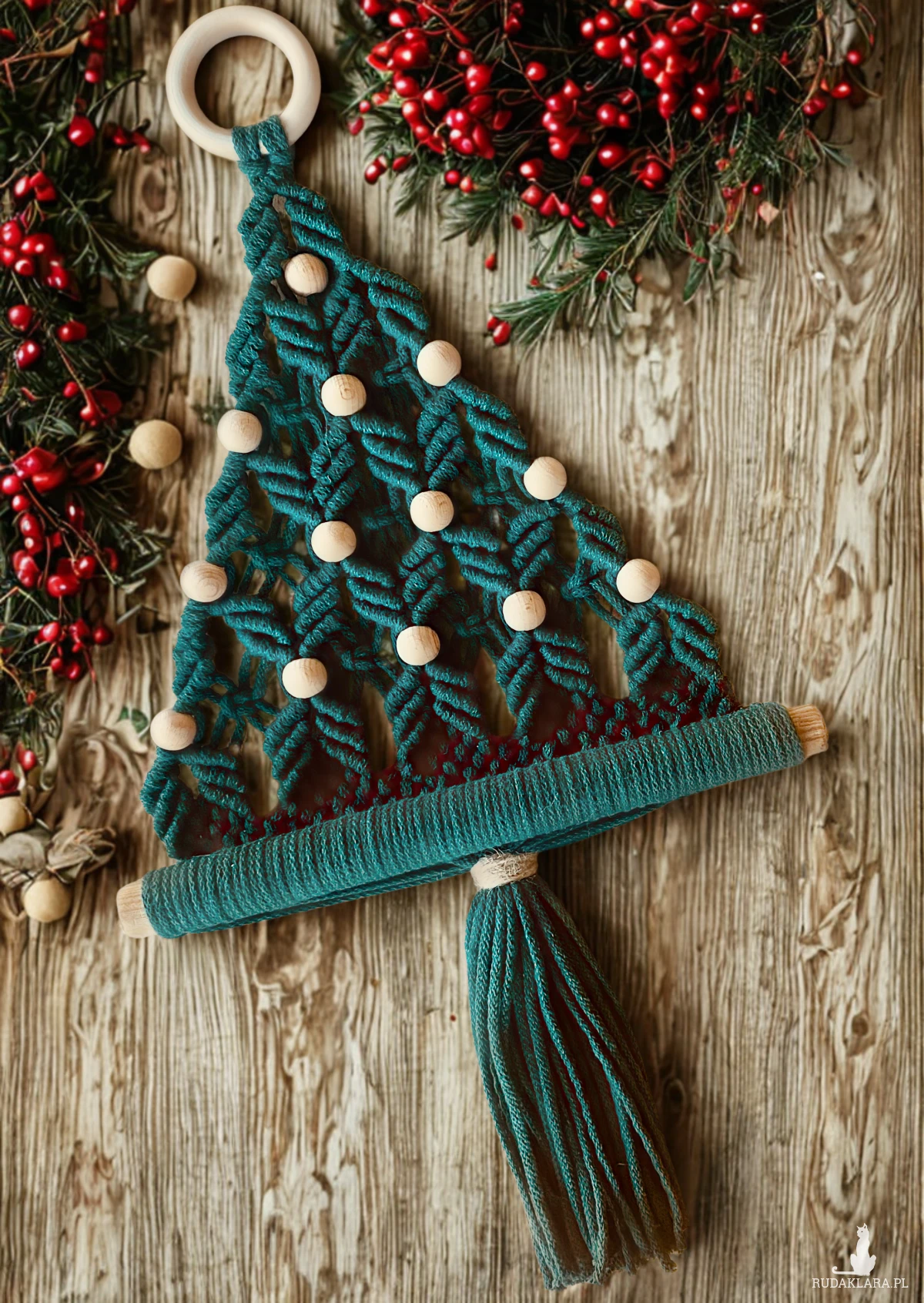 Ta wyjątkowa makramowa choinka została wykonana w całości ręcznie z miękkiego bawełnianego sznurka w głębokim odcieniu butelkowej zieleni. Każdy splot tworzy delikatny, roślinny motyw, a naturalne drewniane koraliki zastępują klasyczne bombki, dodając całości subtelnego, ekologicznego charakteru.