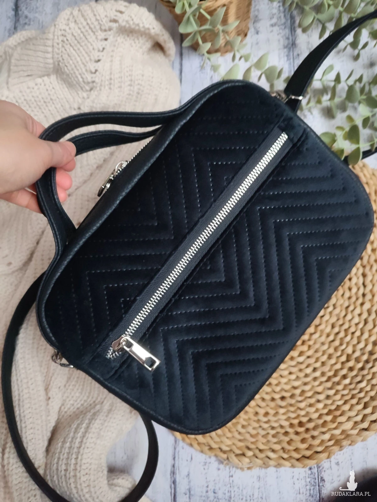 Uszyta jest z połączenia tkanin tkanin o różnych fakturach – ekoskóra, welur.