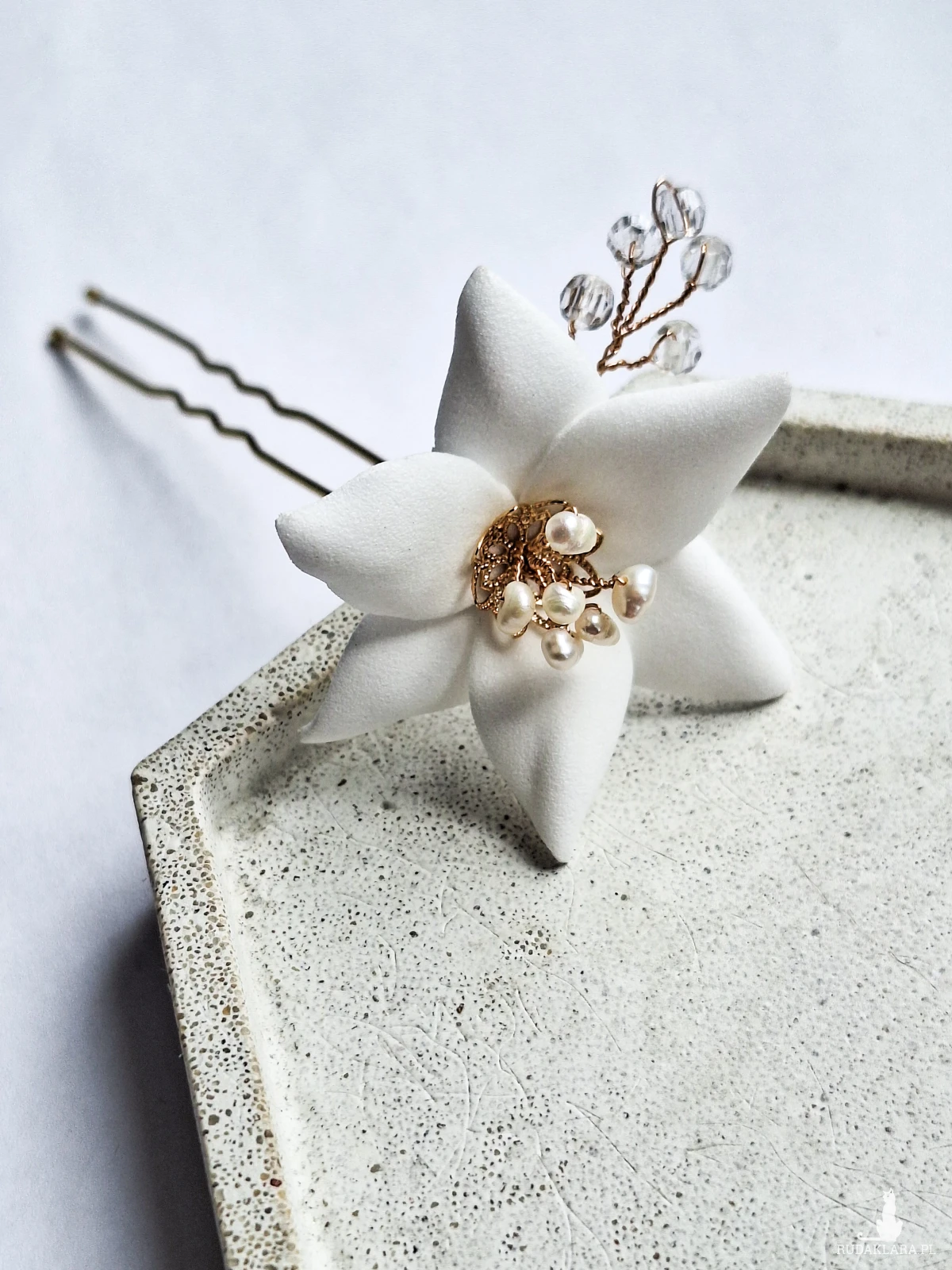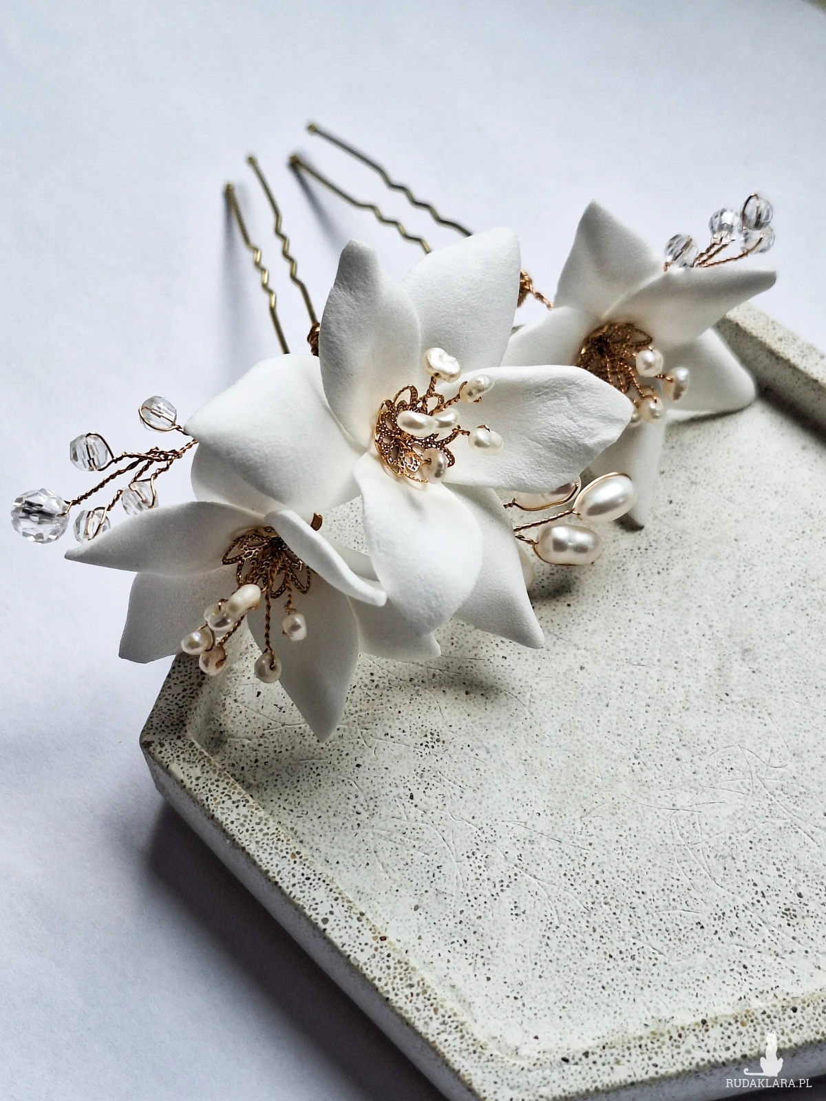 Zestaw ręcznie wykonanych kokówek ślubnych. Delikatna i stylowa ozdoba do włosów, która podkreśli piękno każdej fryzury. Kwiaty z foamiranu zostały uzupełnione o naturalne perły i kryształki, tworząc kompozycję pełną elegancji i subtelnego blasku.
