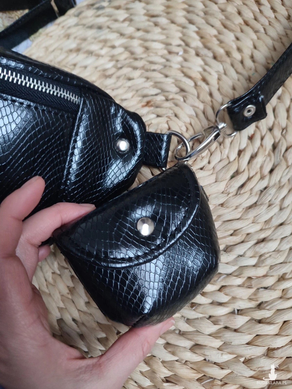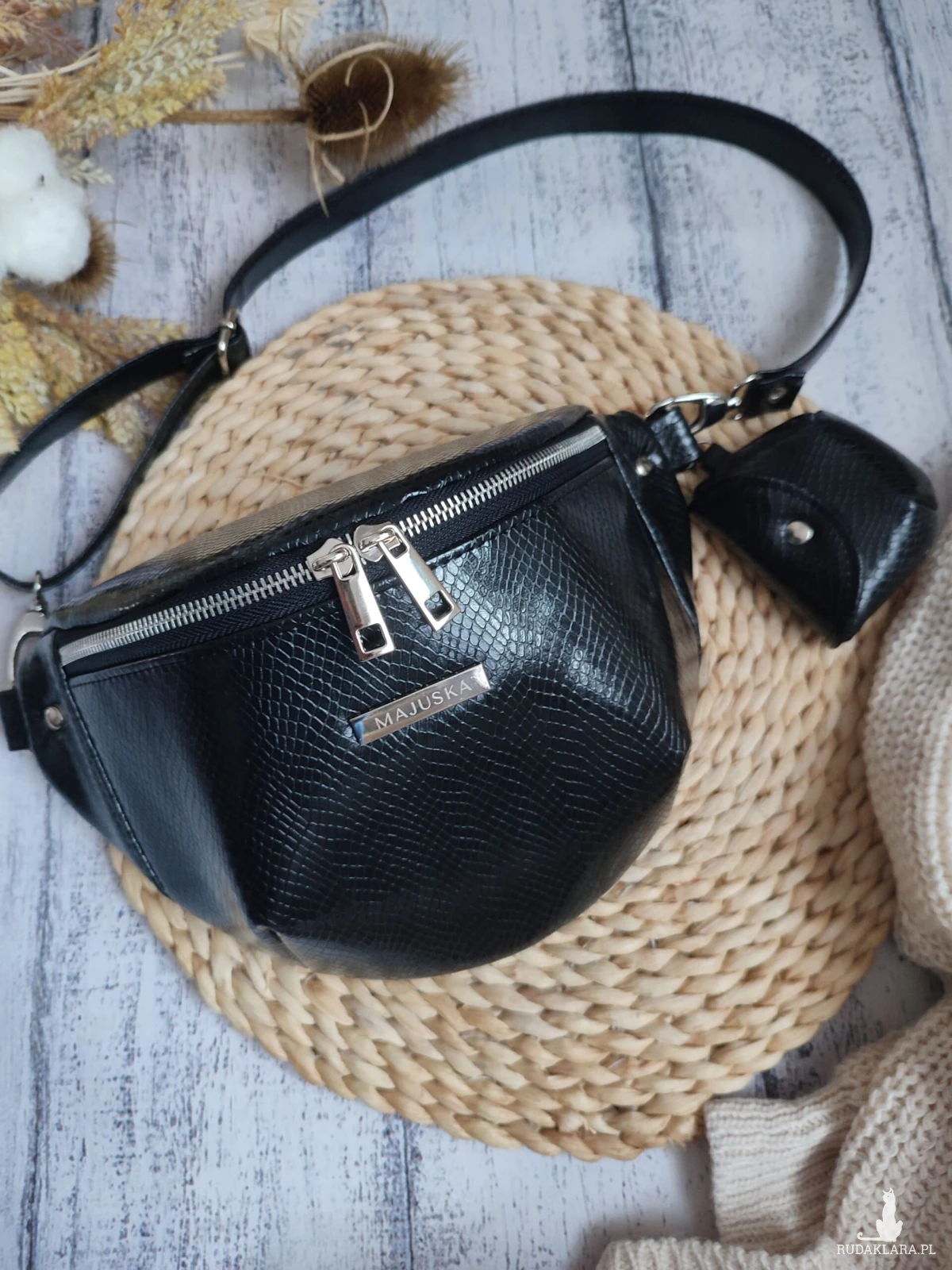 Nerka uszyta z czarnej klakierowanej ekoskóry z tłoczeniem imitującym skórę węża.