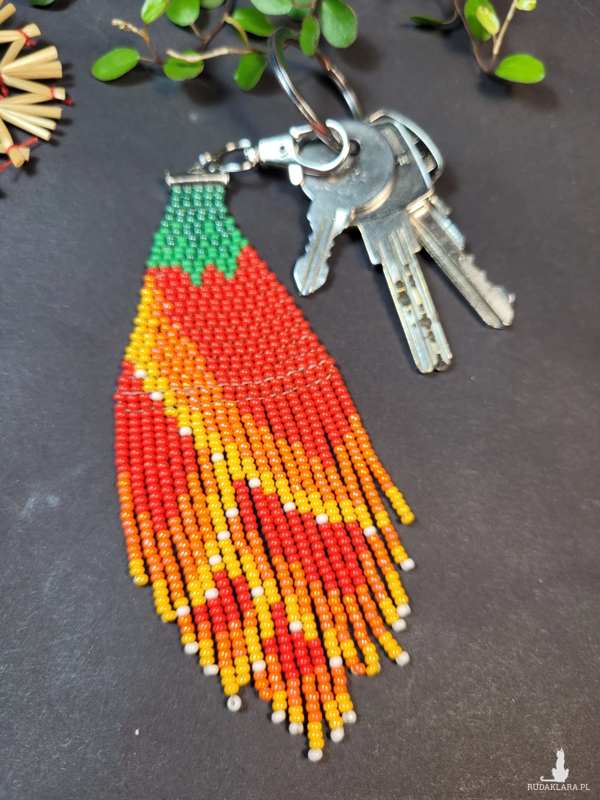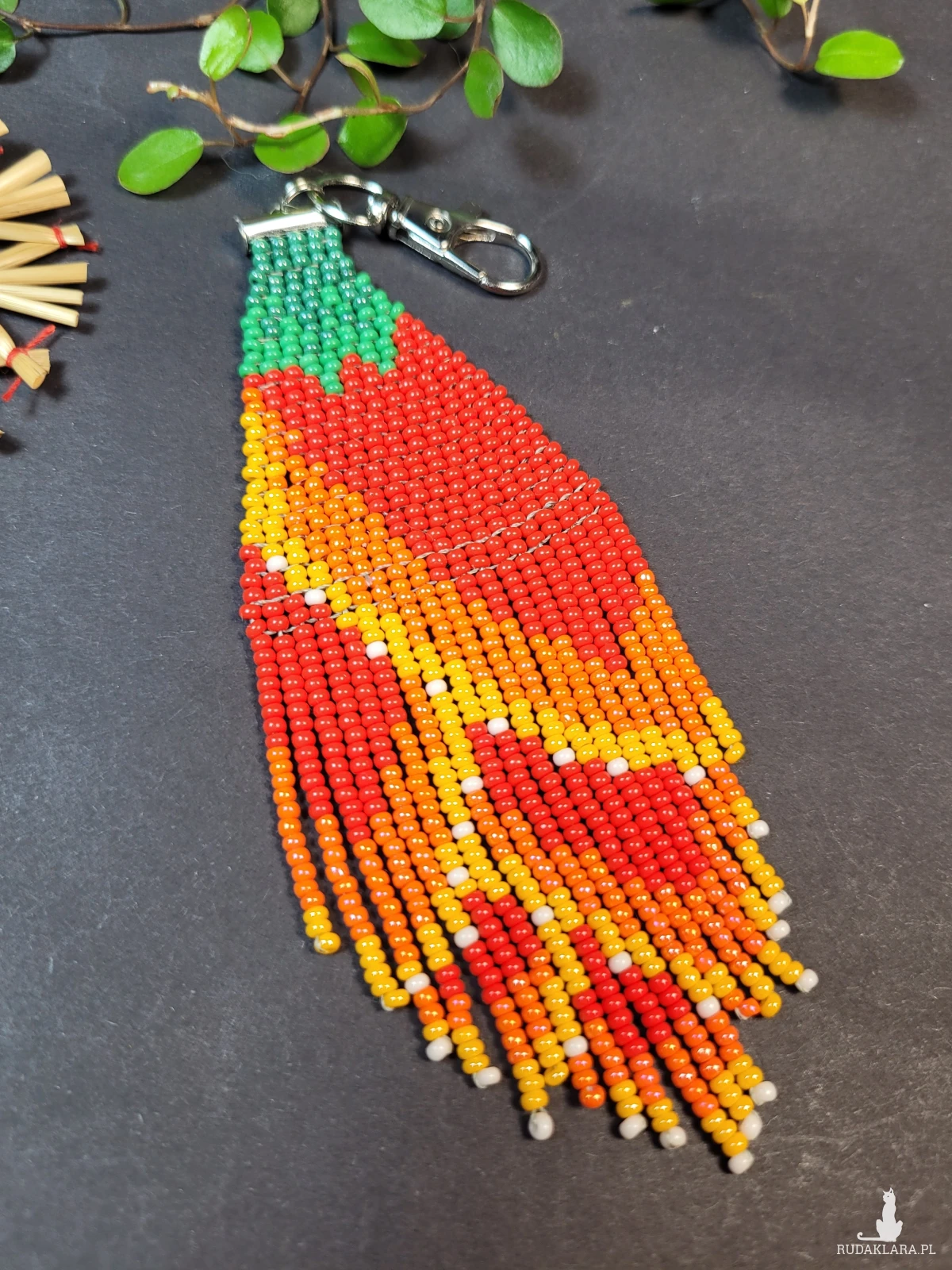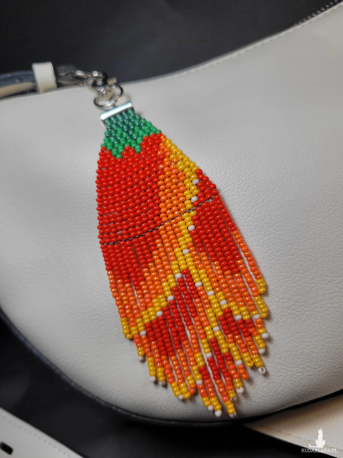 Ręcznie wykonana brelok - zawieszka "Czerwony Kwiat" chwost z drobnych czeskich koralików Preciosa. Intensywna kolorystyka różnych odcieni czerwonego, pomarańczowego, żółtego.