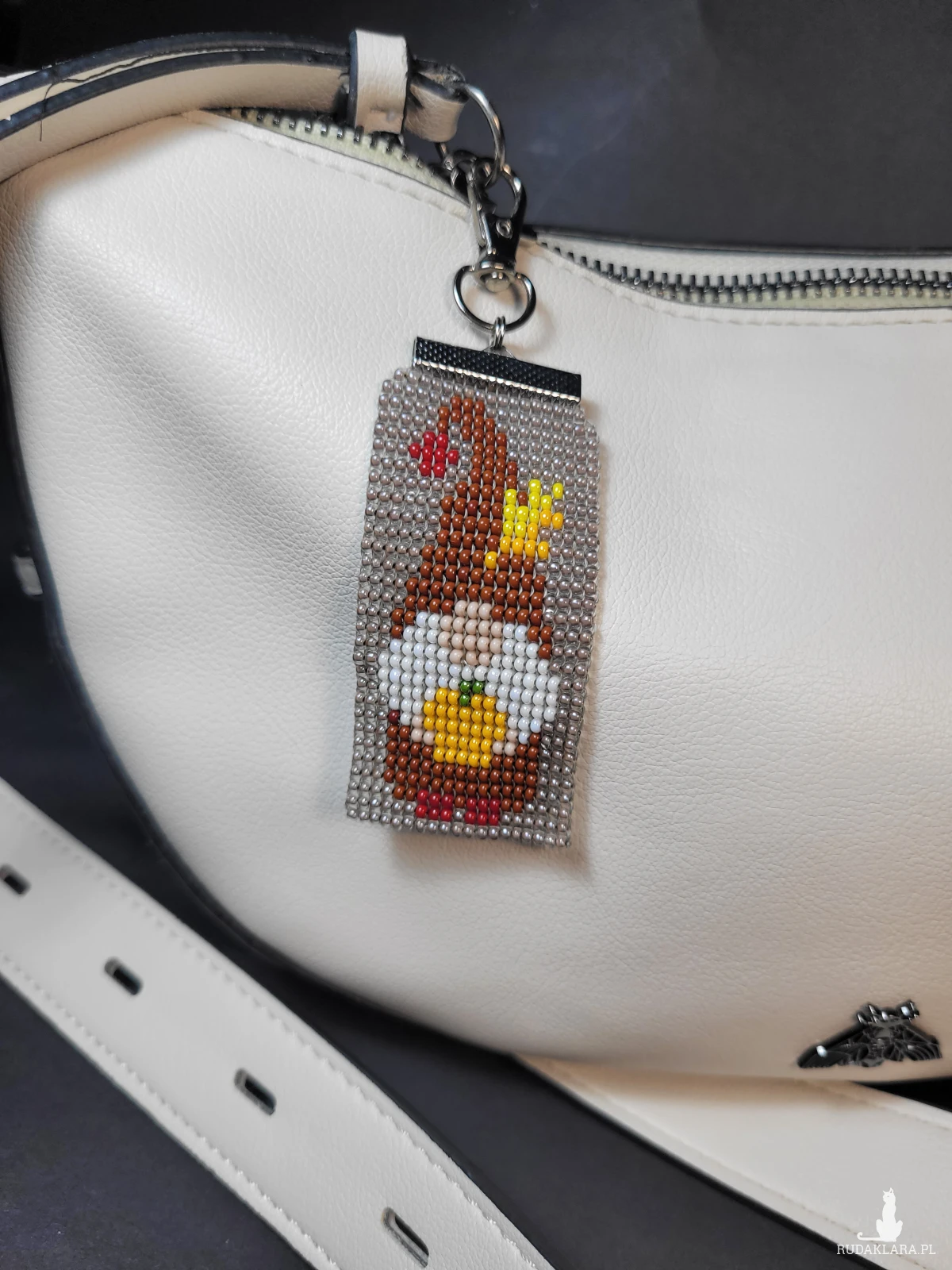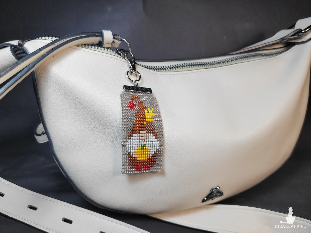 Ręcznie wykonany brelok przedstawiający krasnala trzymającego dynię. Utkany ręcznie z wysokiej jakości czeskich koralików Preciosa.