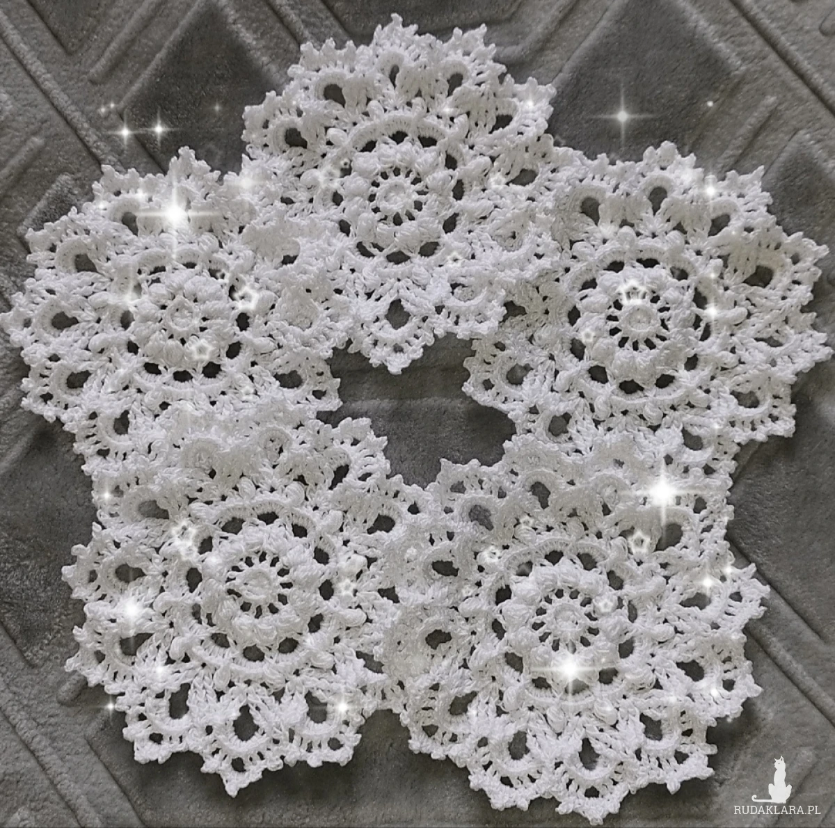 Eleganckie, ażurowe gwiazdki wykonane ręcznie na szydełku z wysokiej jakości białego kordonka. Misterny wzór nadaje im delikatności.