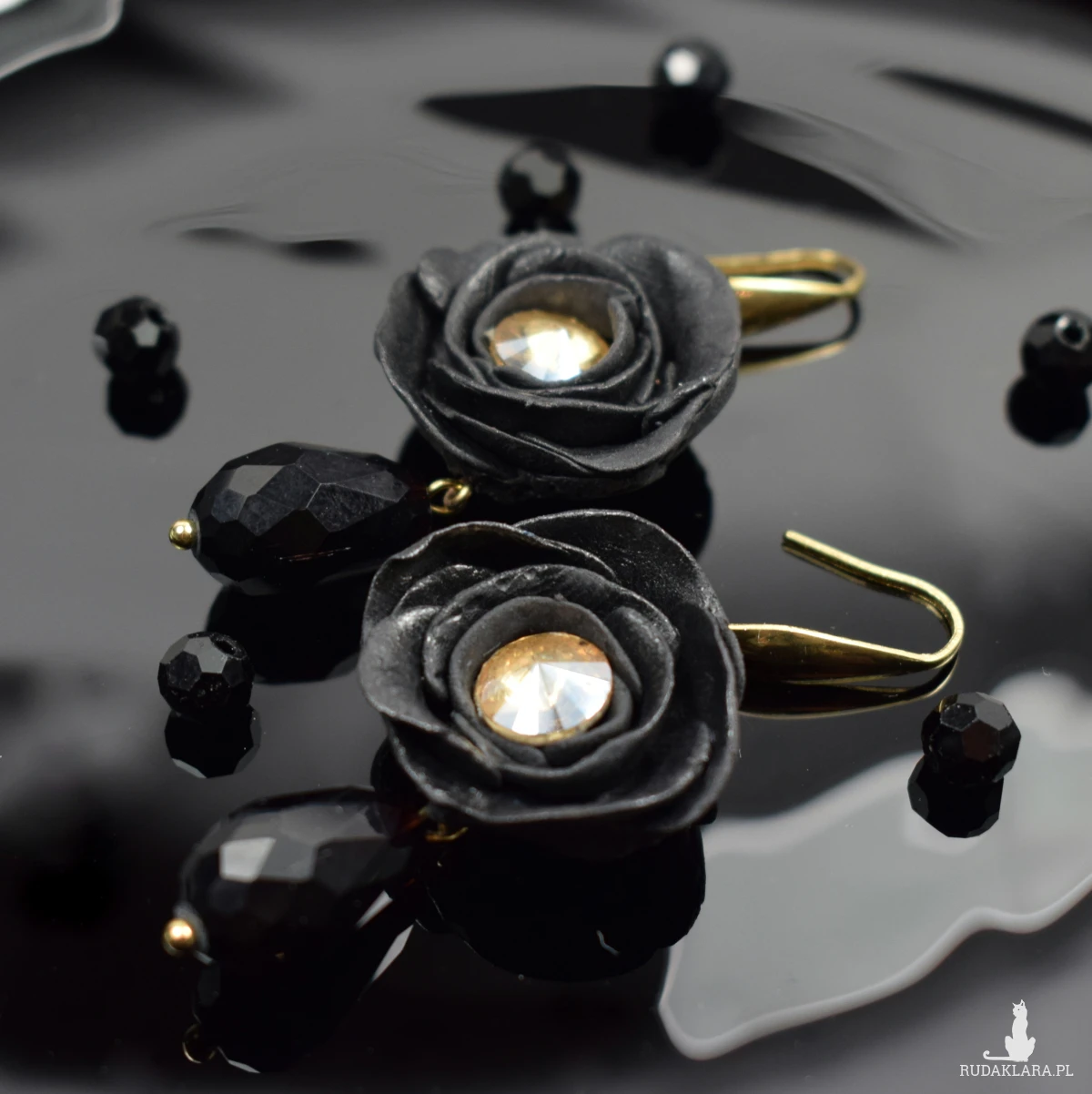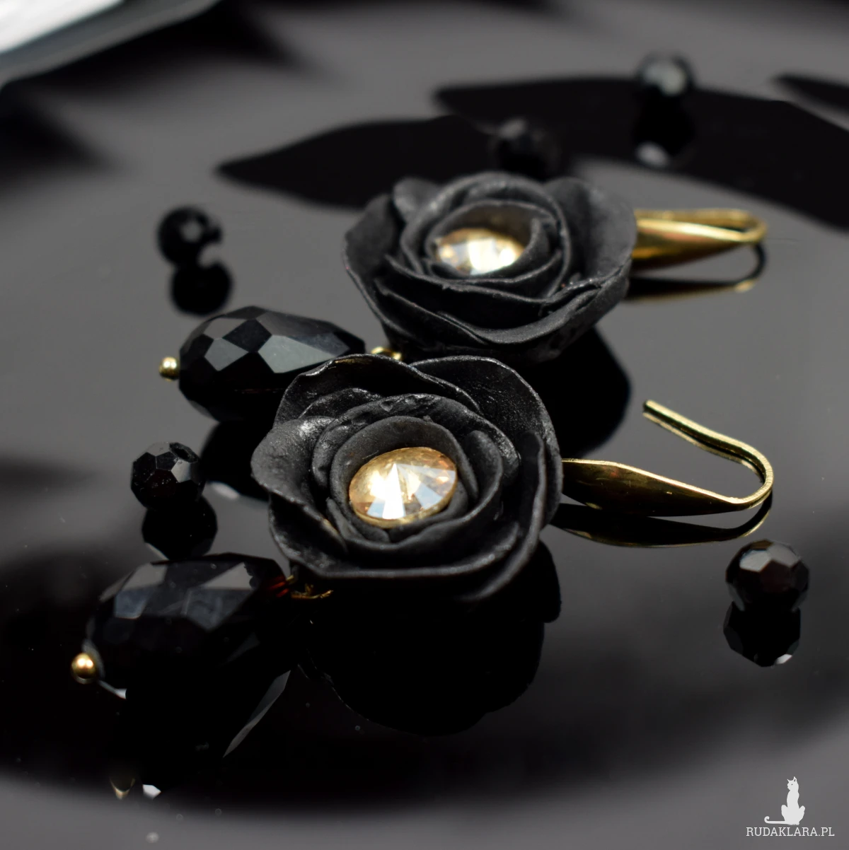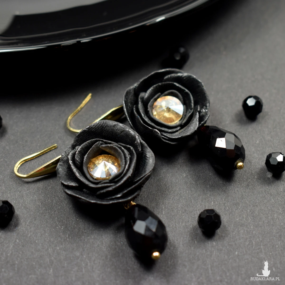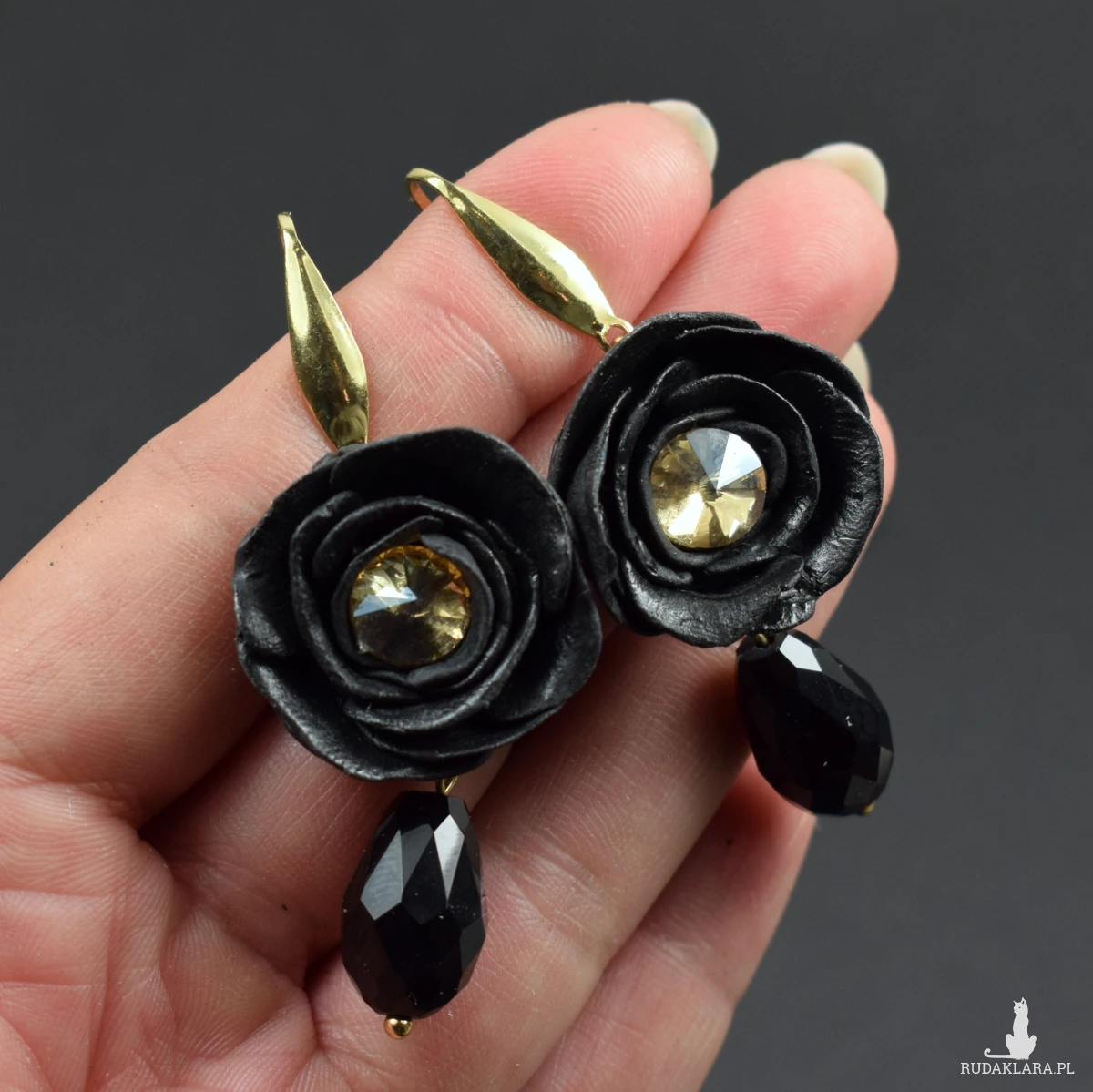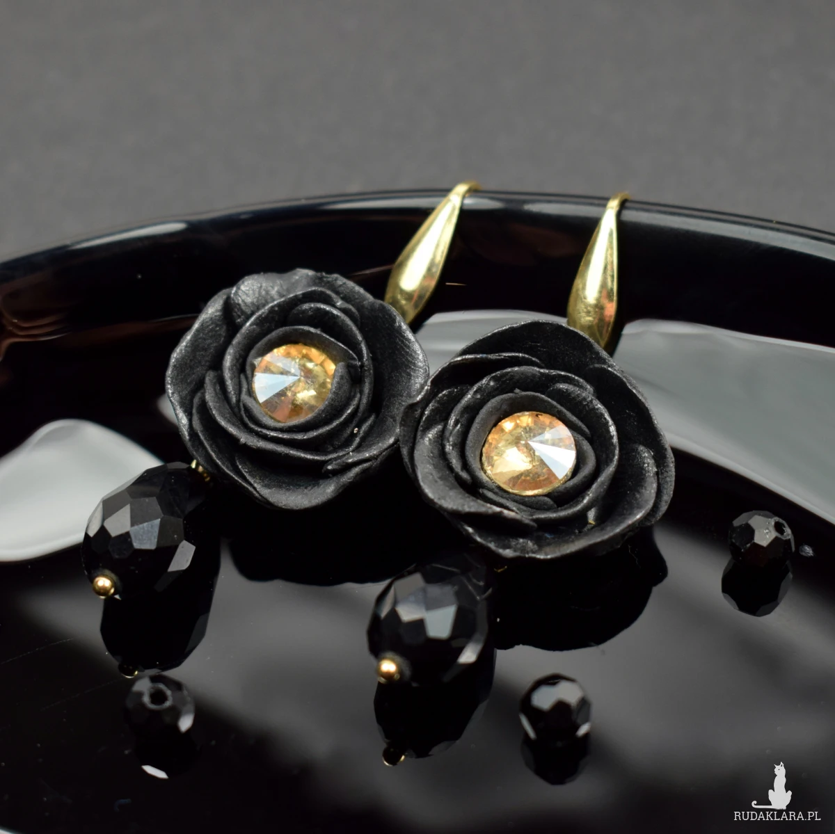 złotym odcieniu. Pod kwiatem zawieszona jest efektowna, czarna szklana