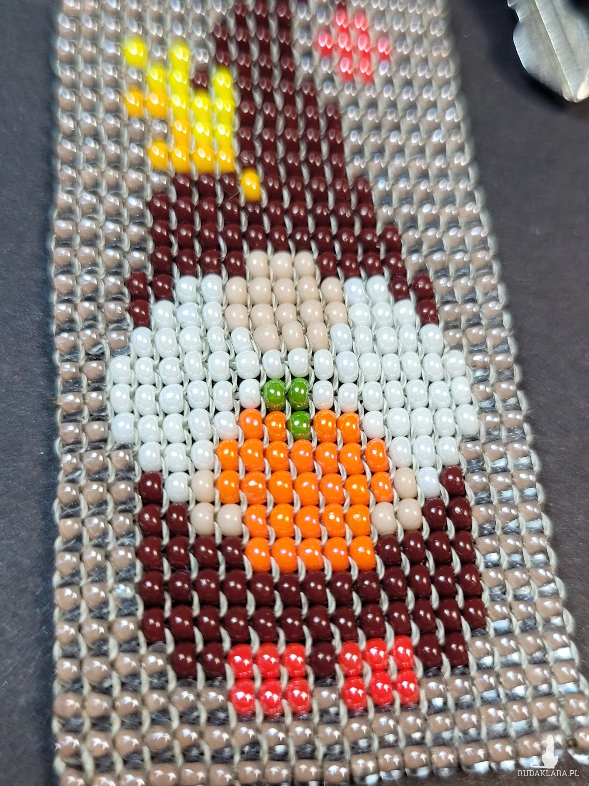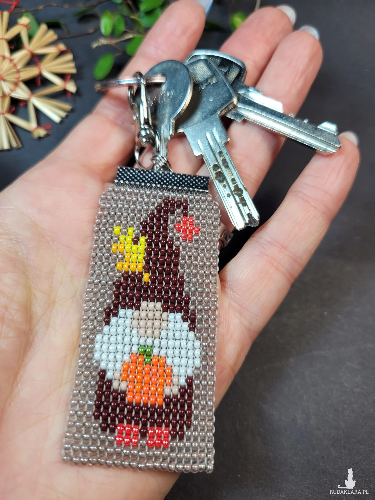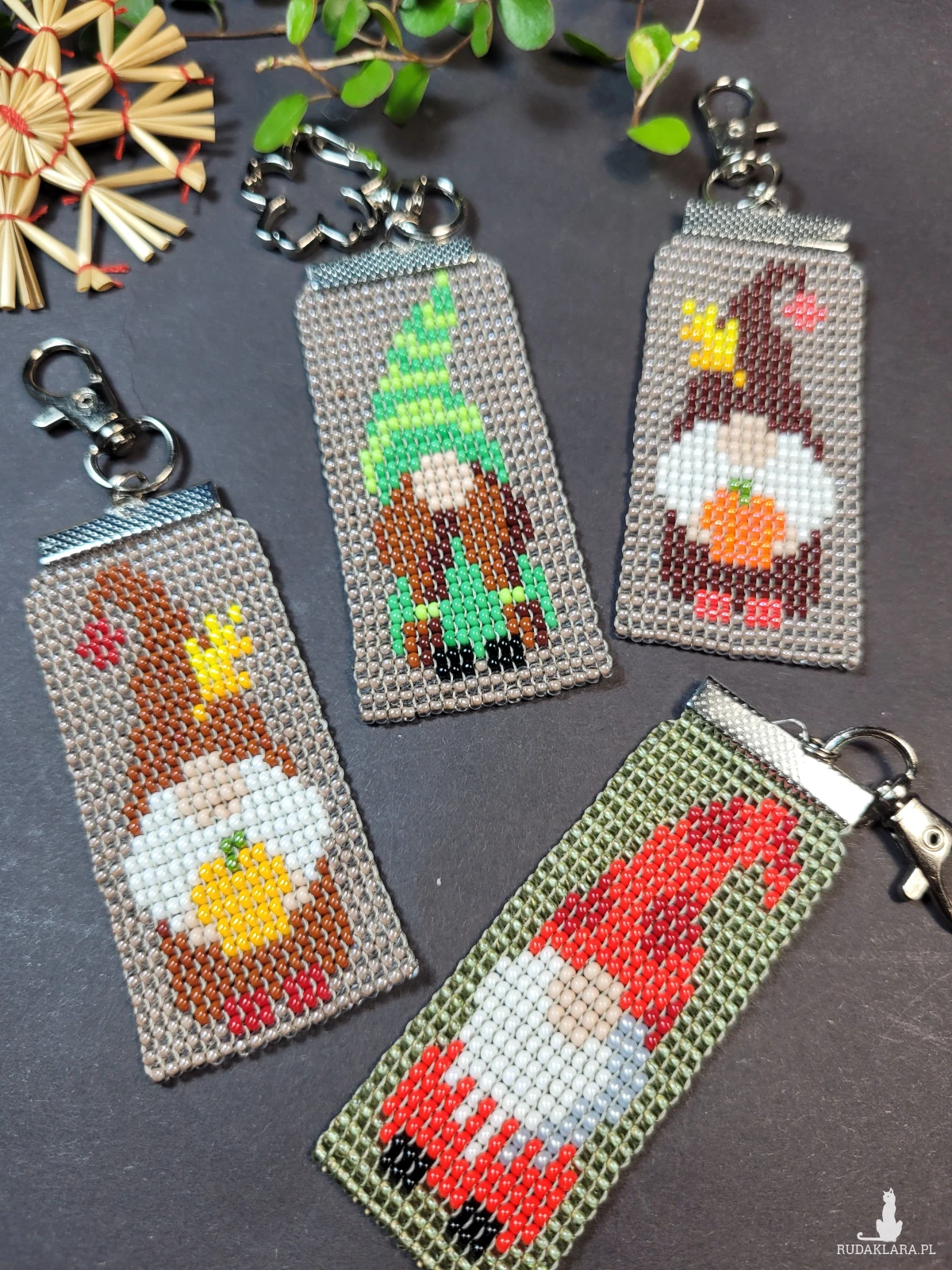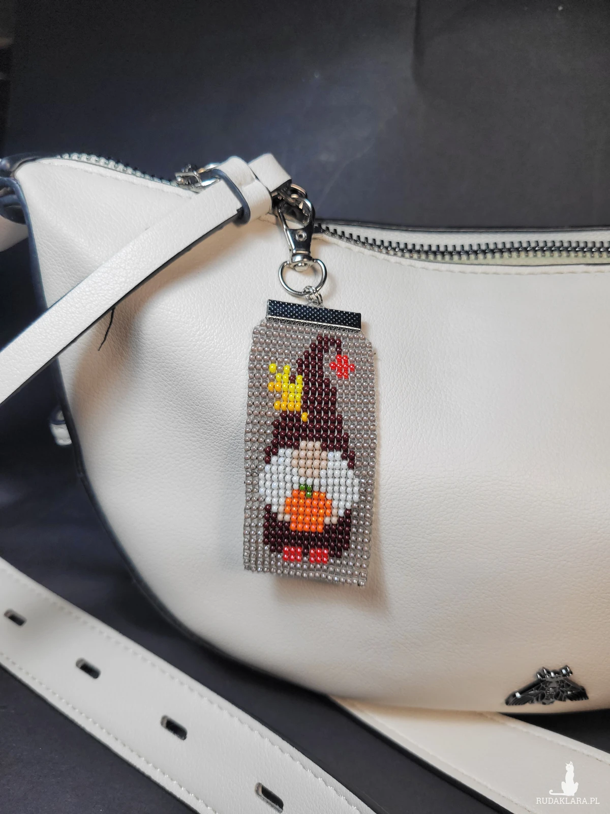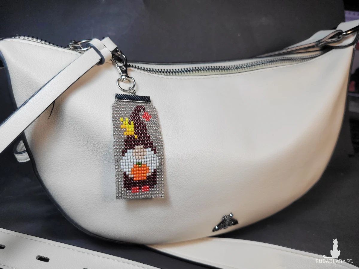 Ręcznie wykonany brelok przedstawiający krasnala w ciemno-brązowym stroju z dyną. Utkany ręcznie z wysokiej jakości czeskich koralików Preciosa.