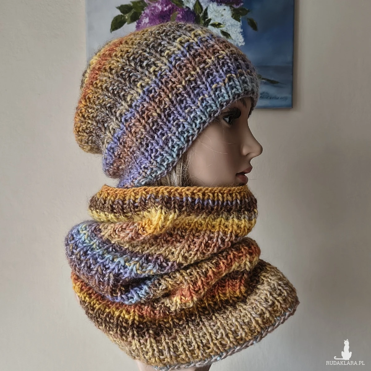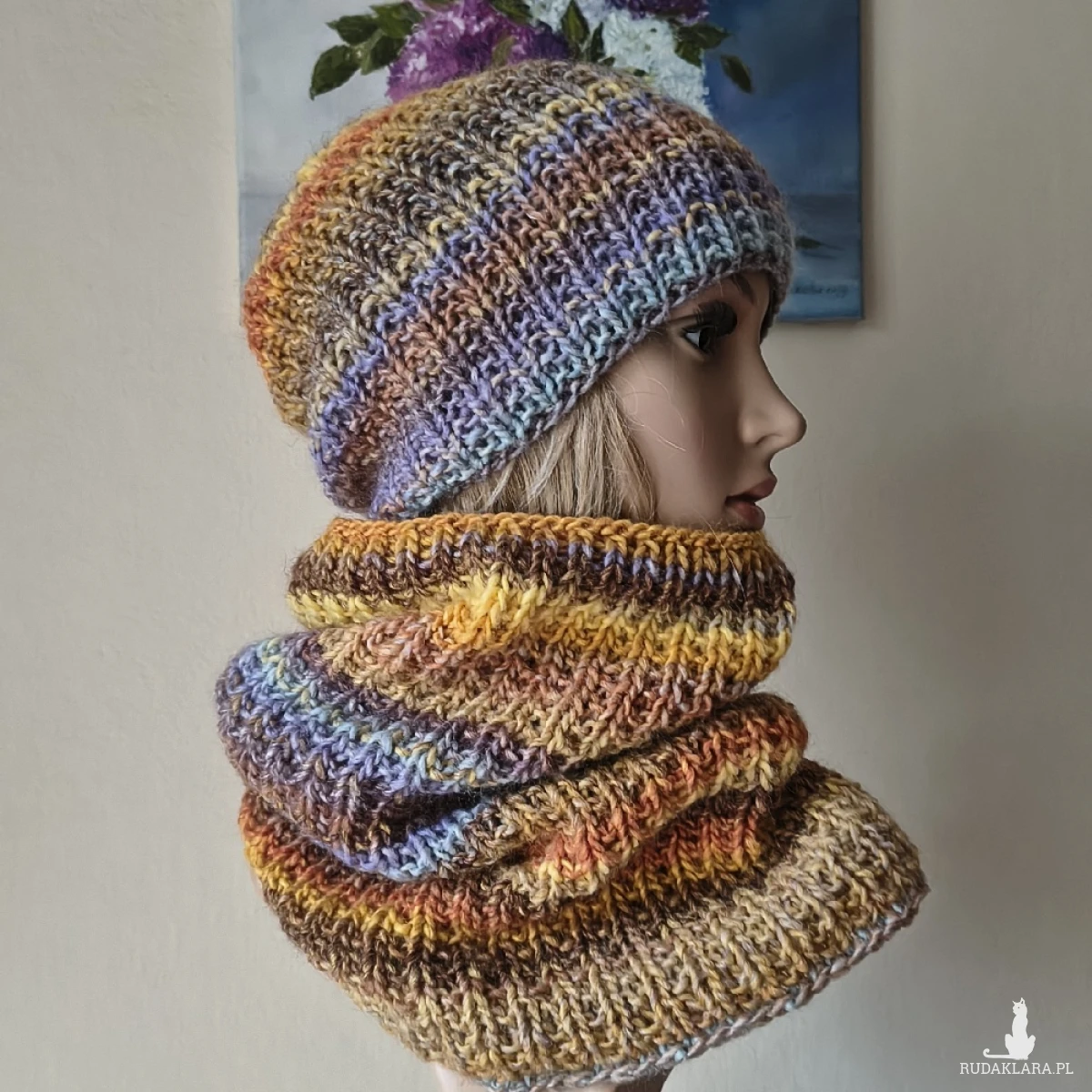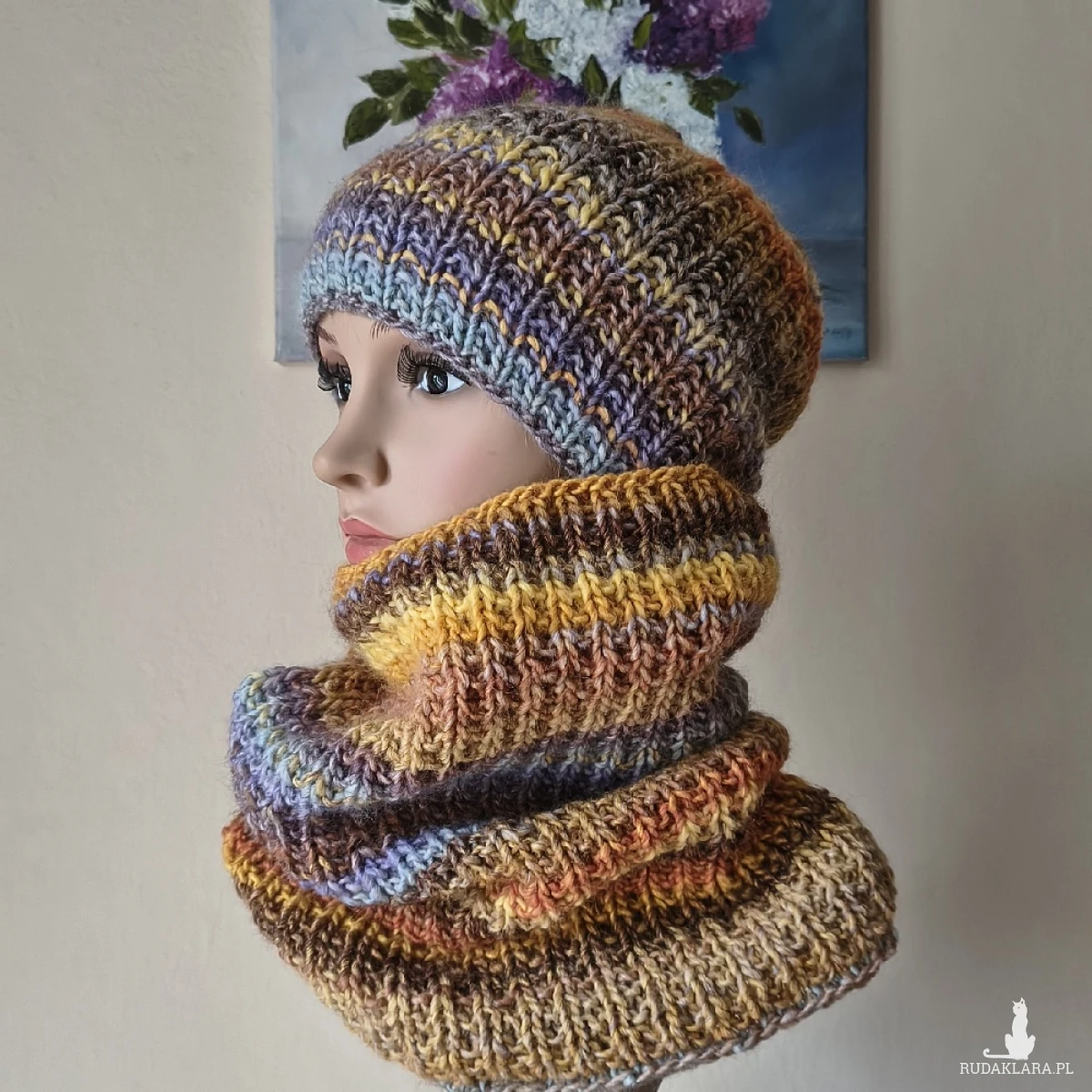 "Zimowe słońce" to kolejny już projekt z mojej autorskiej i bardzo od lat lubianej, kolekcji. Miły, ciepły, lekki bezszwowy komplet (robiony naokoło, a nie zszywany), wykonany jest ręcznie na drutach z doskonałej hiszpańskiej włóczki o składzie: 53% wełna, 47% akryl. Włóczka jest delikatna, przyjemna dla skóry, a gama kolorystyczna interesująca i bardzo twarzowa. Komplet doskonale ochroni przed zimnem, doda też charakteru różnym stylizacjom. Jest otulający, mięsisty i świetnie się układa. Wymiary: czapka dł. 23,5 cm, polecam dla obwodów głowy 56-58 cm., komin szer. 48 cm (góra), 60 cm. (dół), dł. komina 39 cm. Są to wymiary na płasko, bez rozciągania itp. Pranie ręczne.