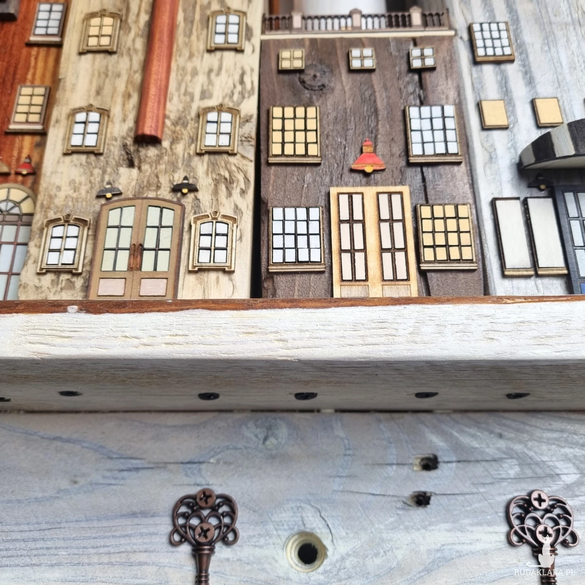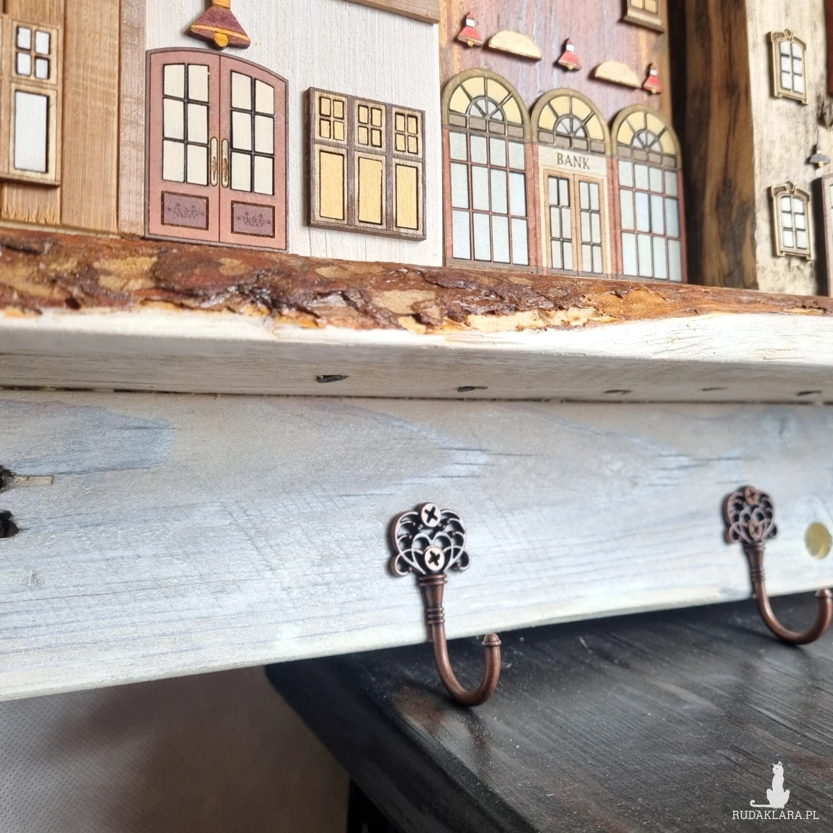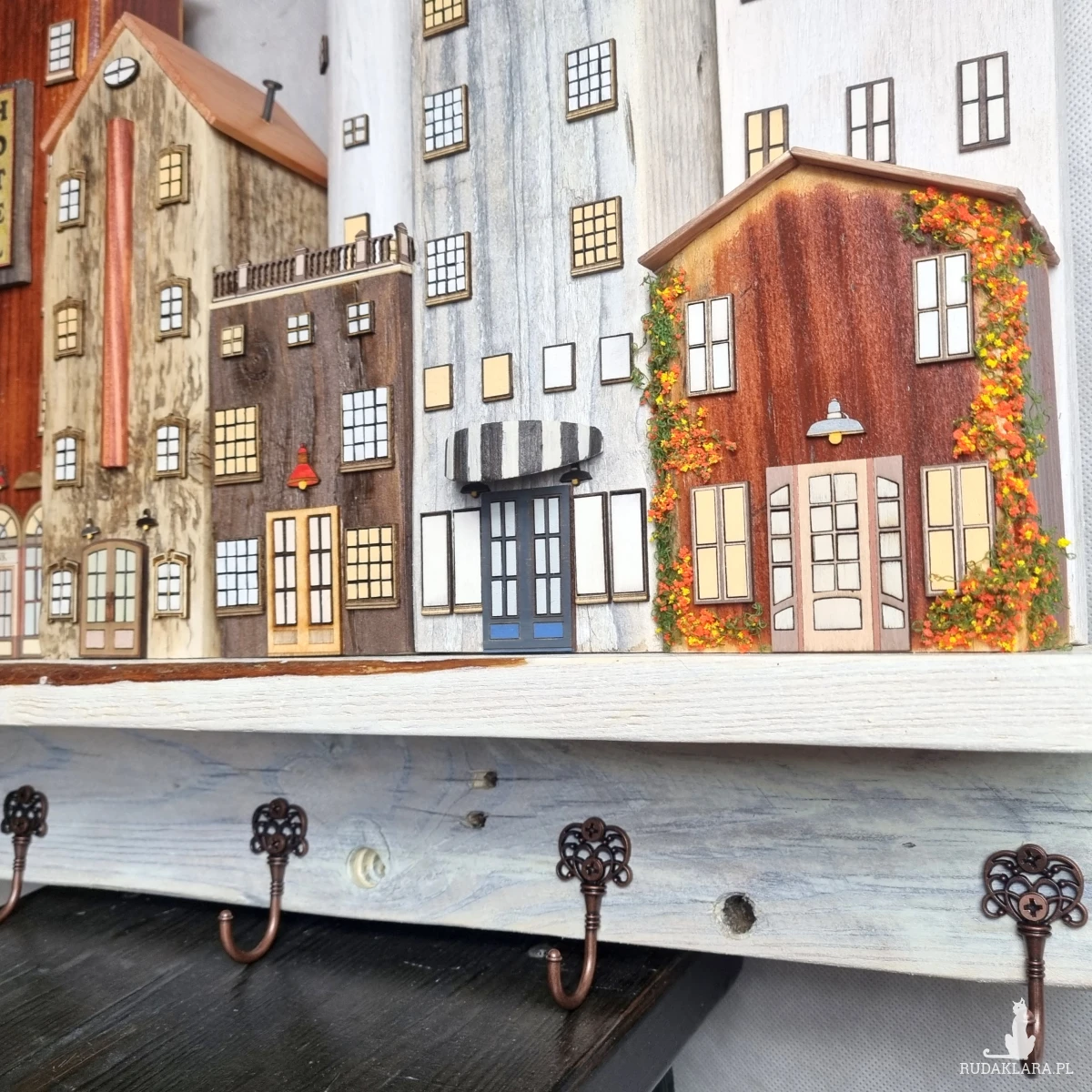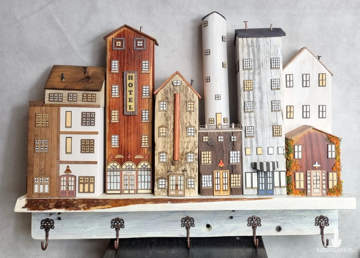 Drewniane domki handmade, mogące służyć jako wieszak na klucze (5), ręczniki inne drobiazgi. Domki wykonane desek ze starych palet z odzysku. Drewno bejcowane, woskowane, malowane w różnych odcieniach - ładnie podkreślające starość drewna - malowane bezbarwną farbą akrylową. Drewniane, wycinane okna i drzwi, również inne detale. Długość 60 cm, wysokość 45 cm, grubość 10 cm . Całość do zawieszenia na ścianie na 2 hakach. (5)
