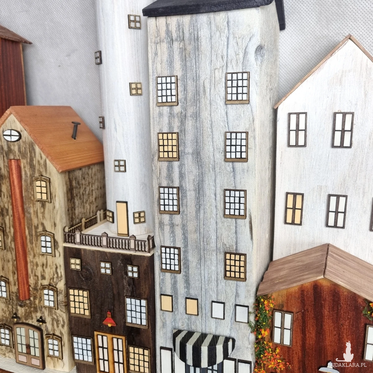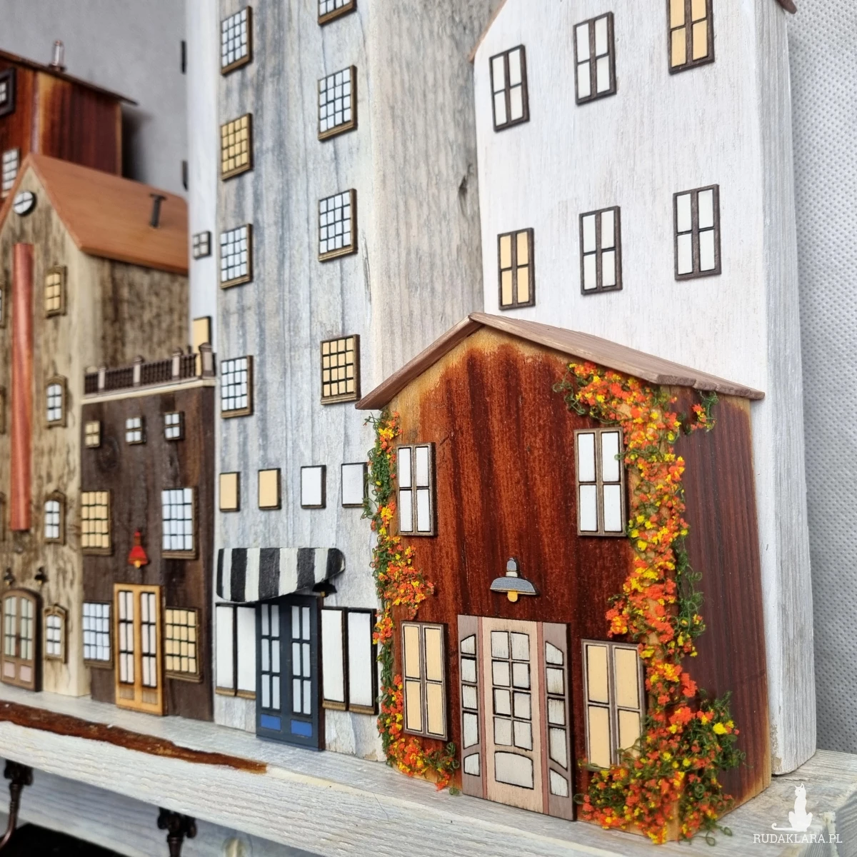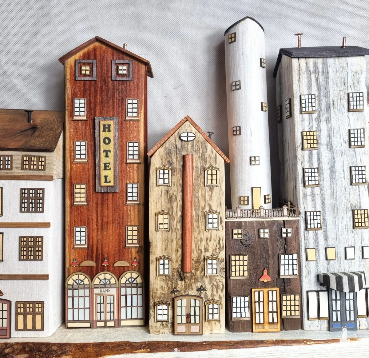 Drewniane domki handmade, mogące służyć jako wieszak na klucze (5), ręczniki inne drobiazgi. Domki wykonane desek ze starych palet z odzysku. Drewno bejcowane, woskowane, malowane w różnych odcieniach - ładnie podkreślające starość drewna - malowane bezbarwną farbą akrylową. Drewniane, wycinane okna i drzwi, również inne detale. Długość 60 cm, wysokość 45 cm, grubość 10 cm . Całość do zawieszenia na ścianie na 2 hakach. (5)