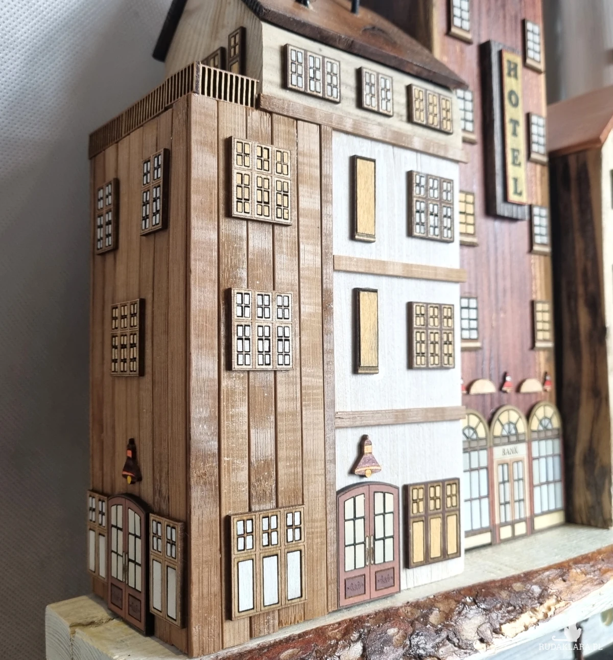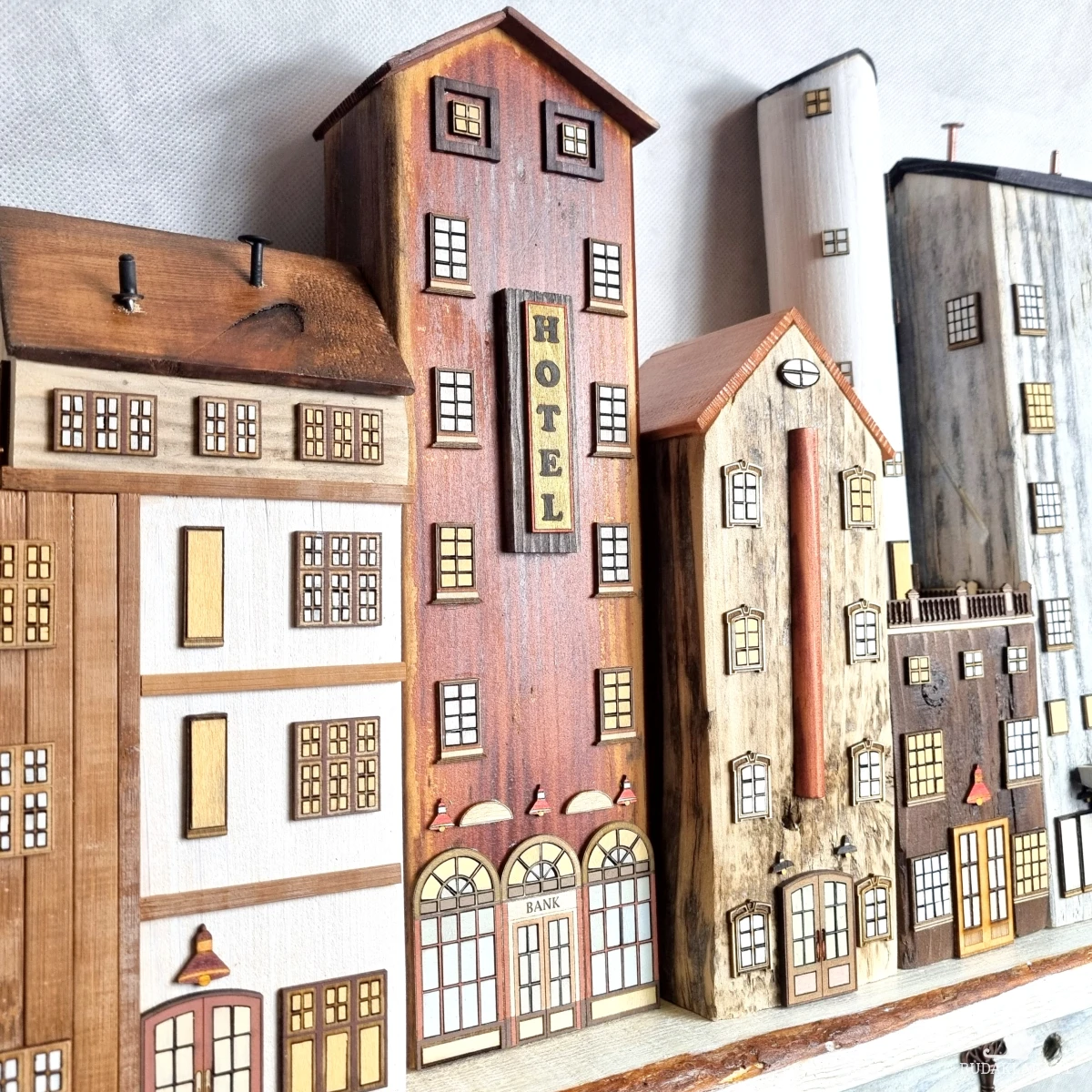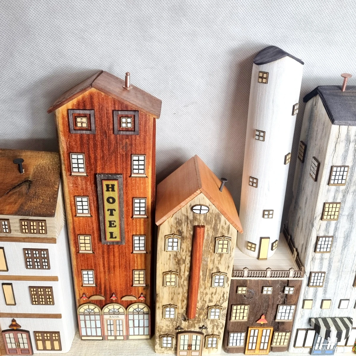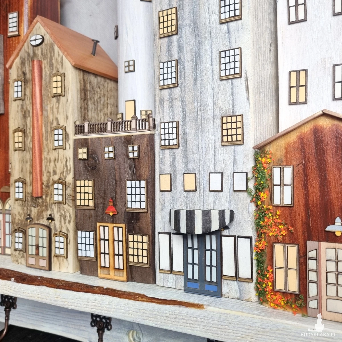 Drewniane domki handmade, mogące służyć jako wieszak na klucze (5), ręczniki inne drobiazgi. Domki wykonane desek ze starych palet z odzysku. Drewno bejcowane, woskowane, malowane w różnych odcieniach - ładnie podkreślające starość drewna - malowane bezbarwną farbą akrylową. Drewniane, wycinane okna i drzwi, również inne detale. Długość 60 cm, wysokość 45 cm, grubość 10 cm . Całość do zawieszenia na ścianie na 2 hakach. (5)