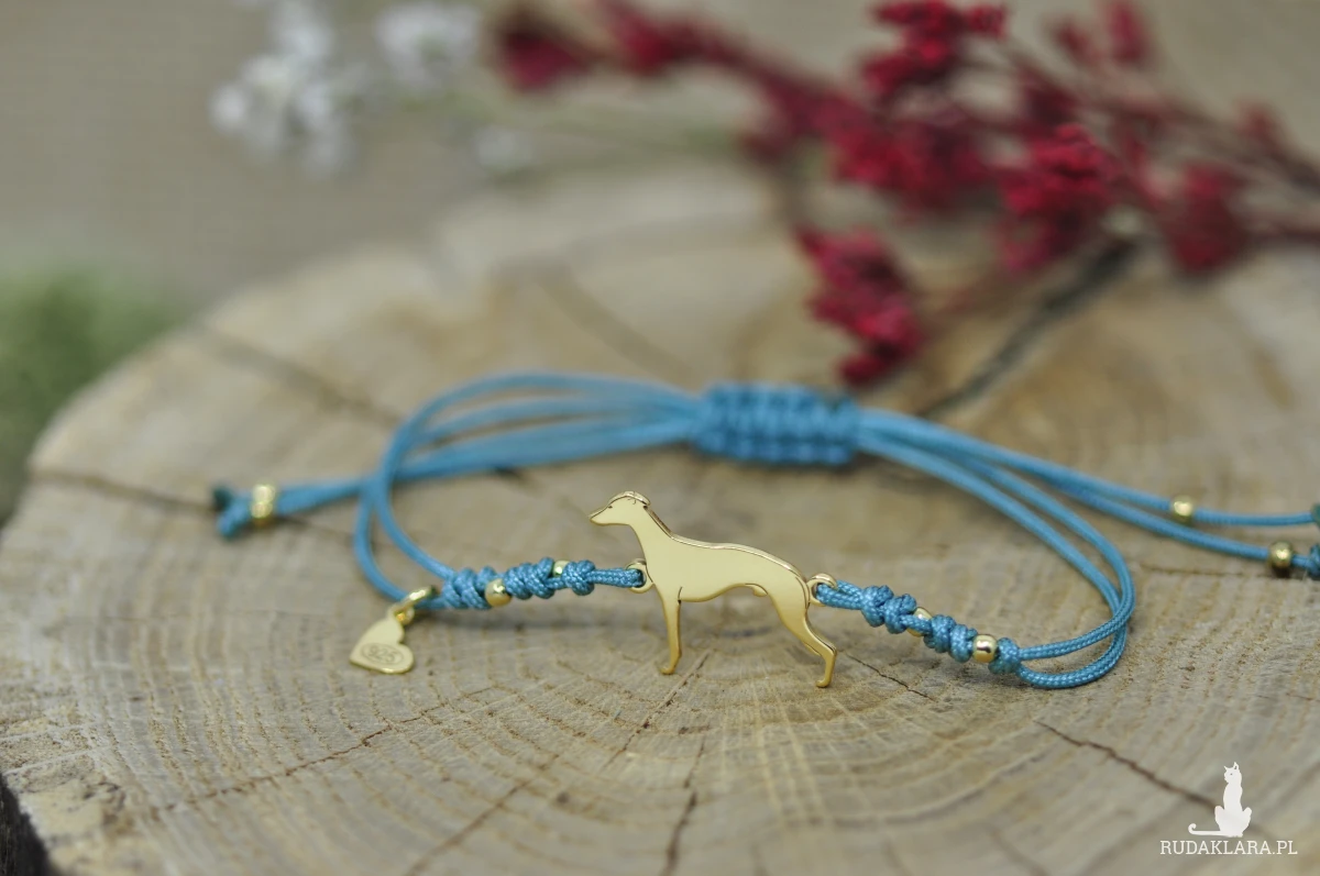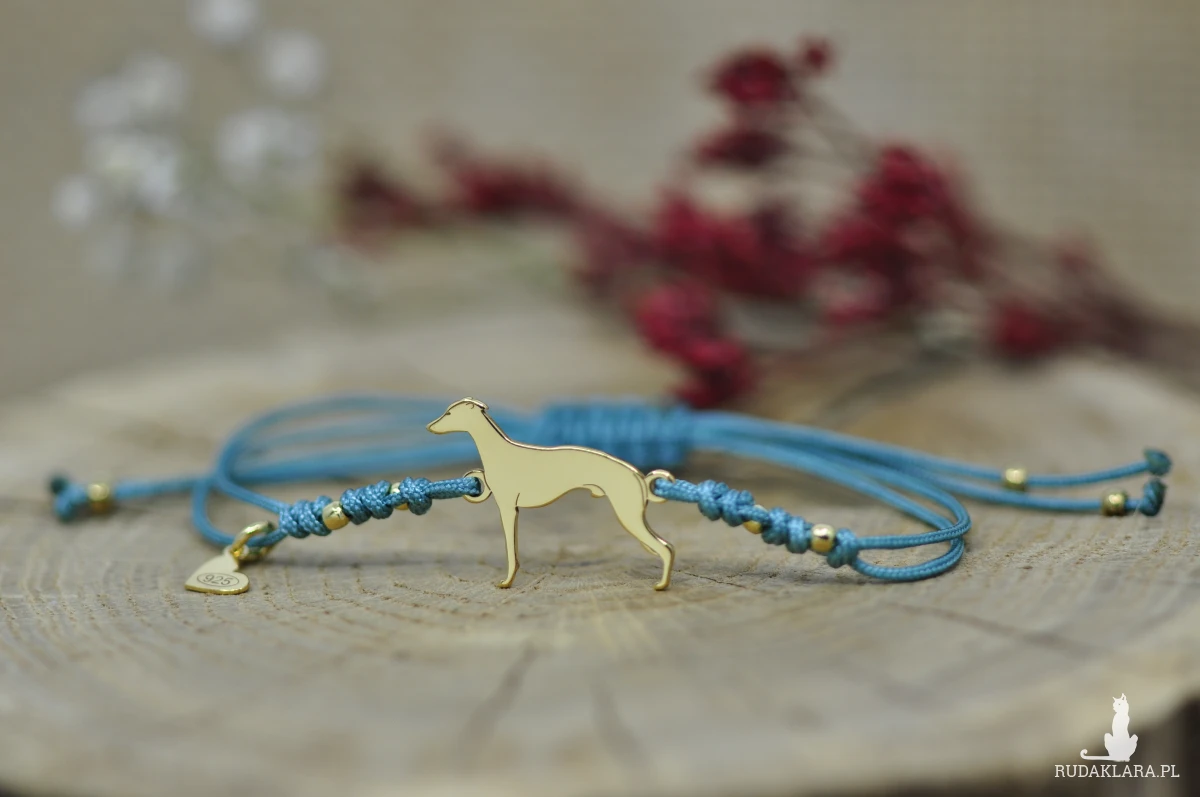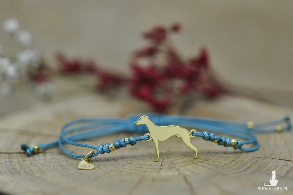 Whippet wykonany ze srebrnej blachy próby 925, wymiary pieska: 20 x 15 mm, grubość 0,8 mm oraz srebrne kulki.