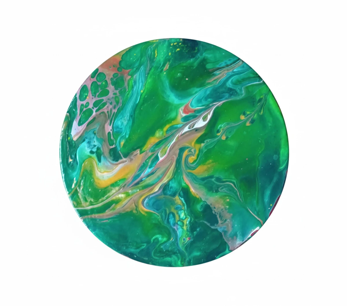 Stworzony techniką acrylic pouring, jest absolutnie wyjątkowy -każdy egzemplarz to niepowtarzalna kompozycja kolorów i wzorów.