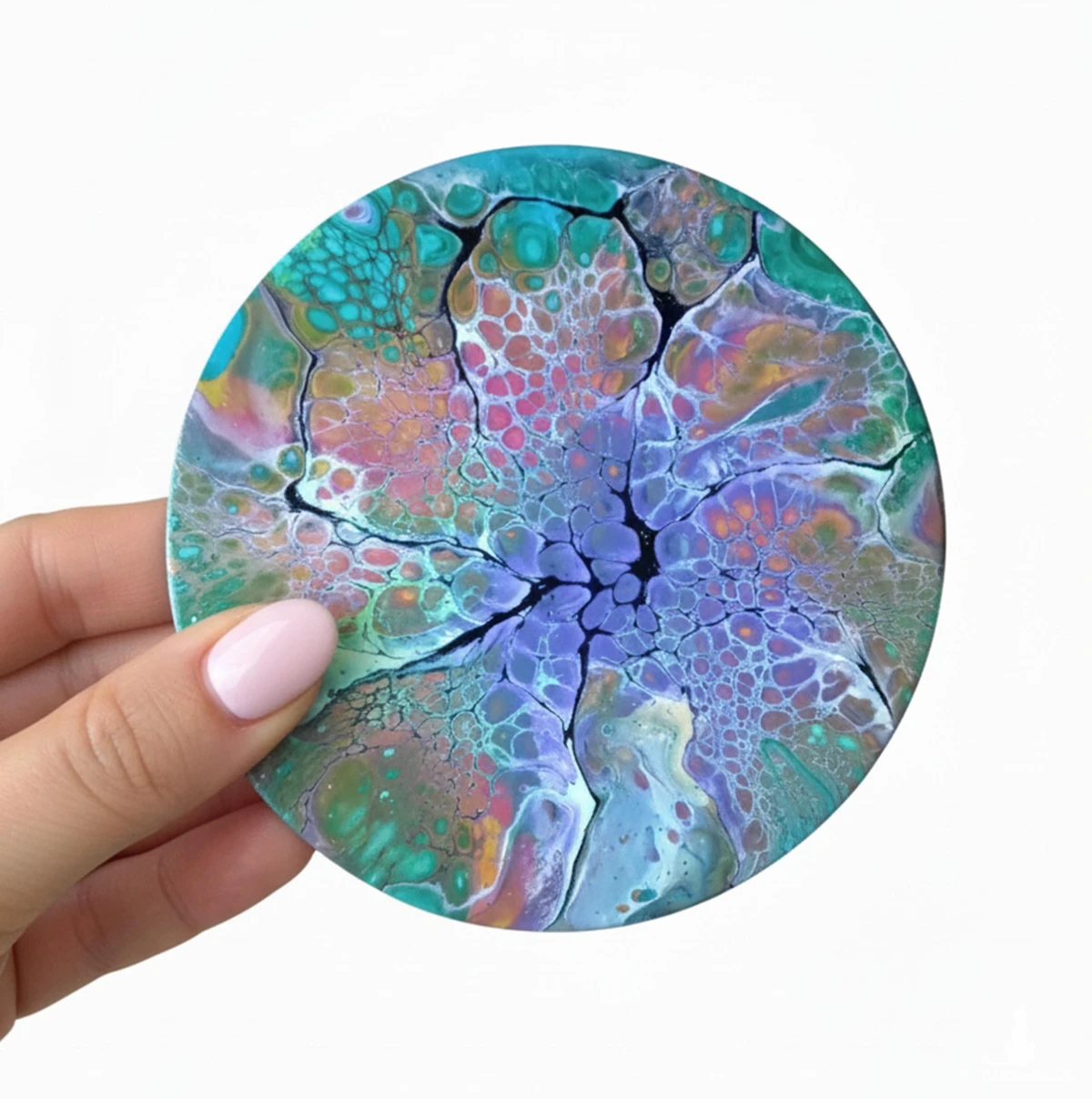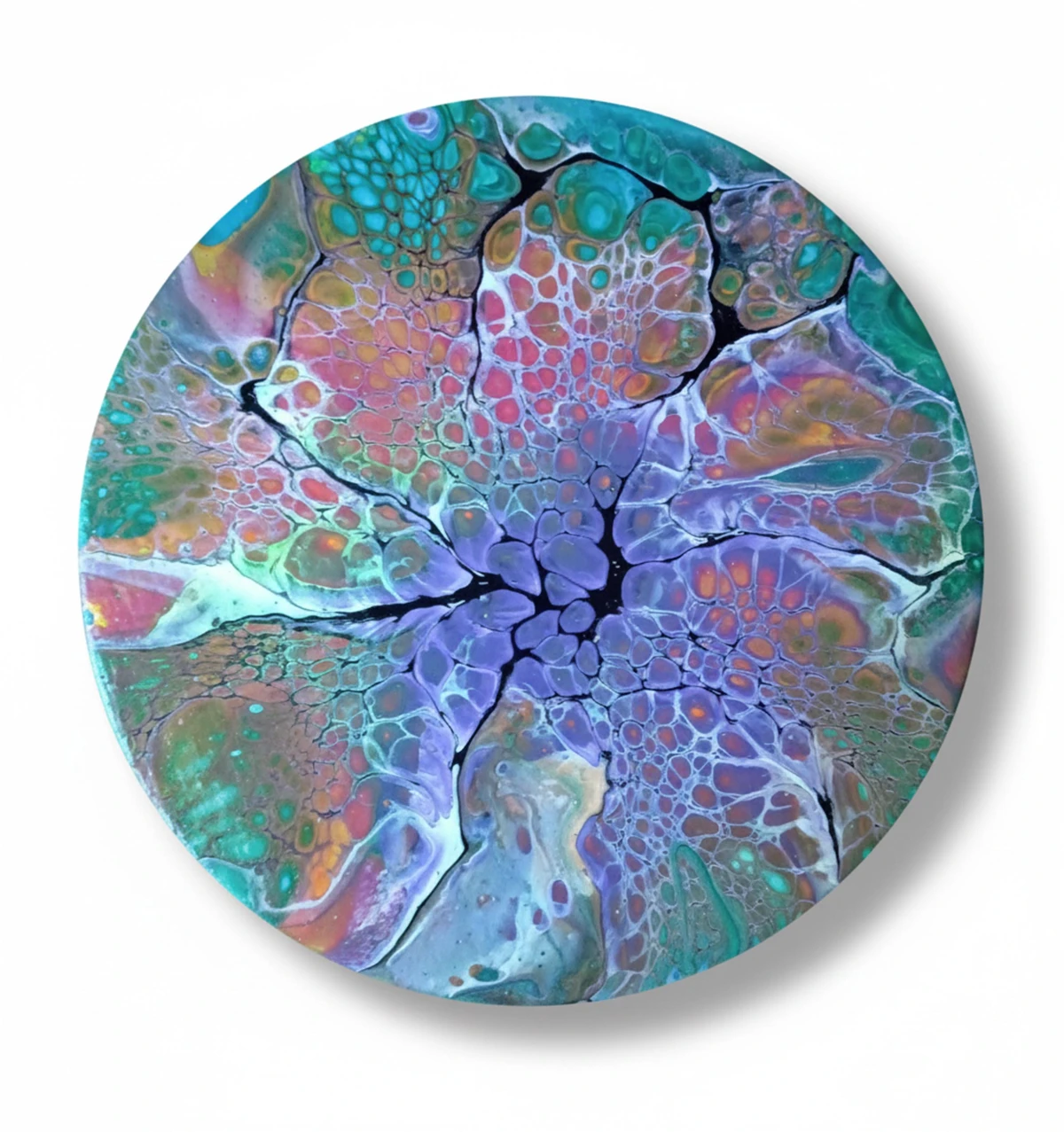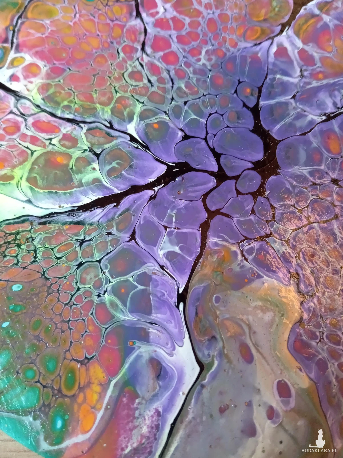 Stworzony techniką acrylic pouring, jest absolutnie wyjątkowy -każdy egzemplarz to niepowtarzalna kompozycja kolorów i wzorów.